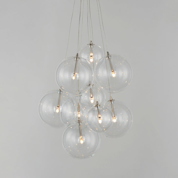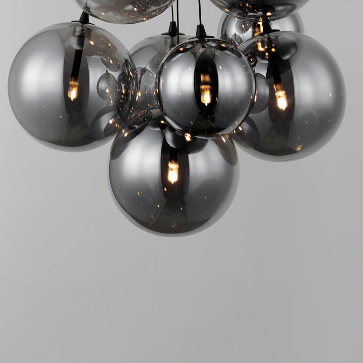 The Burst 9-Light LED Pendant is available in a range of configurations, including 4-Light, 9-Light, and 12-Light clusters. It can be mounted close to the ceiling or extended with included down rods to adjust the height according to your preference. Choose from Clear or Frosted glass globe clusters paired with Satin Nickel frames for a chic transitional design, or opt for the bold Mirror Smoked glass or a varied combination of glass colors, including amber-tinted globes, suspended on a Matte Black frame with thin black cables.
