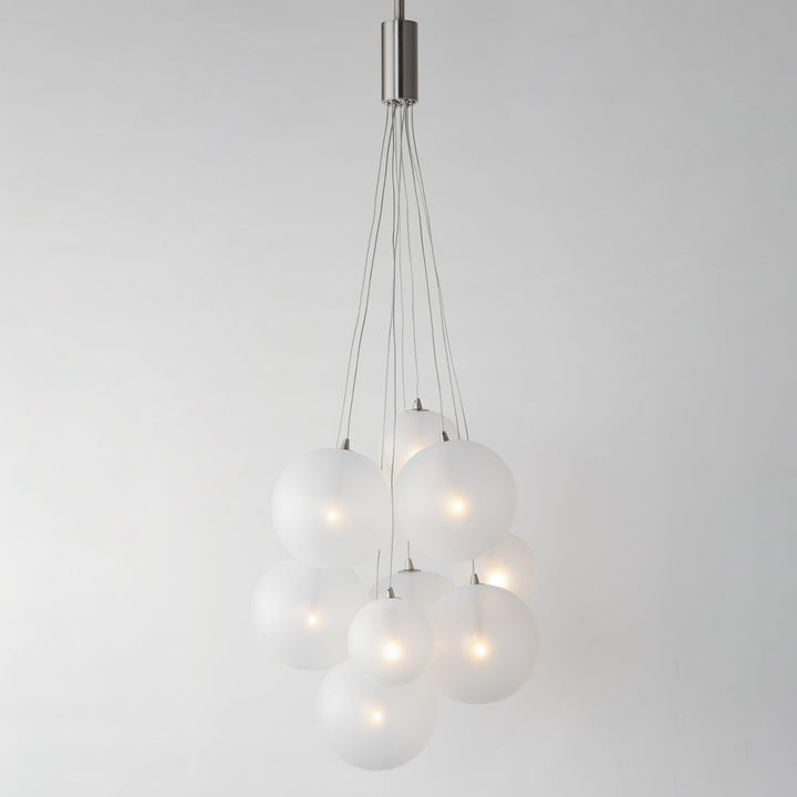 Introducing the Burst 9-Light LED Pendant by Et2, an exquisite and contemporary lighting solution that adds a touch of sophistication and visual interest to any interior space. This captivating pendant features clusters of glass globes in various sizes and colors, suspended from a central point, creating a mesmerizing and dramatic visual effect.