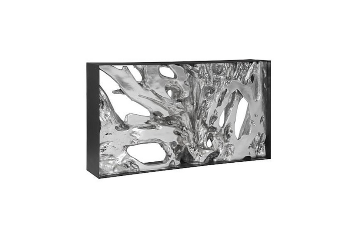 The Cast Root Metal Framed Console Table in Silver Leaf by Phillips Collection is a stunning blend of organic artistry and industrial sophistication. Expertly crafted from resin composite, this table captures the intricate details of natural wood roots, finished in a luxurious silver leaf coating and framed in sleek iron. Designed to make a statement, this console table shines as a modern organic centerpiece in any living room, hallway, or entryway. With both sides beautifully finished, it works seamlessly as a freestanding piece or against a wall.