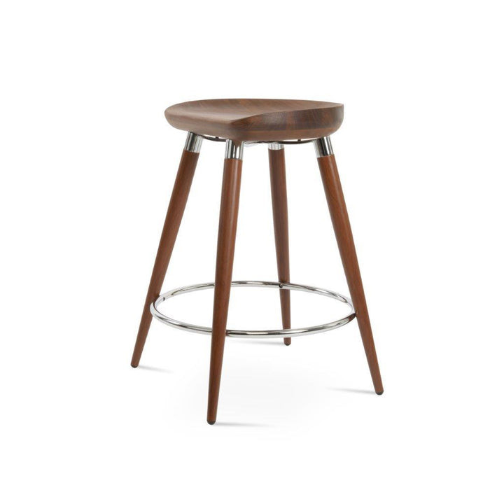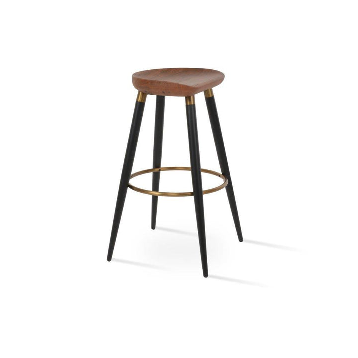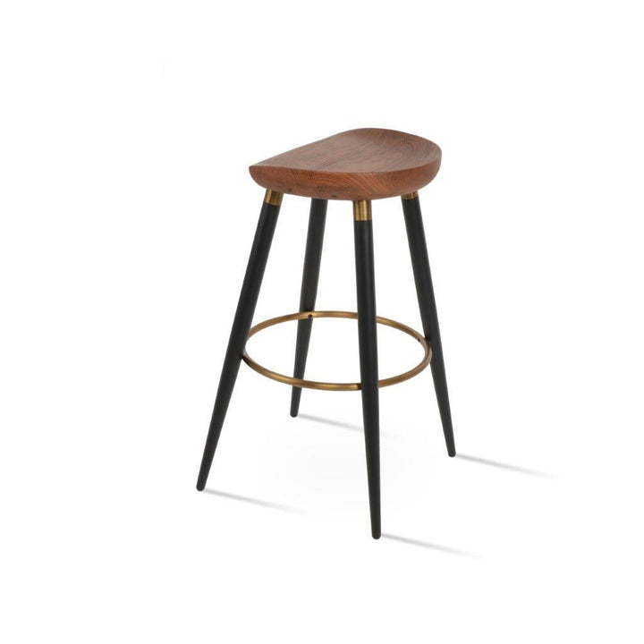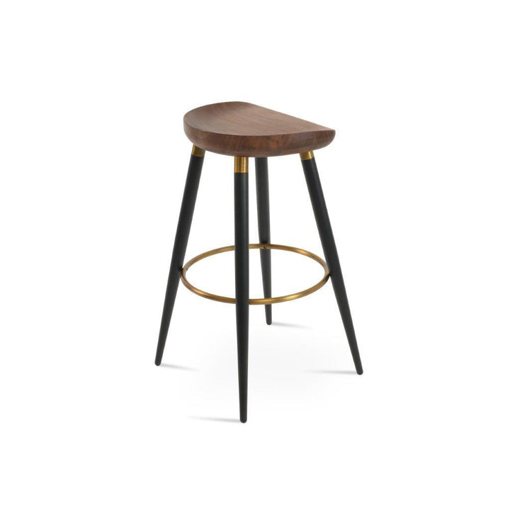 The Cattelan Ana Stool is a unique and stylish counter and bar stool that will add a touch of modern elegance to any space. The stool features a comfortable wood seat that sits on sleek steel legs, which are available in two different finishes: black powder with gold bracelets and footrest, or walnut veneer with stainless steel brushed bracelets and footrest. The stool's modern design is perfect for both residential and commercial use, making it a versatile and practical addition to any home, office, or restaurant. The Cattelan Ana Stool is designed by the Industrial Modern team, known for their innovative and contemporary designs.