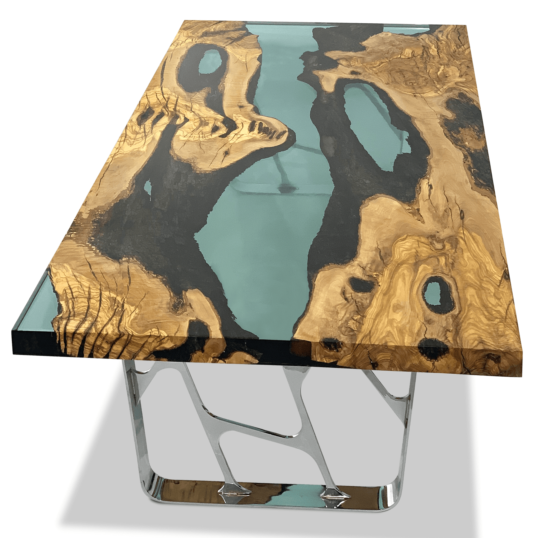 The Arditi collection introduces a stunning and unique Celadon Ombrone Olive Wood Coffee Table that combines wood's natural beauty with resin's durability. The modern design of this dining table is sure to make a statement in any dining room. The combination of resin and wood creates a visually striking contrast that sets it apart from traditional wooden tables. This dining table is durable and easy to maintain and clean. The resin coating protects the wood from scratches and spills, making it perfect for daily use. With its clean lines and sleek design, this dining table from the Arditi collection will be the focal point of any dining area. Upgrade your dining experience with the Arditi resin wood dining table today.