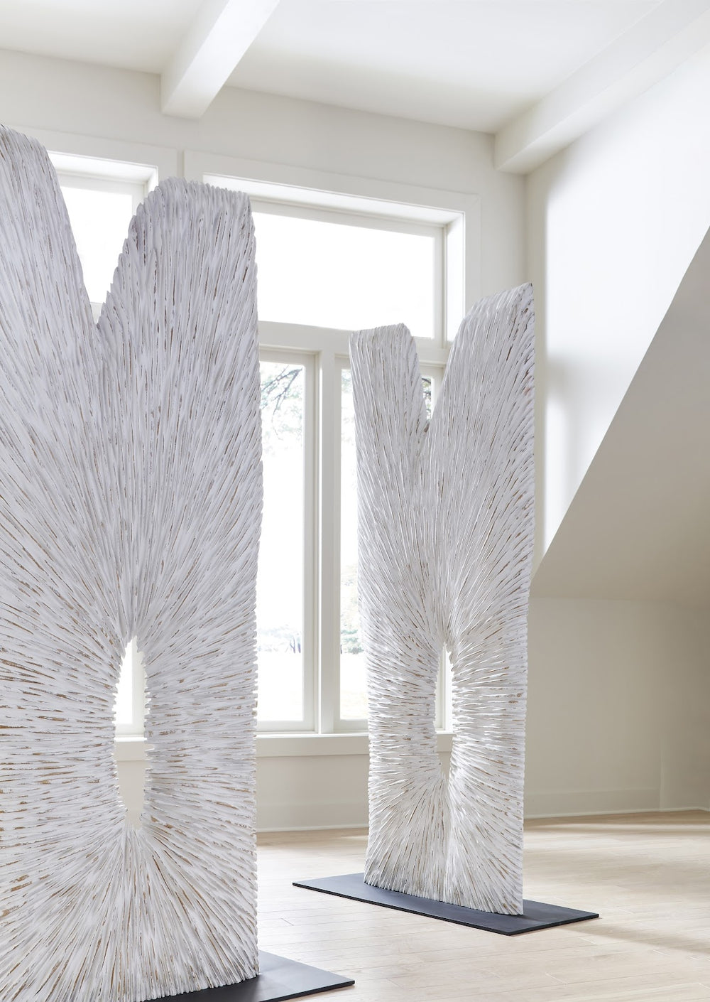 The Chainsaw Sculpture on Stand White/Gold by Phillips Collection is a dynamic piece of art that embodies the essence of modern organic design. Carved in a sunray pattern, this striking sculpture adds a textured, distressed feel that radiates from the center, giving the illusion of motion. Crafted from natural solid wood, each Chainsaw sculpture is unique, with woodgrain variations, natural cracks, and character-filled imperfections that enhance its industrial chic appeal. Mounted on a stand, this sculpture brings a commanding presence to any room, making it the perfect focal point in both contemporary and rustic interiors.