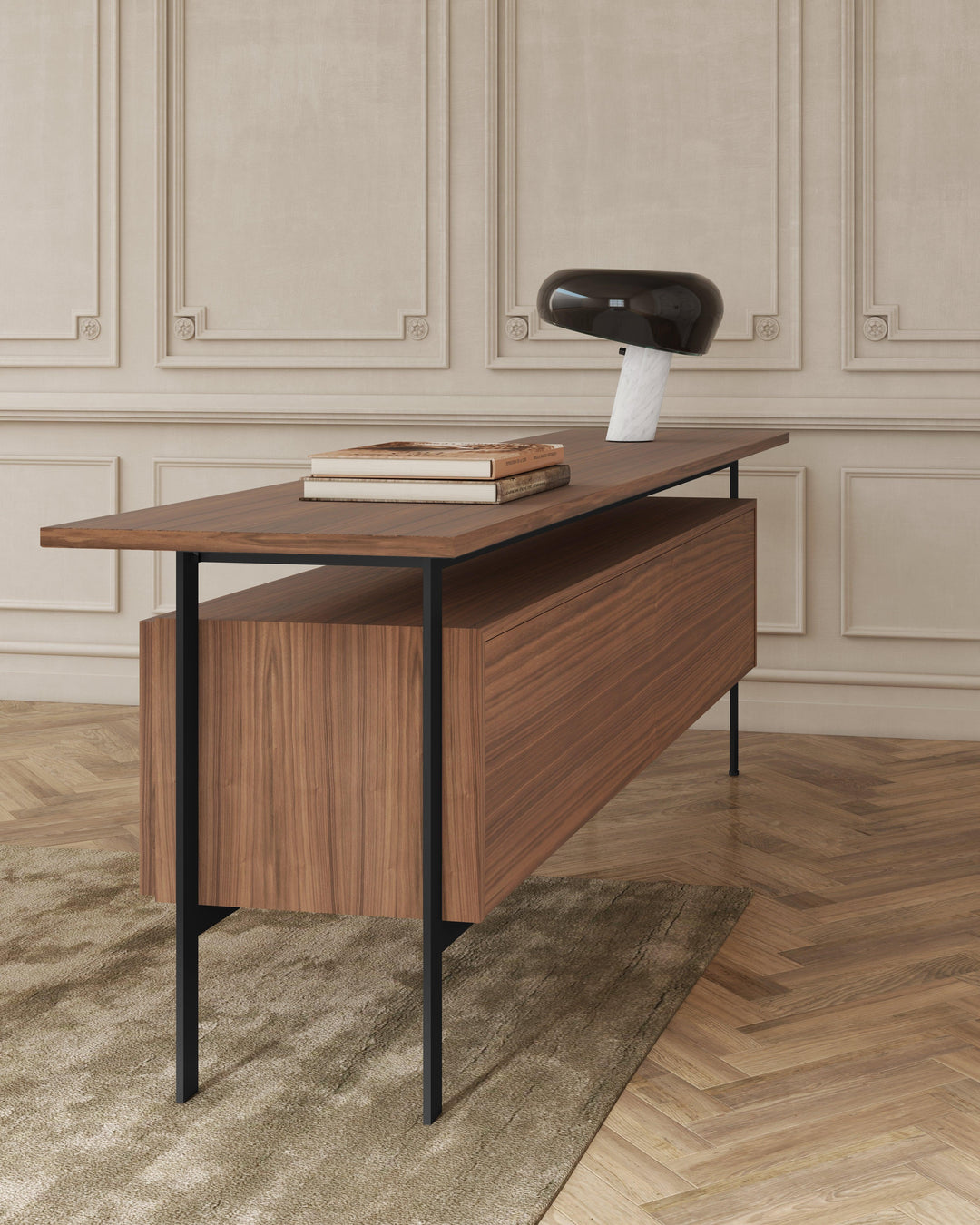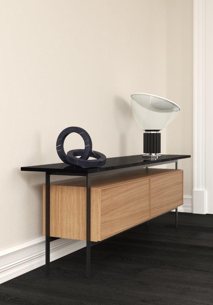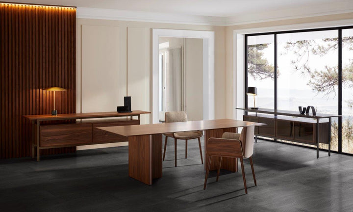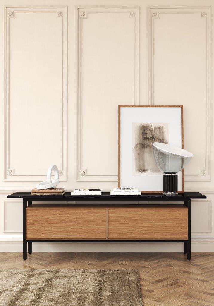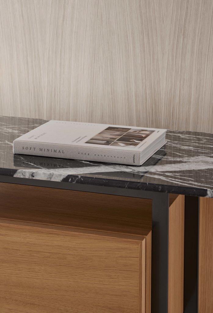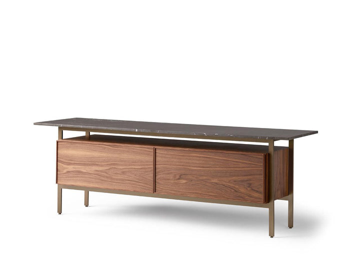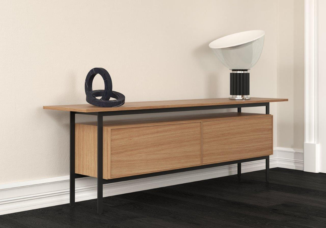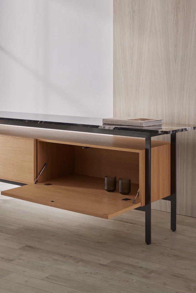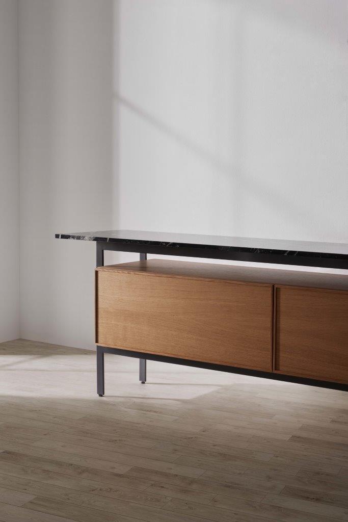 The Chicago Wood Doors Sideboard by Punt Mobles pays homage to the iconic modernist architecture of the mid-century period. Emulating unobstructed repetitive building techniques, this piece exudes a light and floating appearance that feels like a piece of modern architecture in your living space. Crafted with sturdy steel construction, it provides reliable stability, while the floating wooden cabinet imparts an enhanced spatial impression. The tabletop, acting like a floating roof with its extended eaves, completes the minimalistic framework that beautifully combines three natural materials—wood, steel, and stone.