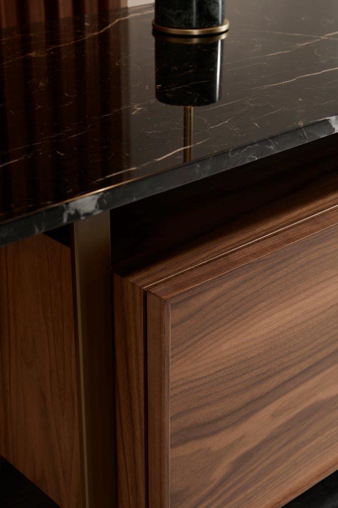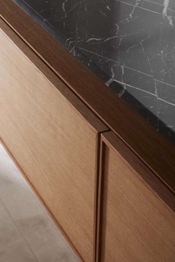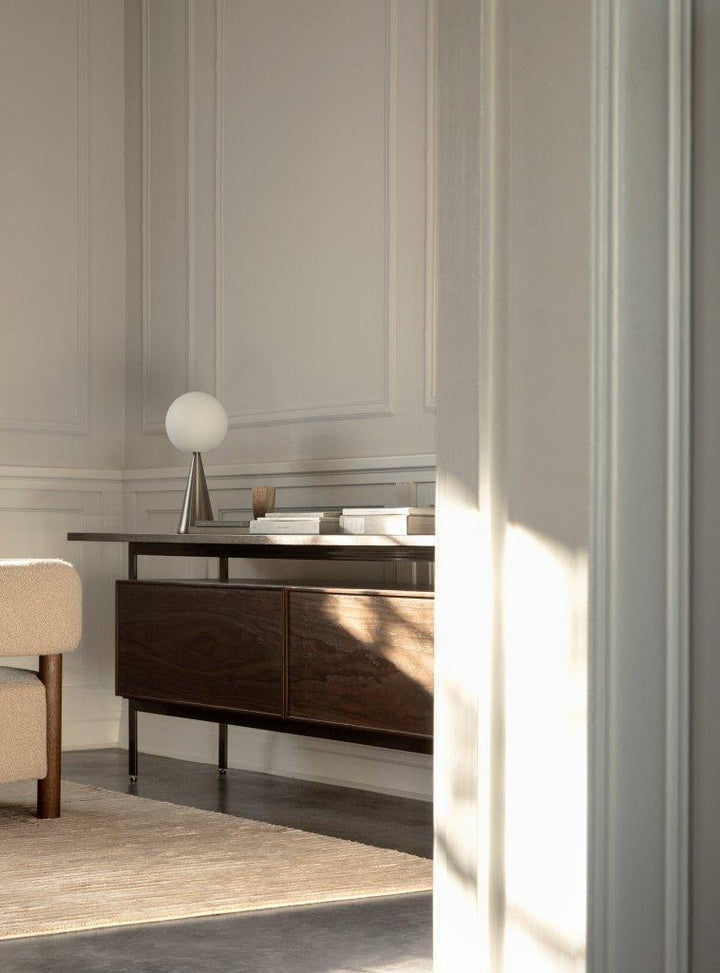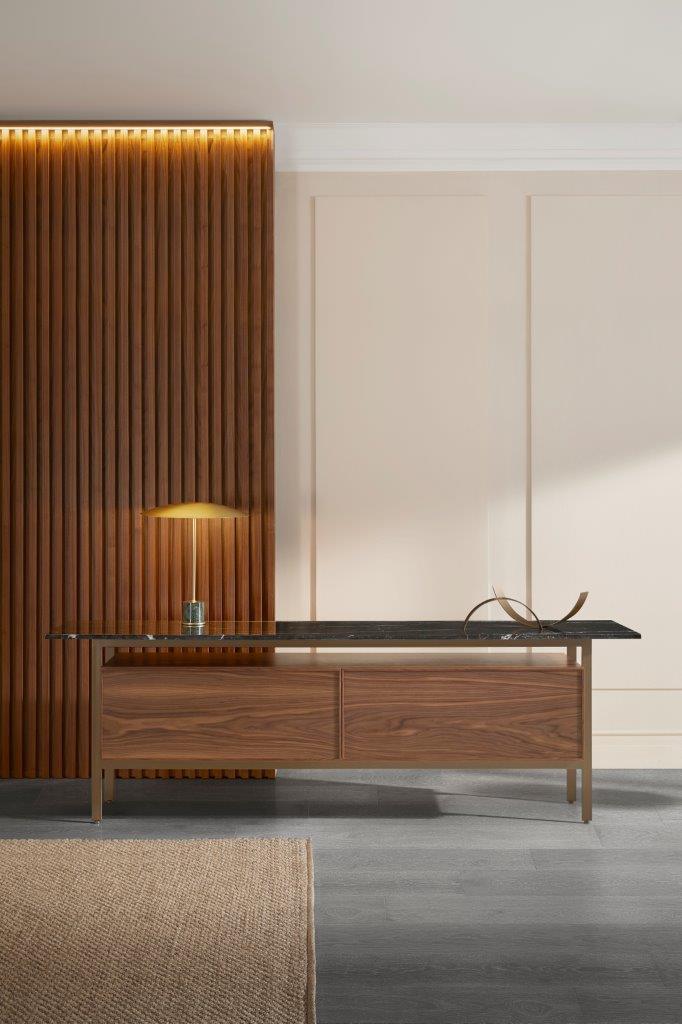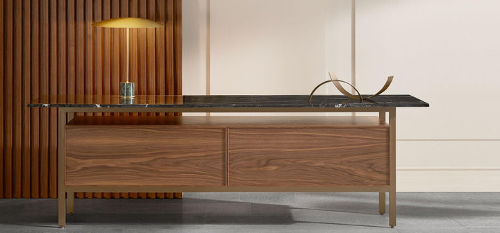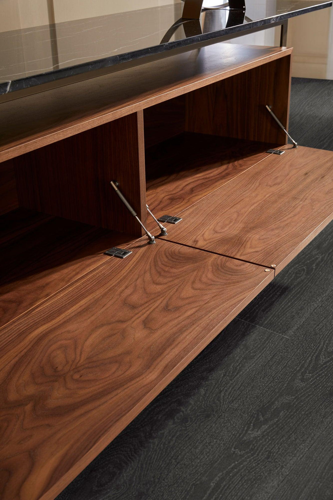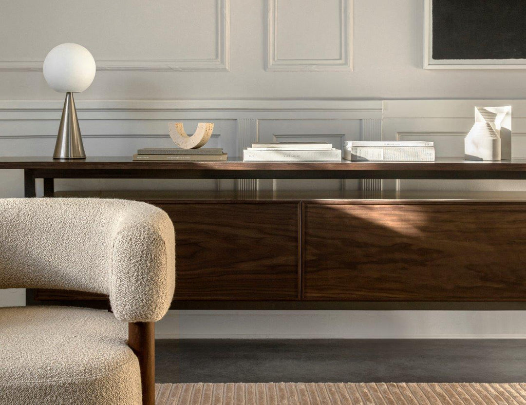 The Chicago Wood Doors Sideboard by Punt Mobles pays homage to the iconic modernist architecture of the mid-century period. Emulating unobstructed repetitive building techniques, this piece exudes a light and floating appearance that feels like a piece of modern architecture in your living space. Crafted with sturdy steel construction, it provides reliable stability, while the floating wooden cabinet imparts an enhanced spatial impression. The tabletop, acting like a floating roof with its extended eaves, completes the minimalistic framework that beautifully combines three natural materials—wood, steel, and stone.
