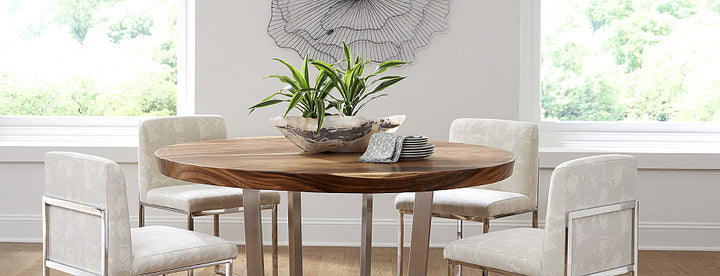 The Chuleta Round Dining Table on Stainless Steel Base, Natural by Phillips Collection seamlessly blends natural beauty with modern sophistication. Crafted from reclaimed chamcha wood, this table showcases the organic texture and unique imperfections of natural wood grain, making every piece one-of-a-kind. Supported by a brushed stainless steel base, this dining table offers a stunning contrast of rustic charm and sleek contemporary design. Perfect for a variety of styles, from modern farmhouse to industrial chic, this table serves as an elegant focal point in any dining space.