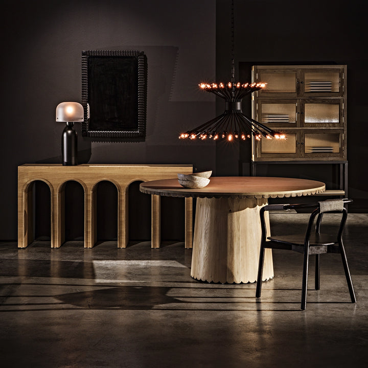 The Column Dining Table, Black Steel by Noir, is a bold statement of industrial elegance. Designed with multiple tapered square legs that create a striking pleated effect, this 44" round table exudes modern sophistication. Crafted from black-finished industrial steel, it is a testament to both durability and style. The handcrafted nature of this piece, including weld marks and tonal variances, adds unique character to every table.