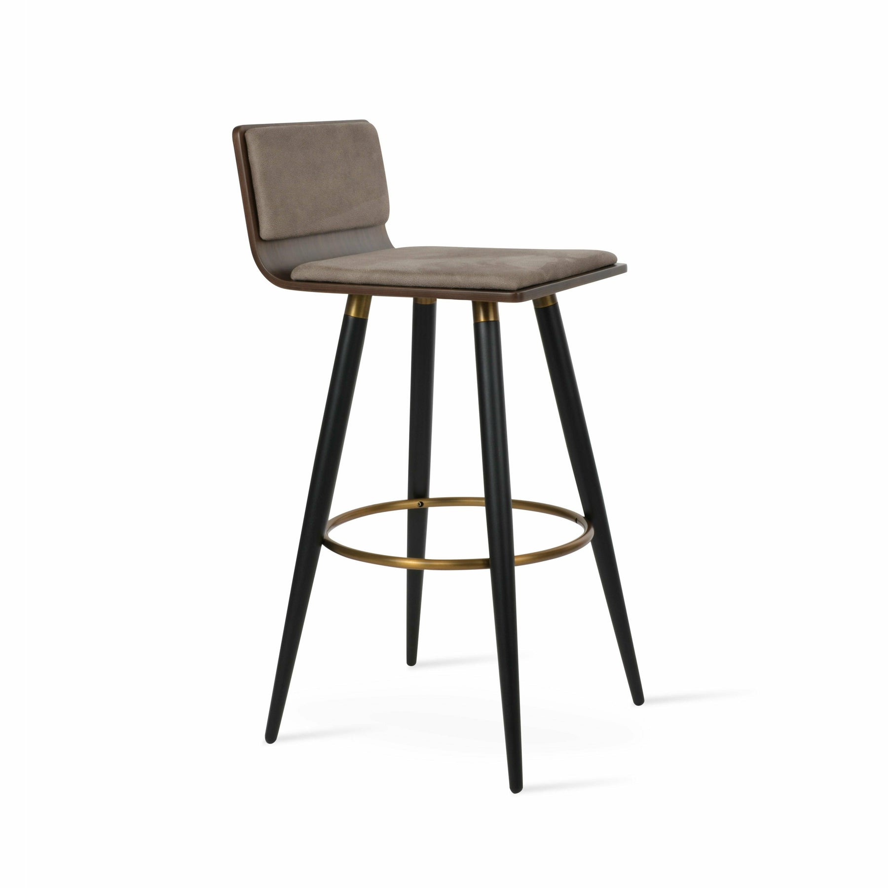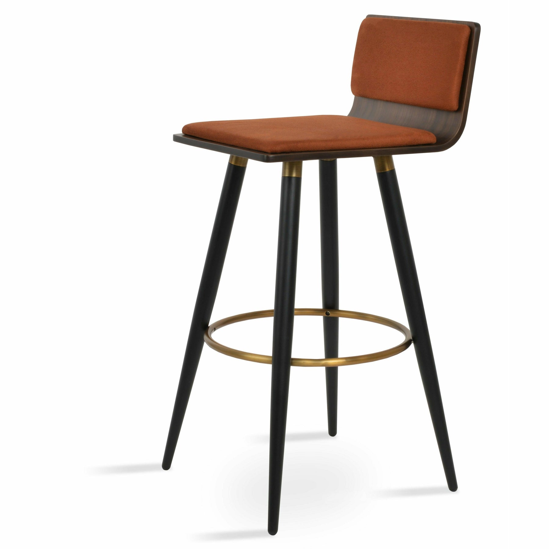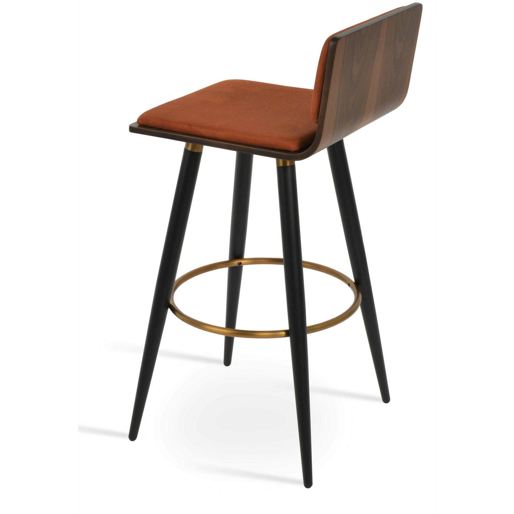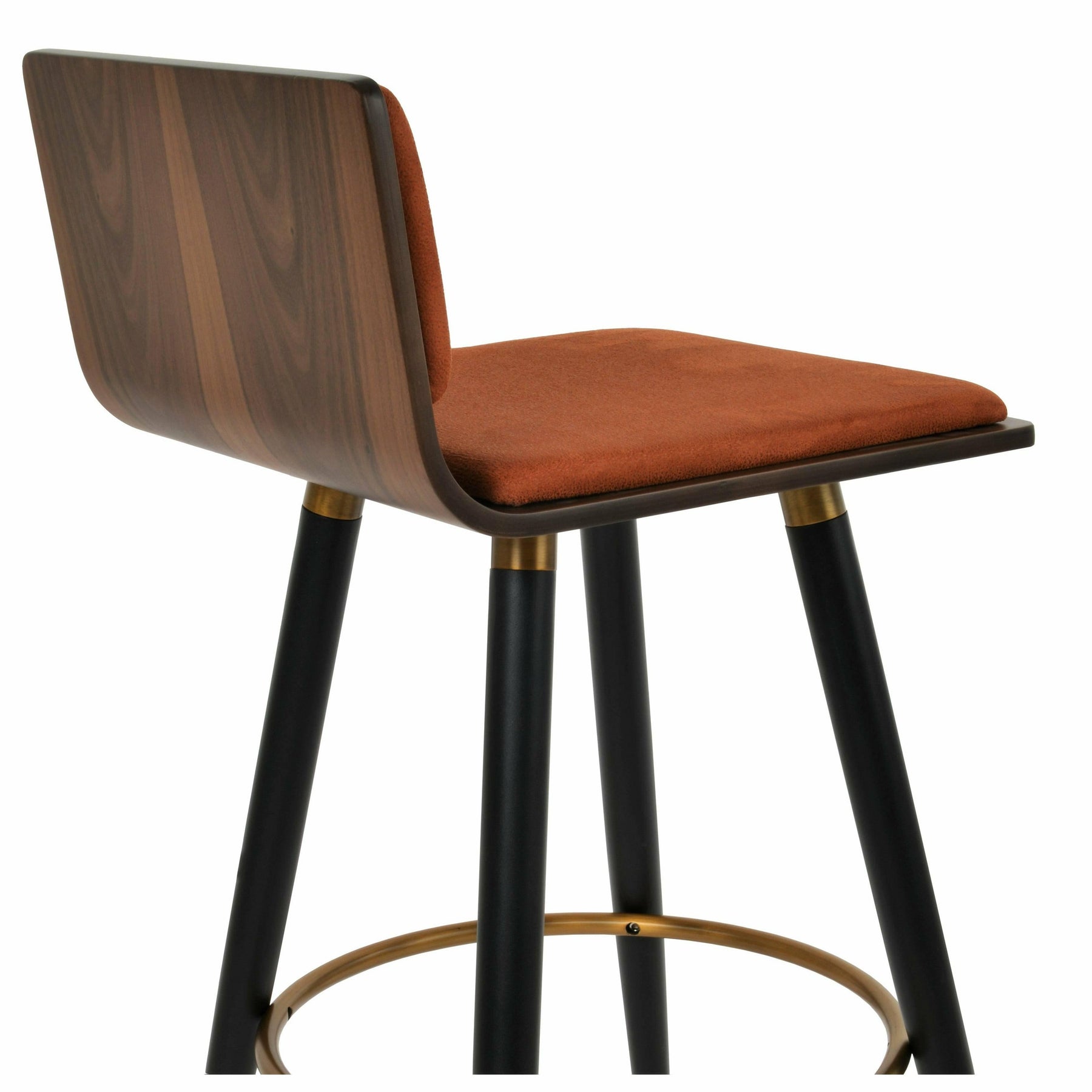 Corona Ana is a contemporary stool with a comfortable upholstered seat and backrest on steel legs available in black powder with gold bracelets and footrest, and walnut veneer with stainless steel brushed bracelets and footrest. The stool is suitable for both residential and commercial use. Corona Ana Stool is designed by Namik Ozkaynak.