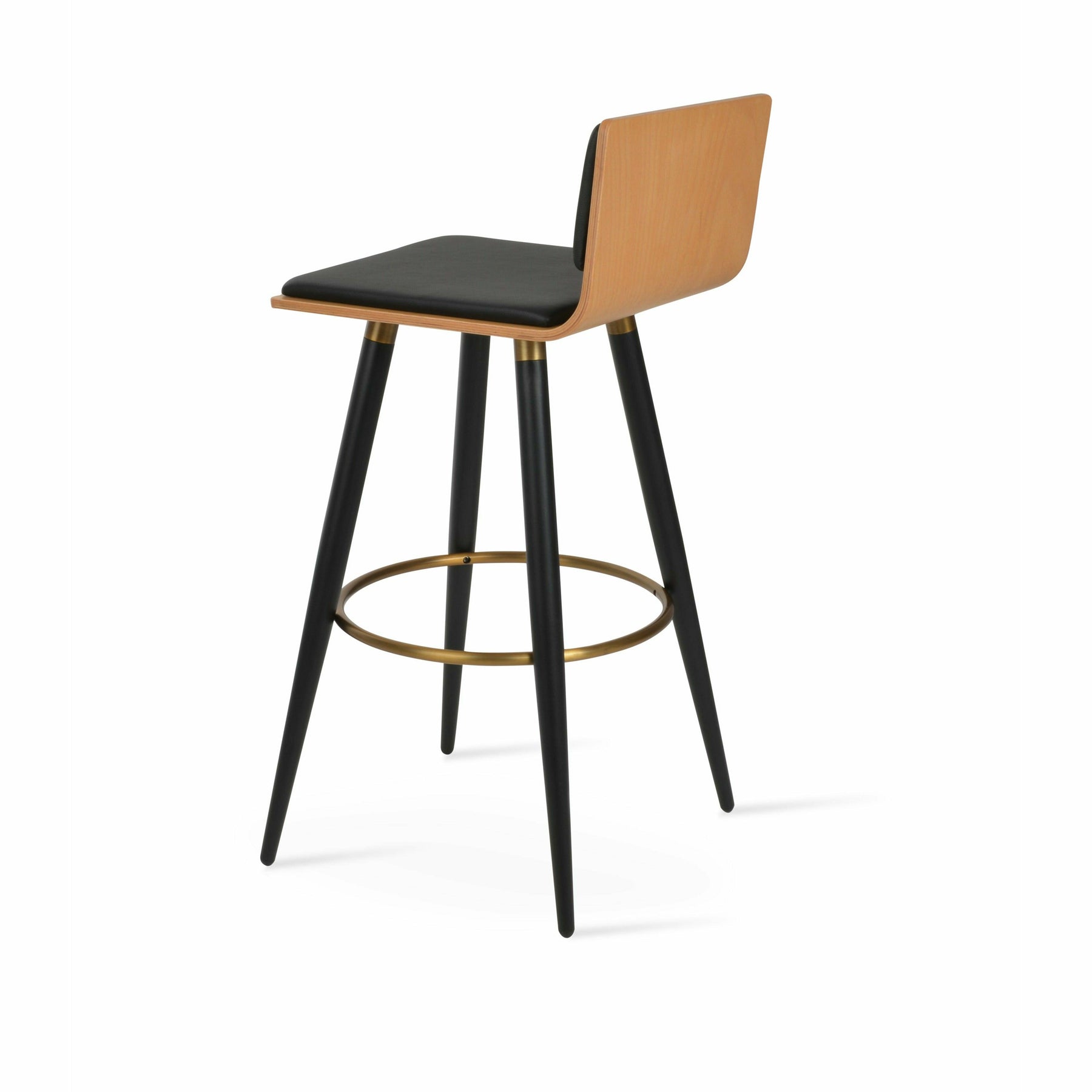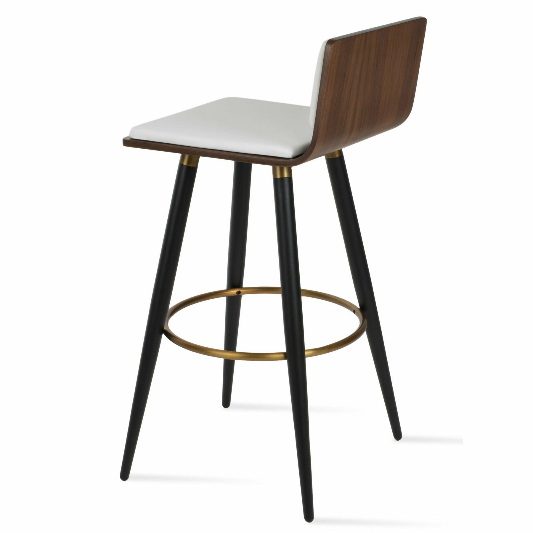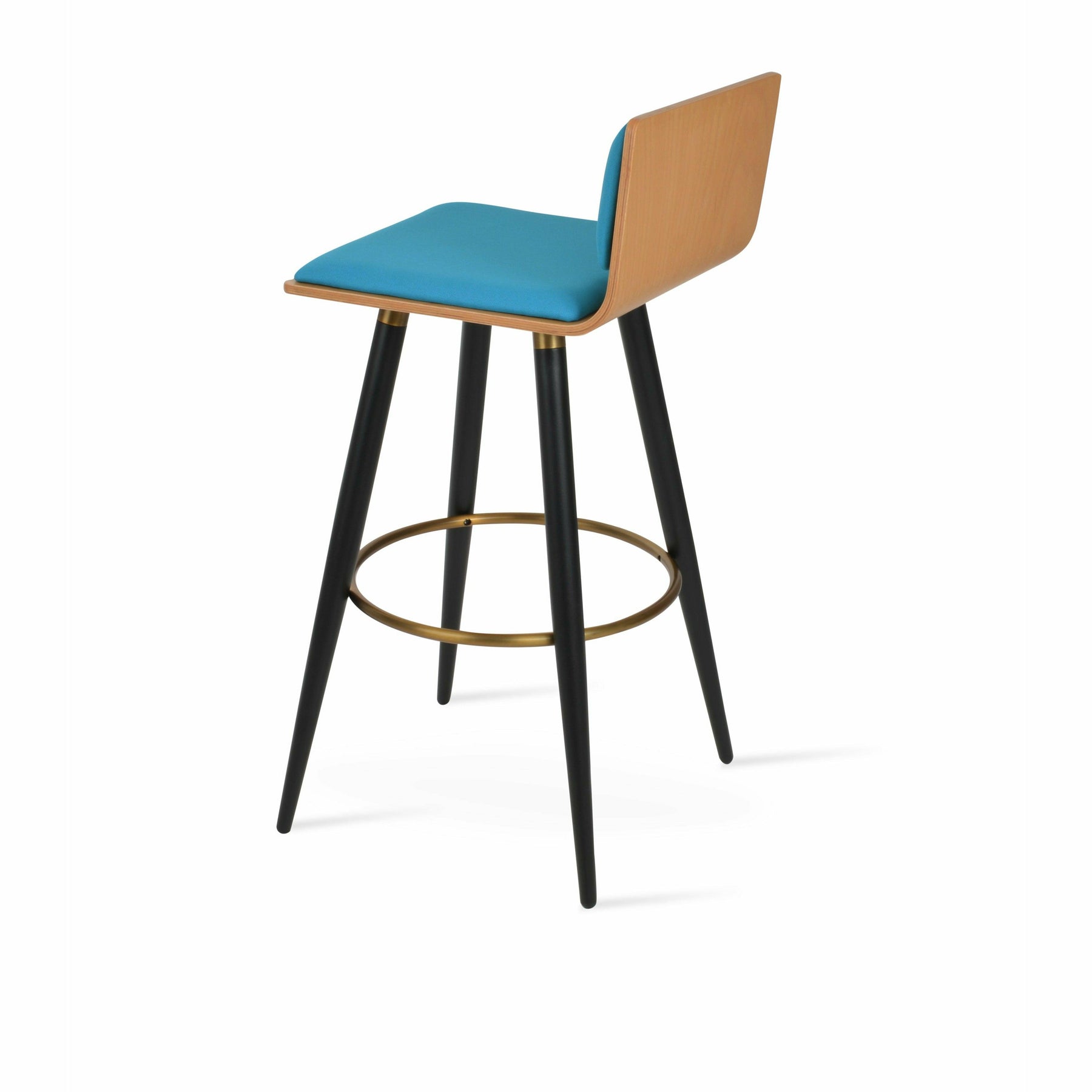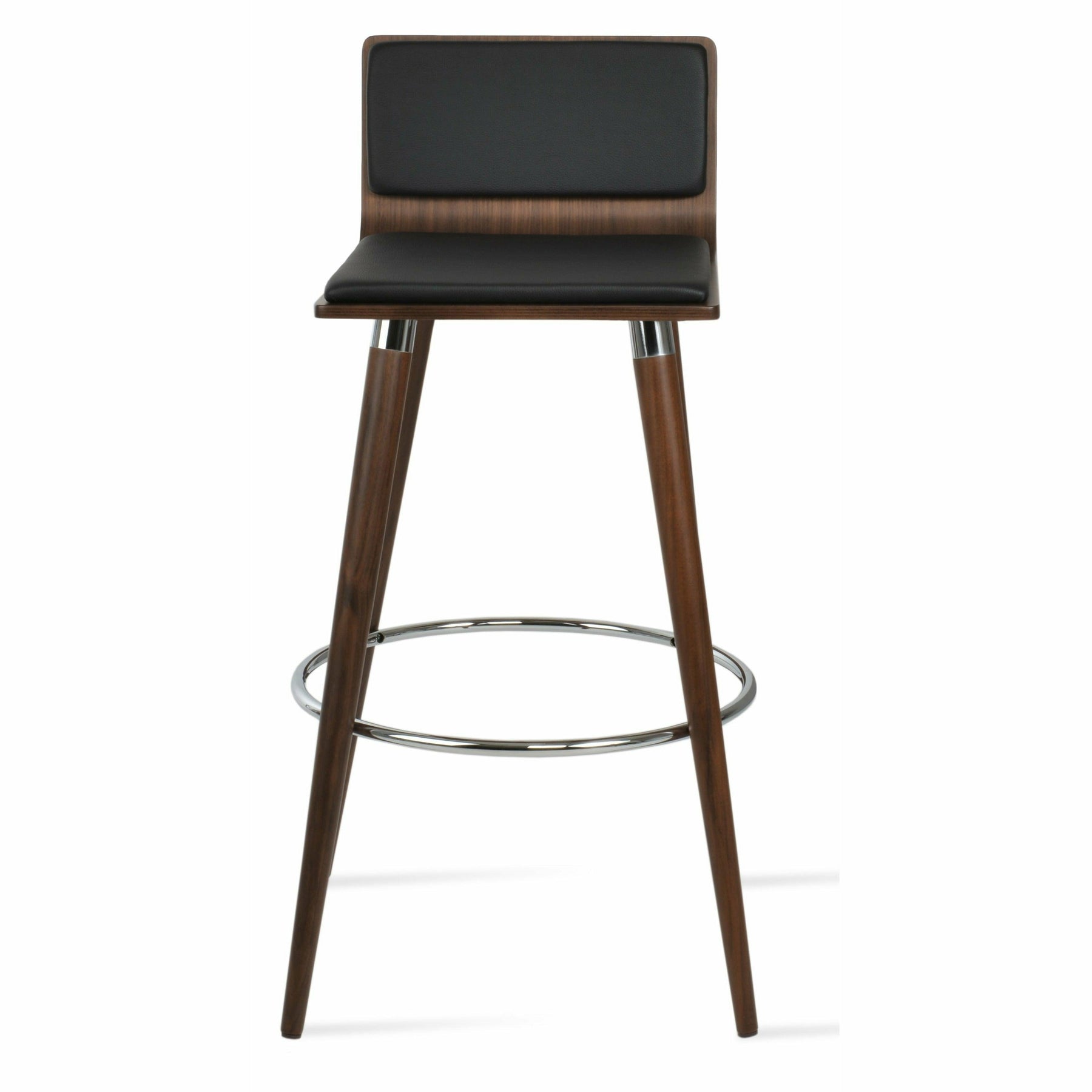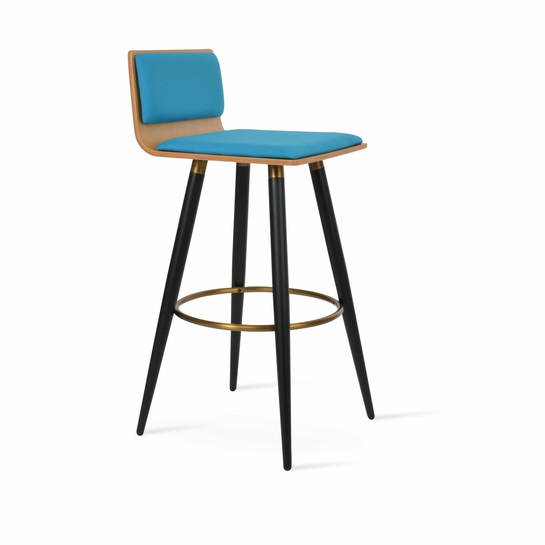 Corona Ana is a contemporary stool with a comfortable upholstered seat and backrest on steel legs available in black powder with gold bracelets and footrest, and walnut veneer with stainless steel brushed bracelets and footrest. The stool is suitable for both residential and commercial use. Corona Ana Stool is designed by Namik Ozkaynak.