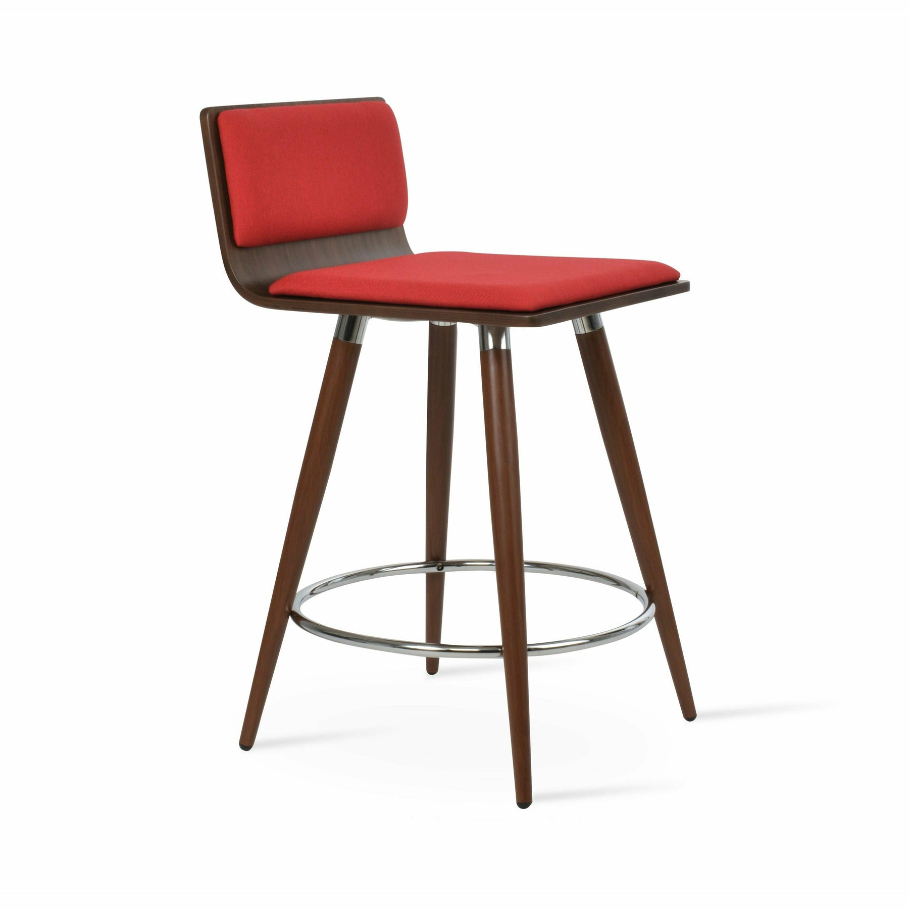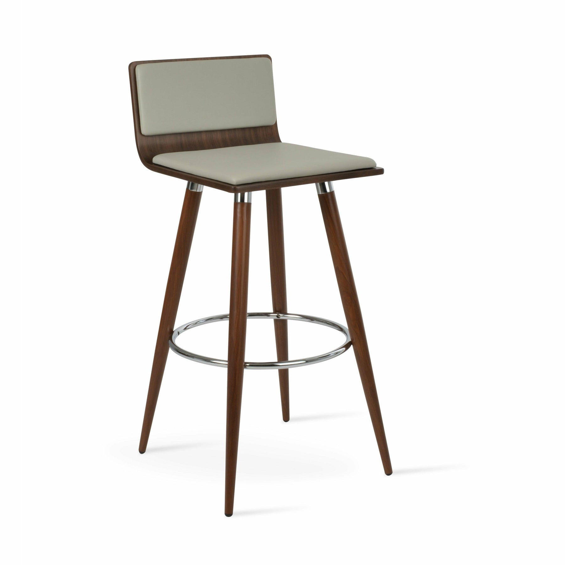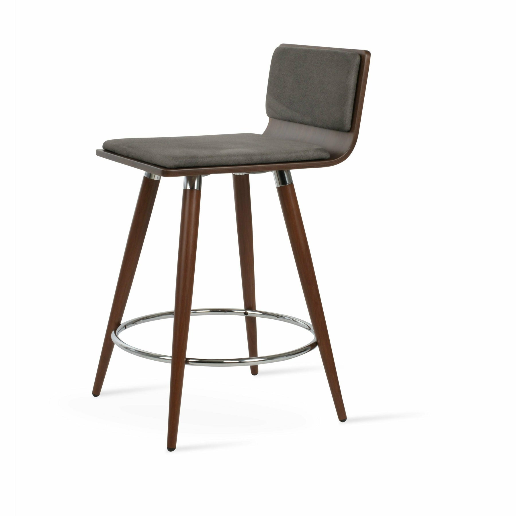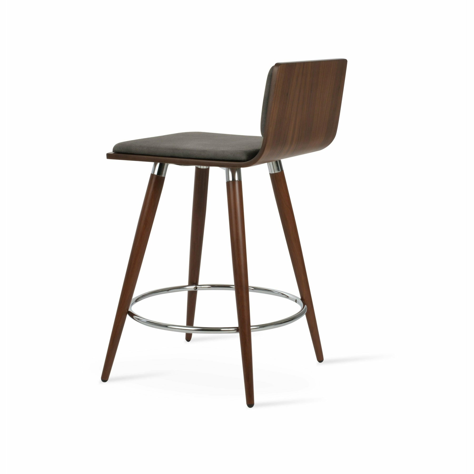 Corona Ana is a contemporary stool with a comfortable upholstered seat and backrest on steel legs available in black powder with gold bracelets and footrest, and walnut veneer with stainless steel brushed bracelets and footrest. The stool is suitable for both residential and commercial use. Corona Ana Stool is designed by Namik Ozkaynak.