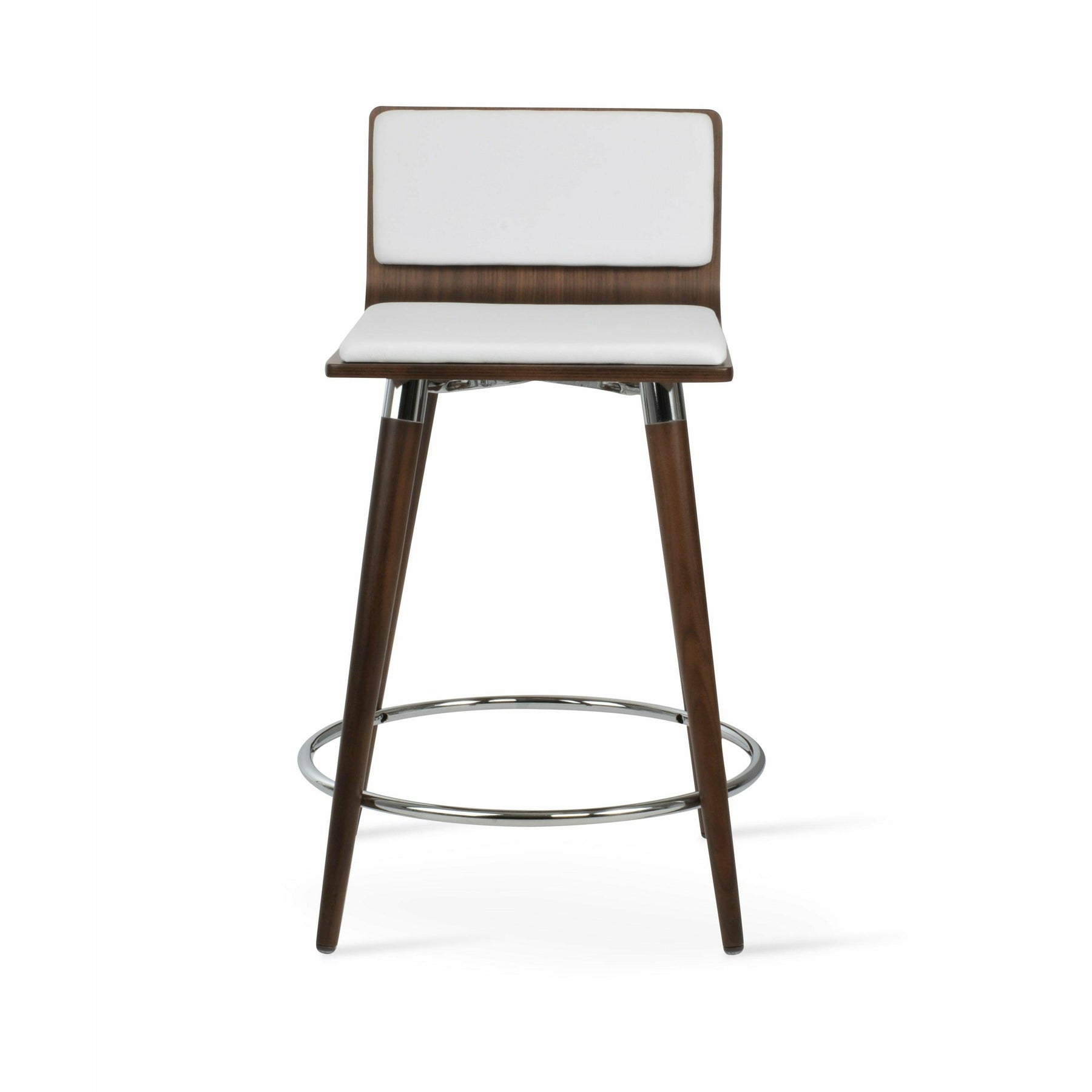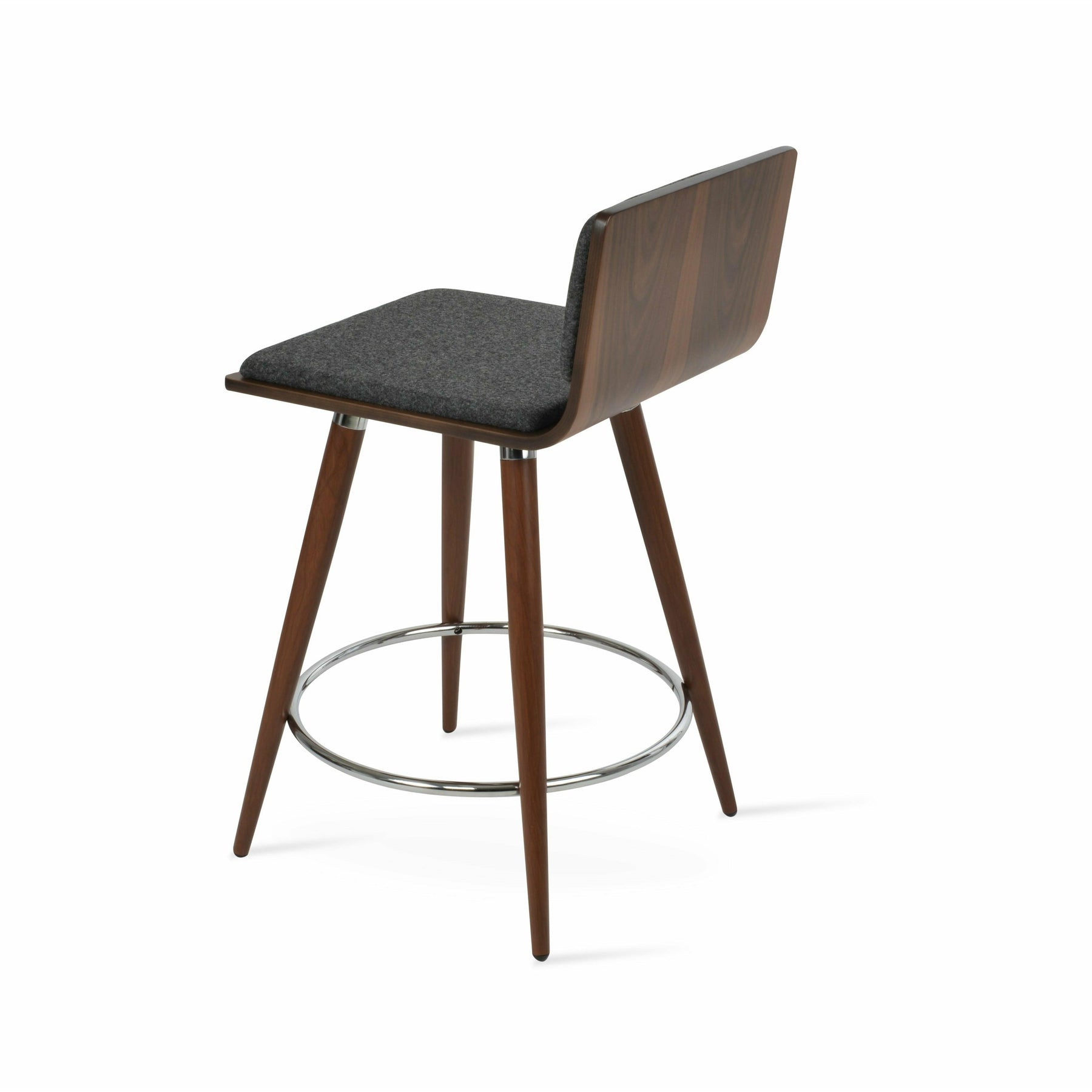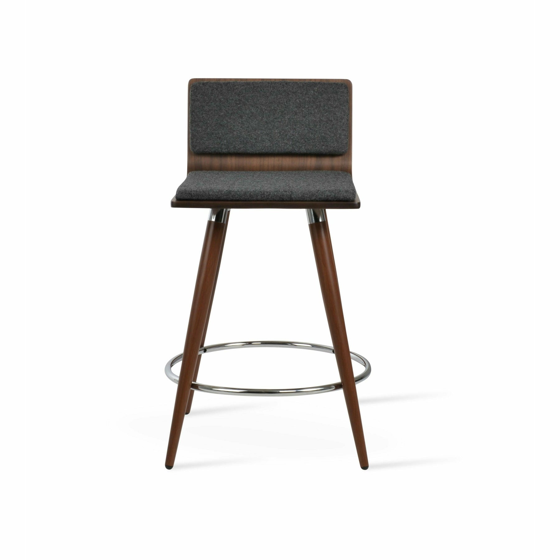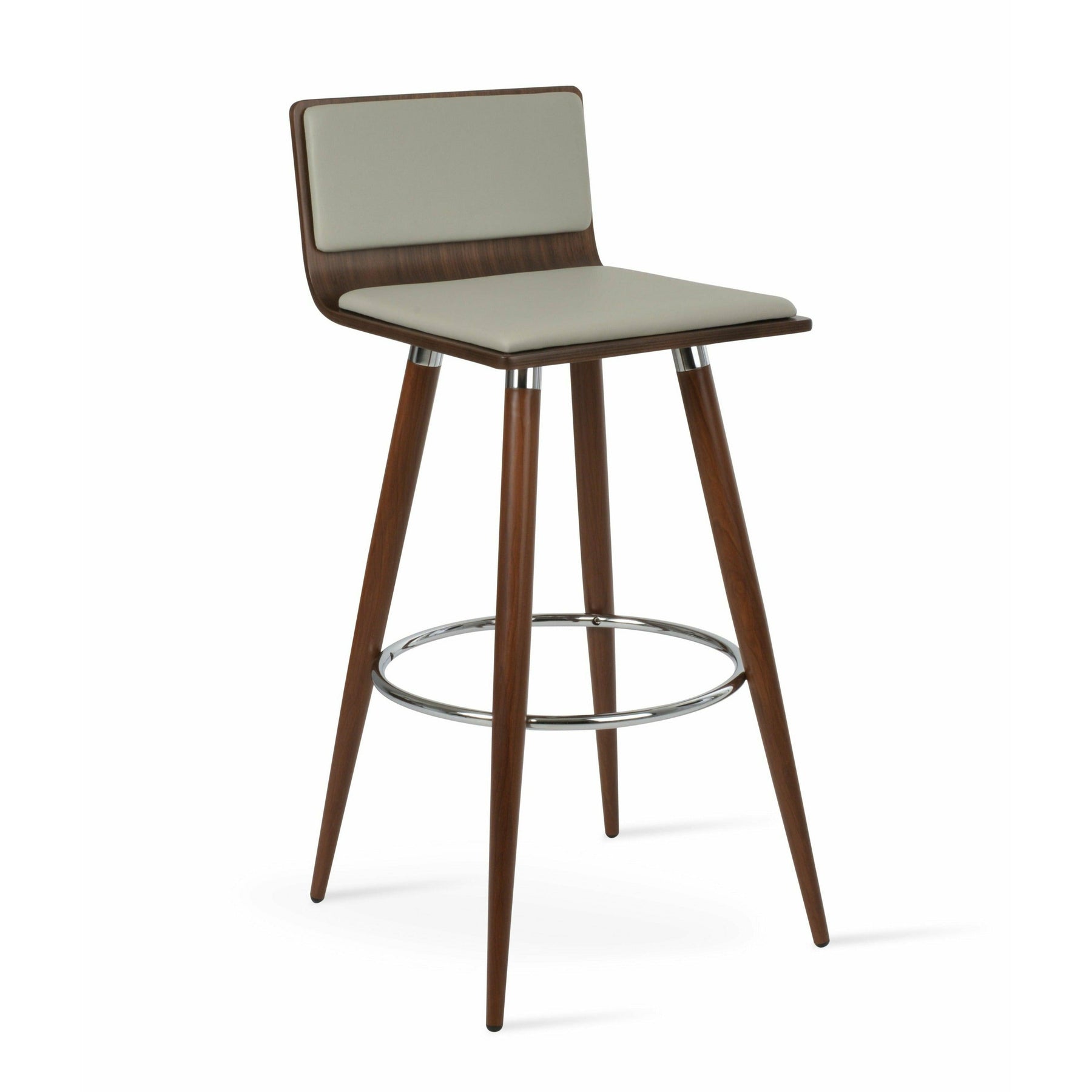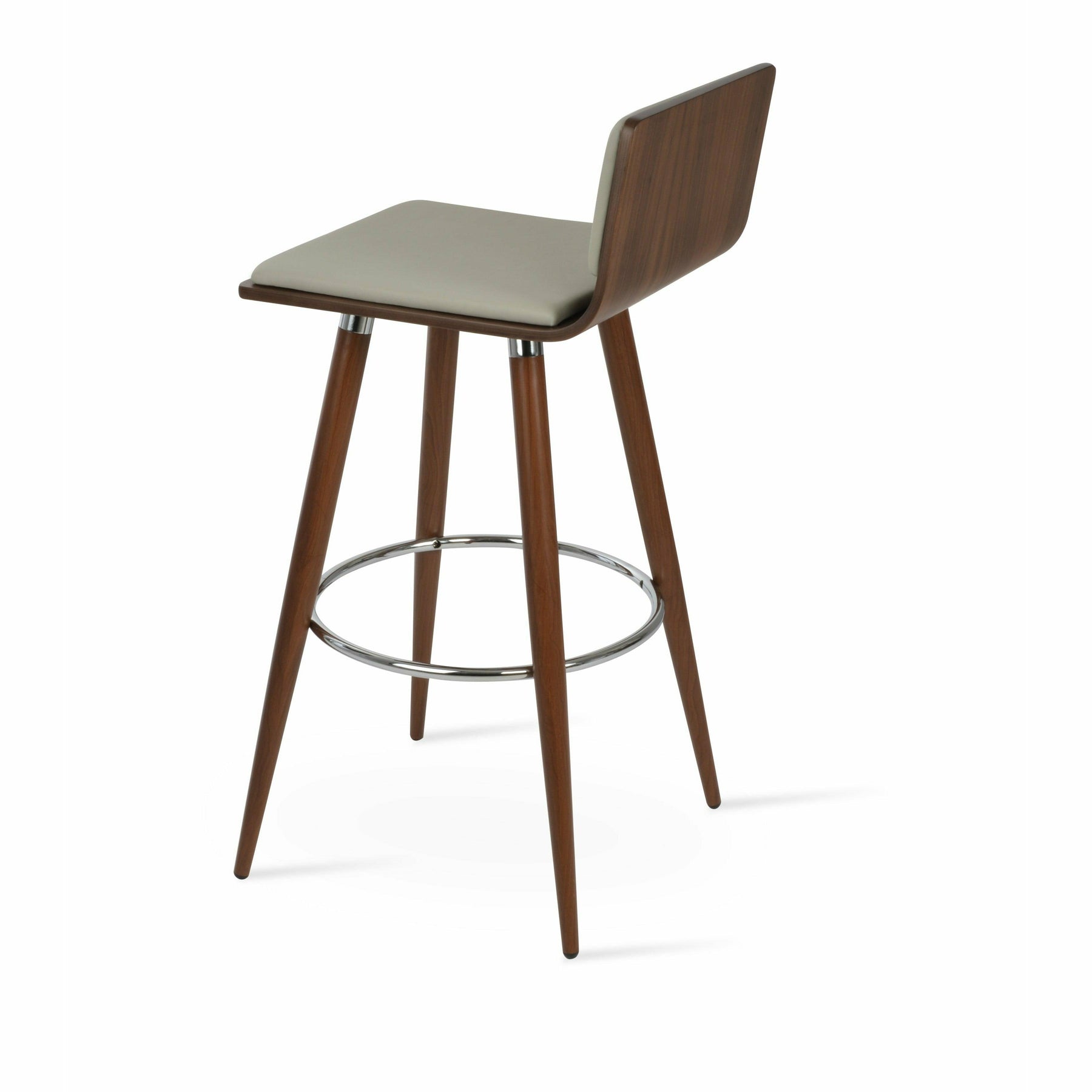 Corona Ana is a contemporary stool with a comfortable upholstered seat and backrest on steel legs available in black powder with gold bracelets and footrest, and walnut veneer with stainless steel brushed bracelets and footrest. The stool is suitable for both residential and commercial use. Corona Ana Stool is designed by Namik Ozkaynak.