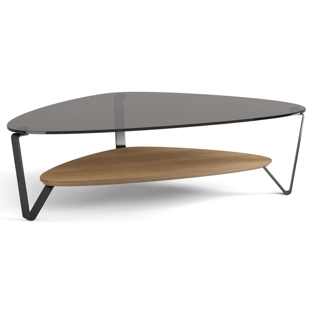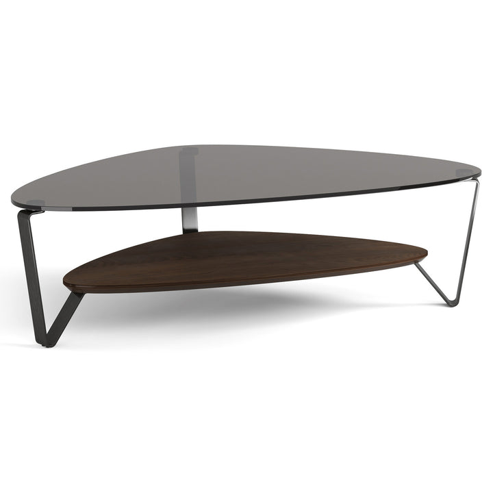 The Dino 1363 Large Cocktail Table by BDI offers a soft, triangular shape perfect for modern interiors, especially suited for use with sectional sofas. With a grey-tinted tempered glass top and a floating lower shelf finished in stone-shaded lacquer, this versatile table is both functional and stylish. The brushed carbon legs and open storage make it ideal for contemporary spaces.