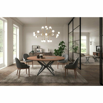 Ozzio Italia's DNA dining table is a gorgeous focal point for a contemporary dining area. As the name suggests, the base resembles DNA strands for a unique, brainy touch. The geometric base also stands out against the inviting round top, holding it up with ease. For an appealing element, there's a lazy susan at the center of the table that swivels easily, which is an ideal feature for dinner parties and buffet-style meals. The contrasting finishes on the top and lazy Susan stand out against one another for a chic touch. Complete this stunning look with an array of Ozzio dining chairs. The DNA dining table is easily customized, manufactured in Italy, and designed by Andrea Lucatello. The top comes in wood finishes, the lazy Susan comes in ceramic options, and the base comes in metal finishes.