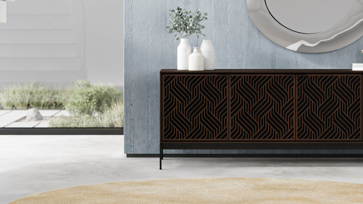 The BDI Elements 8709 Weave Media Cabinet with Console Base is a fusion of organic design and cutting-edge functionality, perfect for modern living spaces. The cabinet features the Weave door pattern, bringing a textured and natural aesthetic to any room. Designed to support larger TVs, it provides ample space for your media components, while the console base adds height and prominence to your living room. Acoustically transparent doors, hidden wheels, and adjustable shelves ensure that your tech setup remains organized and easy to manage. With soft-close doors and precision-engineered details, the Elements 8709 Weave Media Cabinet is a stylish and practical addition to your home.