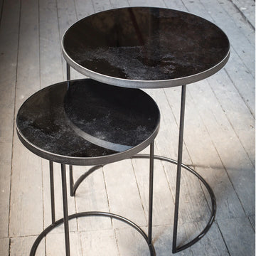 An accent piece that speaks volumes, the Nesting Side Table Set by Ethnicraft, designed by Dawn Sweitzer, is given a unique twist with a heavy aged mirror surface. The versatile set finds its place in any space, whether perched beside the sofa, sitting next to your bed, or as a complementary piece to a work of art. Its adaptability offers many possibilities, making it a perfect addition to any room.