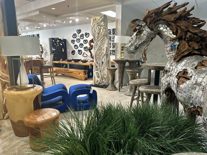The Entwined Sculpture on Base Bleached by Phillips Collection is a remarkable statement piece that embodies the beauty of nature's design. Carved from natural teak wood, this sculpture showcases intertwined, ribbon-like forms that twist and turn with organic fluidity. Finished in a bleached tone, the sculpture radiates a soft, neutral aesthetic that perfectly complements modern, minimalist interiors. This work of art stands tall, making it a stunning focal point for large spaces.