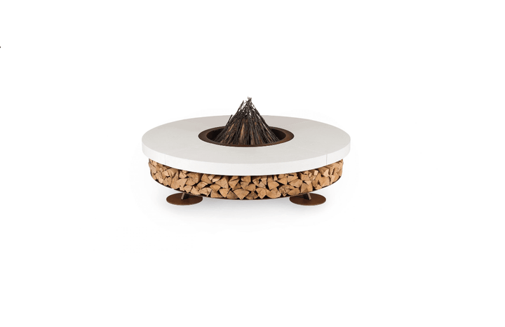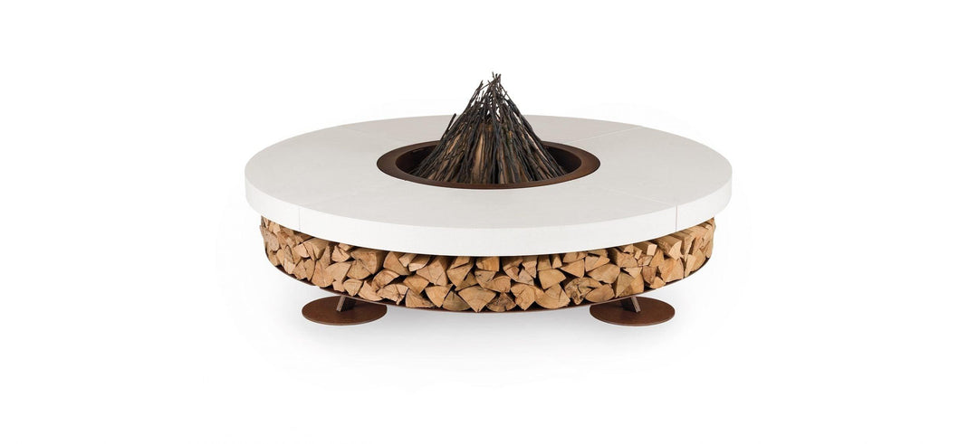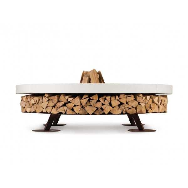 Constructed with a robust steel frame and majestic concrete, Ercole Concrete stands as a solid sculpture in any outdoor setting. The steel components are oxidized and treated to resist corrosion, while the concrete is sealed to prevent surface dust. This design not only serves as a powerful heat source but also doubles as stylish log storage, enhancing its functionality and aesthetic appeal.