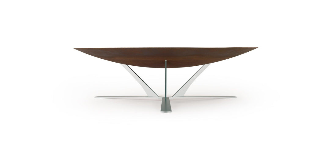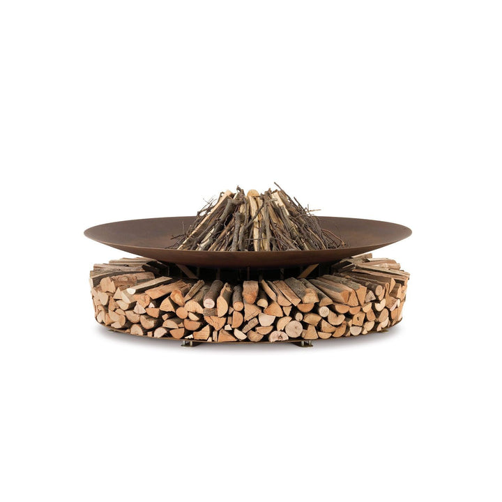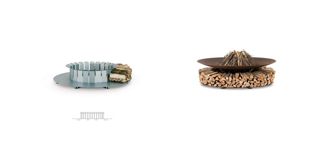 Crafted with a steel structure and sporting an oxidized finish, the Fuocolo is designed to endure the elements while aging gracefully. The fire pit's substantial form is balanced by its functionality, featuring a convenient tray that simplifies wood storage and management, enhancing the overall user experience.