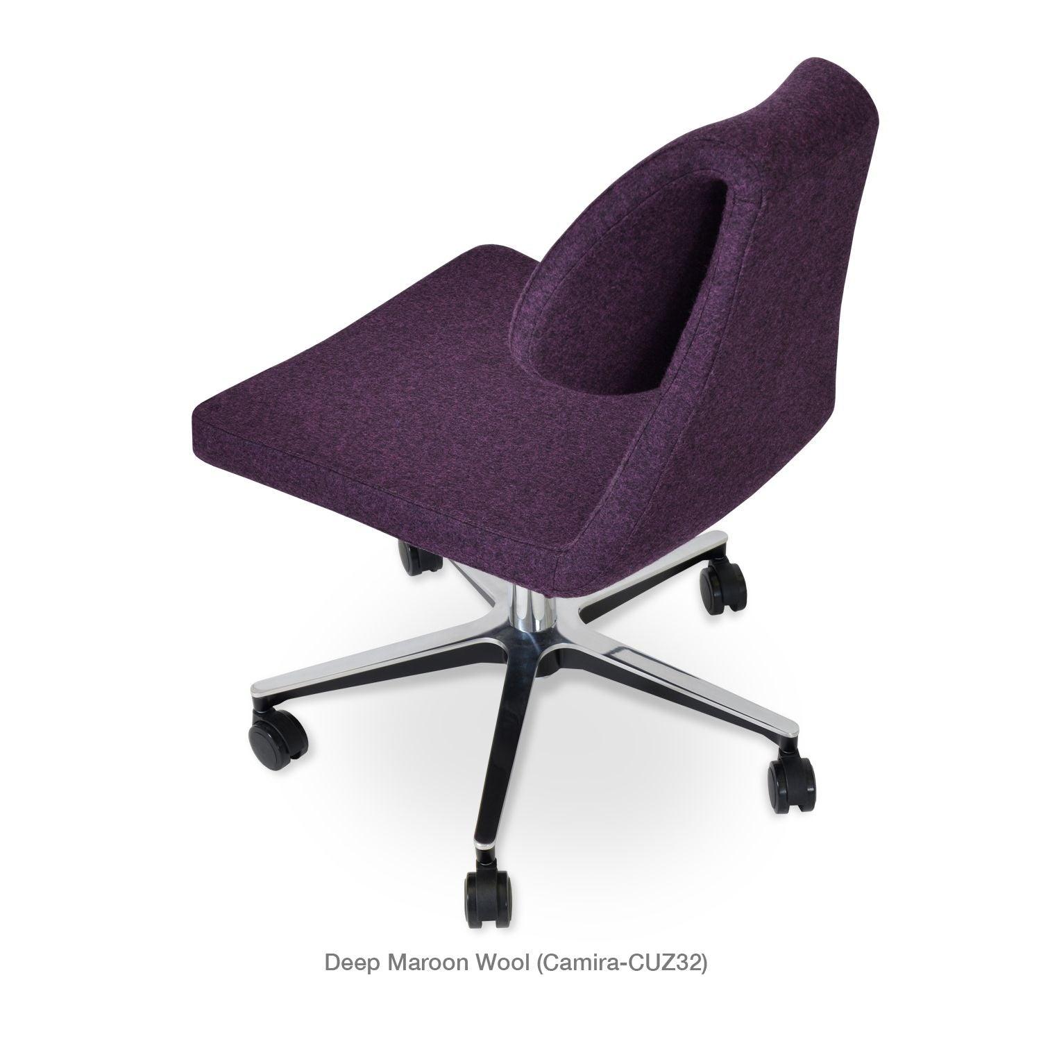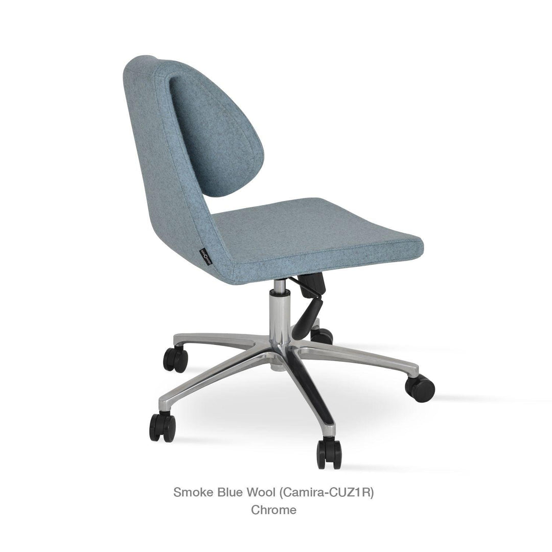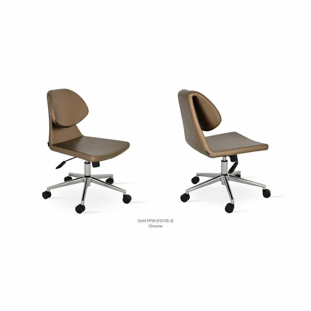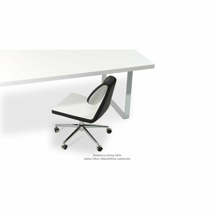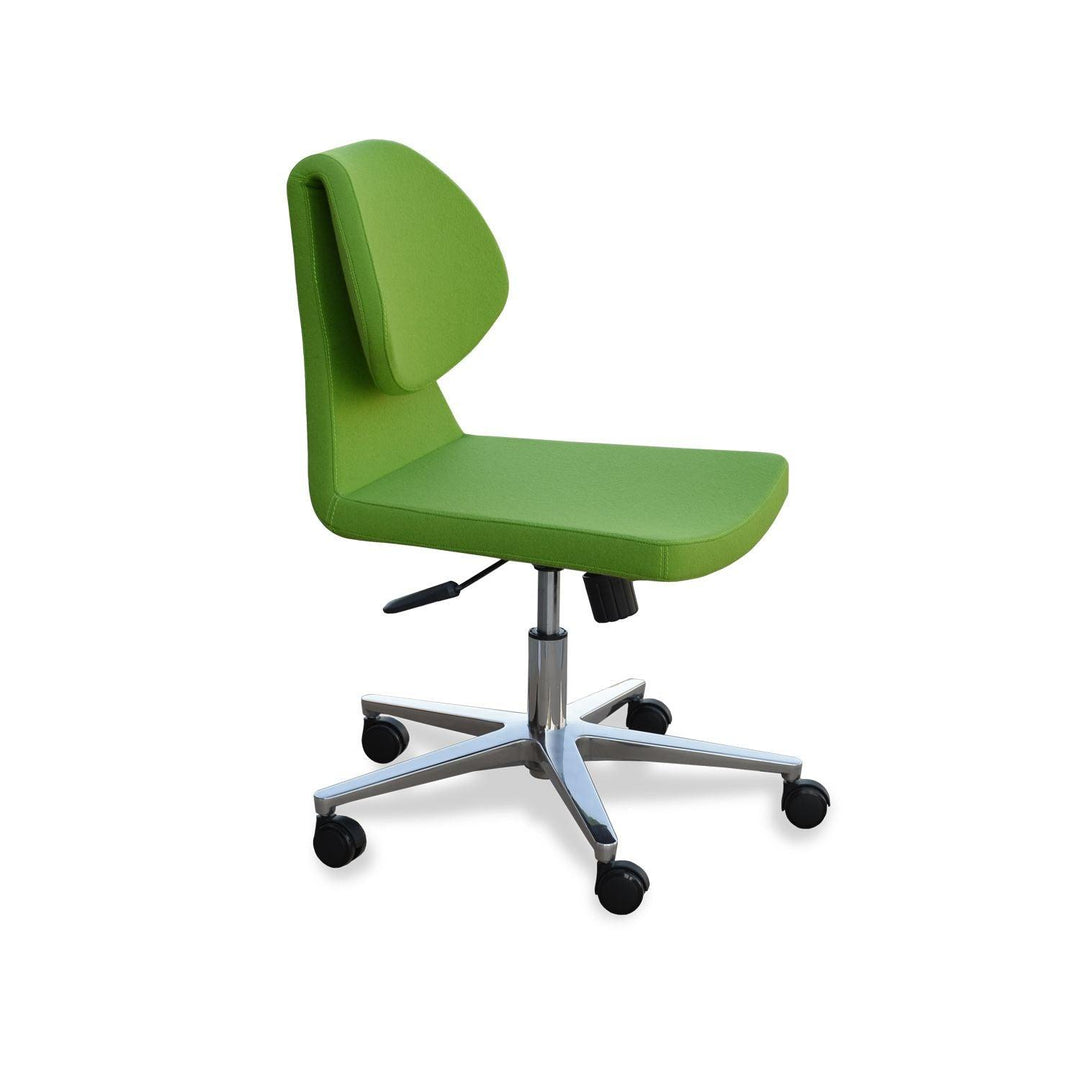 The Gakko office chair is a distinctive chair with a comfortable upholstered seat and backrest on a height-adjustable gas piston base that swivels and tilts. The chair has a chromed steel five-star base with plastic casters. The folded backrest gives the chair extra comfort and a futuristic look. The Gakko Seat is built on a solid birch wood frame. Gakko's seat is upholstered with a removable zipper and velcro-enclosed top-grain leather, PPM, or wool fabric slipcover. Gakko office chair may be upholstered with various other colors as a special order with a minimum quantity requirement. The chair is suitable for both residential and commercial use.