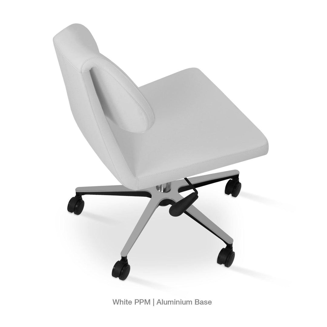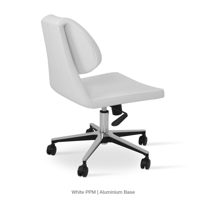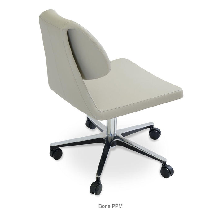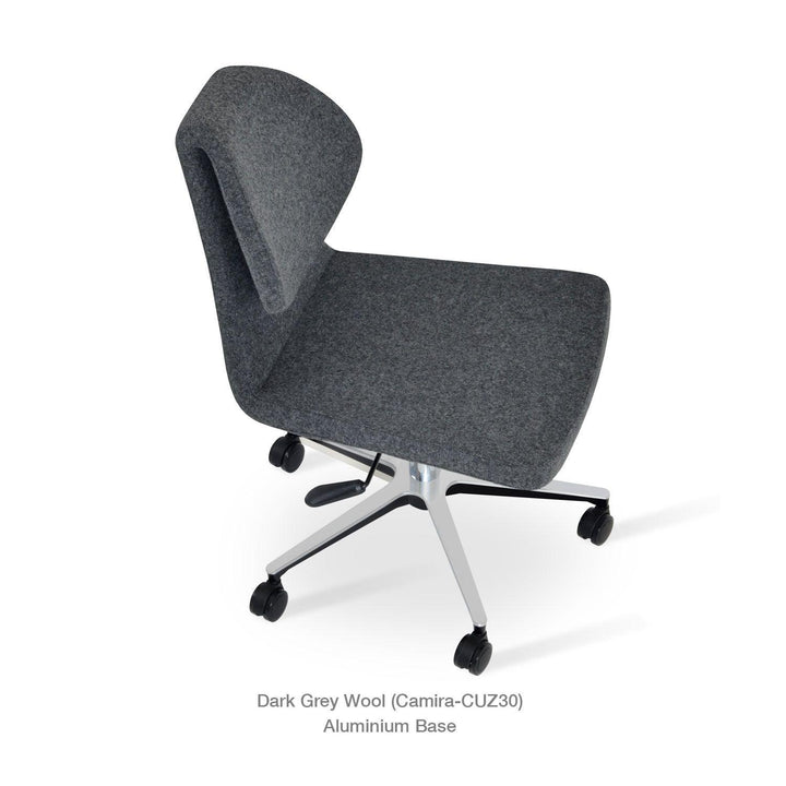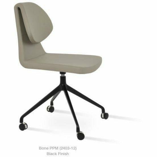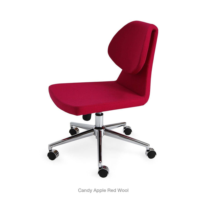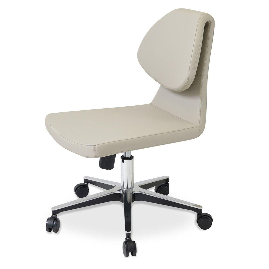 The Gakko office chair is a distinctive chair with a comfortable upholstered seat and backrest on a height-adjustable gas piston base that swivels and tilts. The chair has a chromed steel five-star base with plastic casters. The folded backrest gives the chair extra comfort and a futuristic look. The Gakko Seat is built on a solid birch wood frame. Gakko's seat is upholstered with a removable zipper and velcro-enclosed top-grain leather, PPM, or wool fabric slipcover. Gakko office chair may be upholstered with various other colors as a special order with a minimum quantity requirement. The chair is suitable for both residential and commercial use.