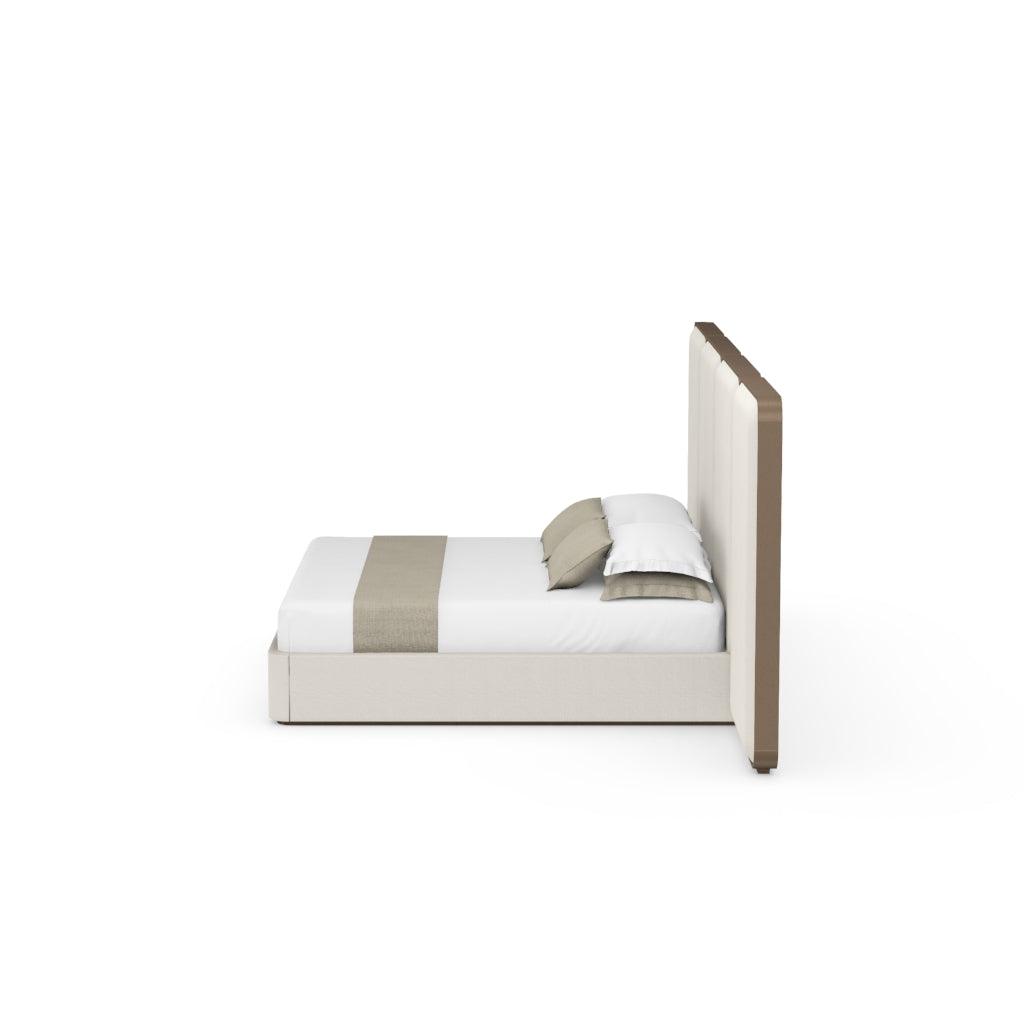 • Fully upholstered bed with unique wooden accents that bind the panels and enhance the overall silhouette.
