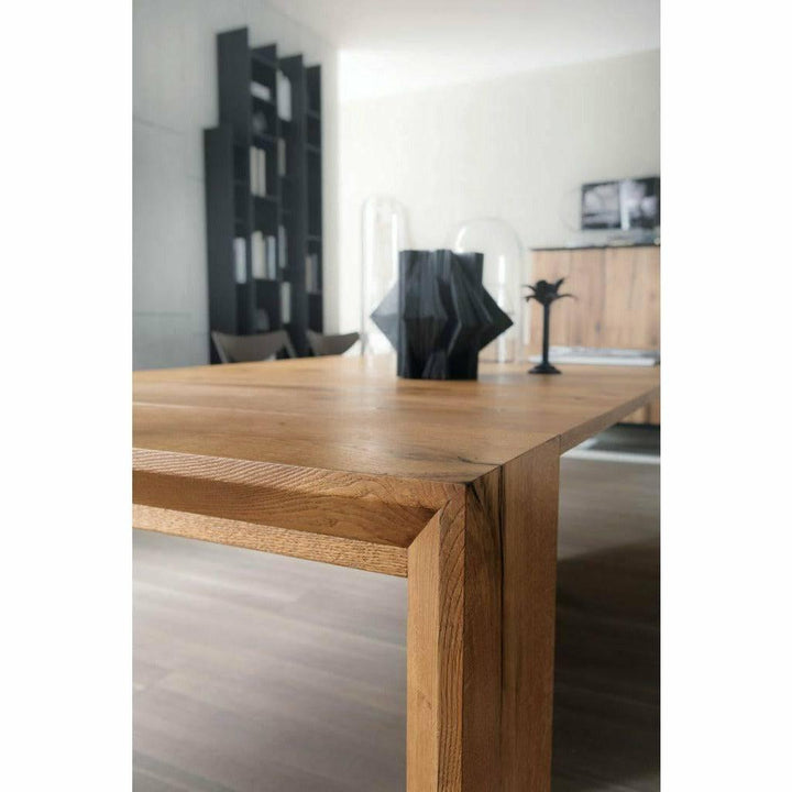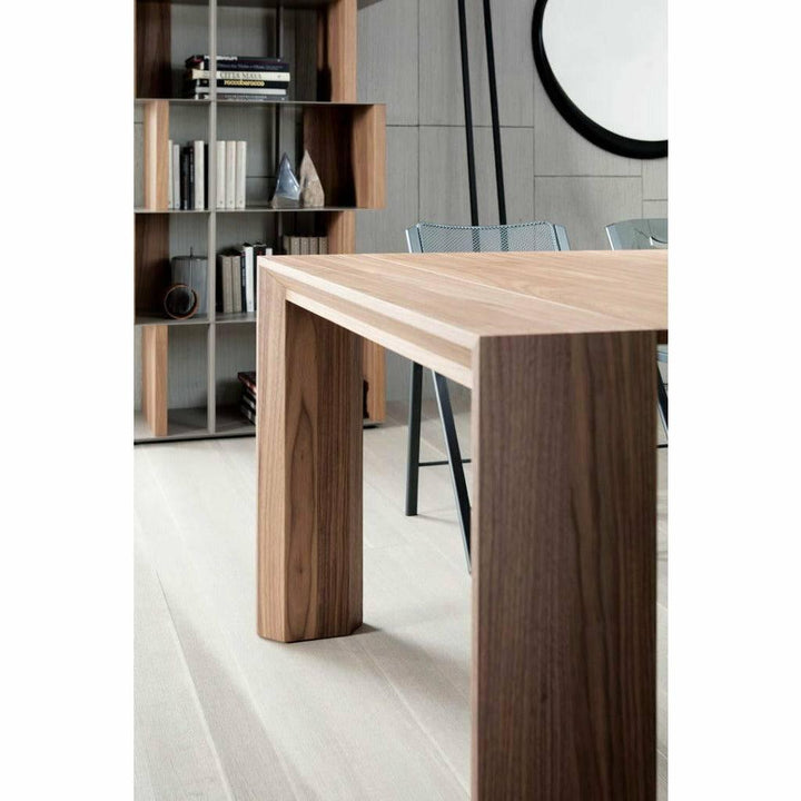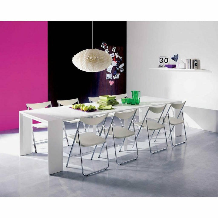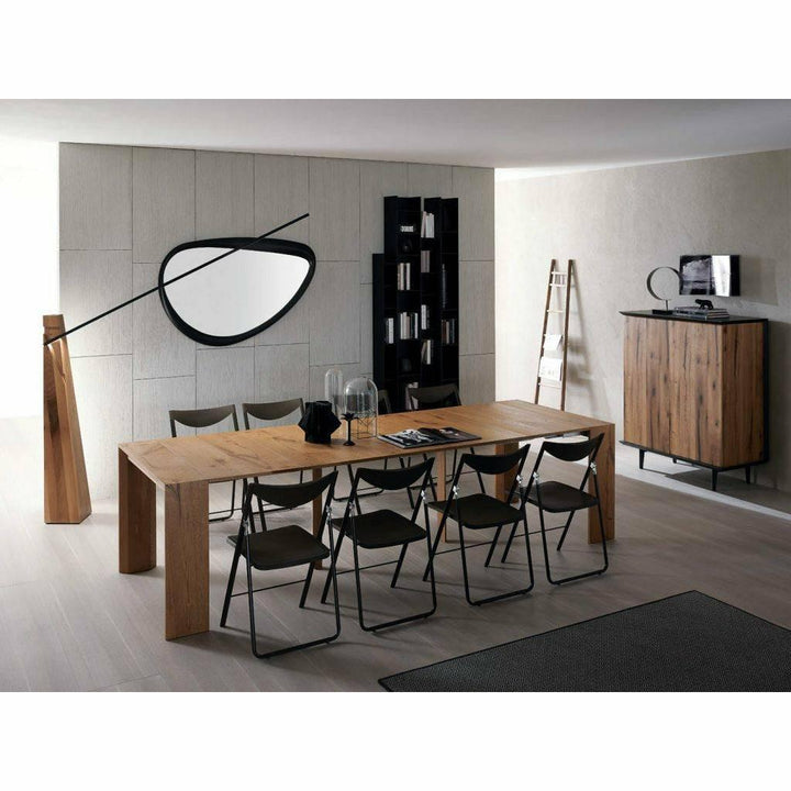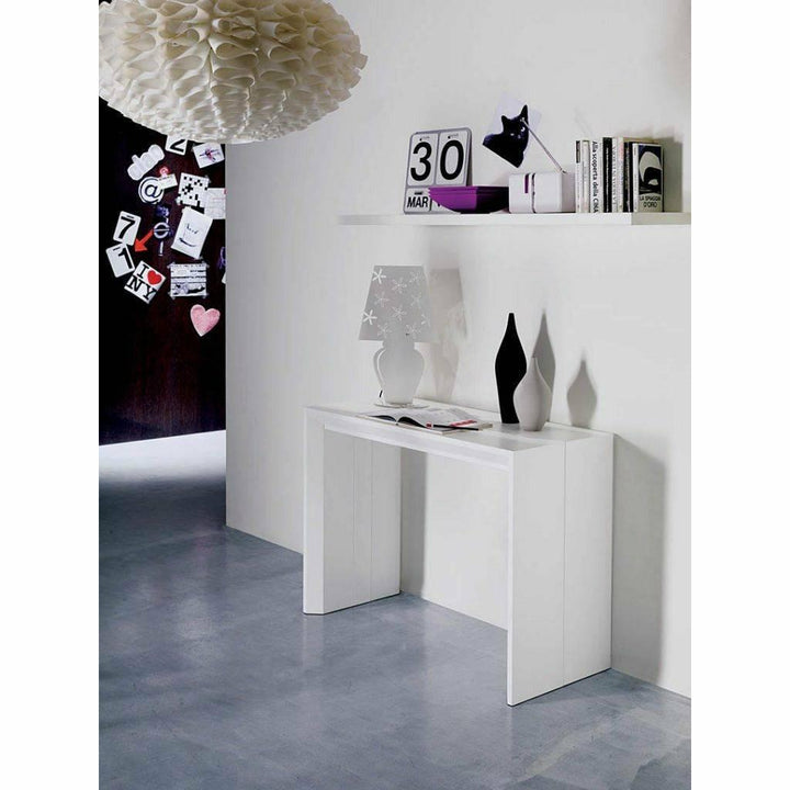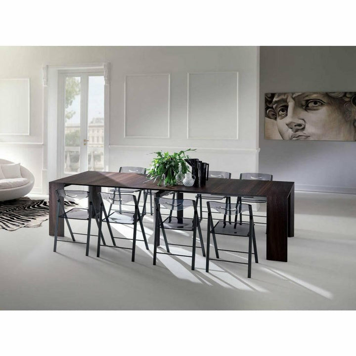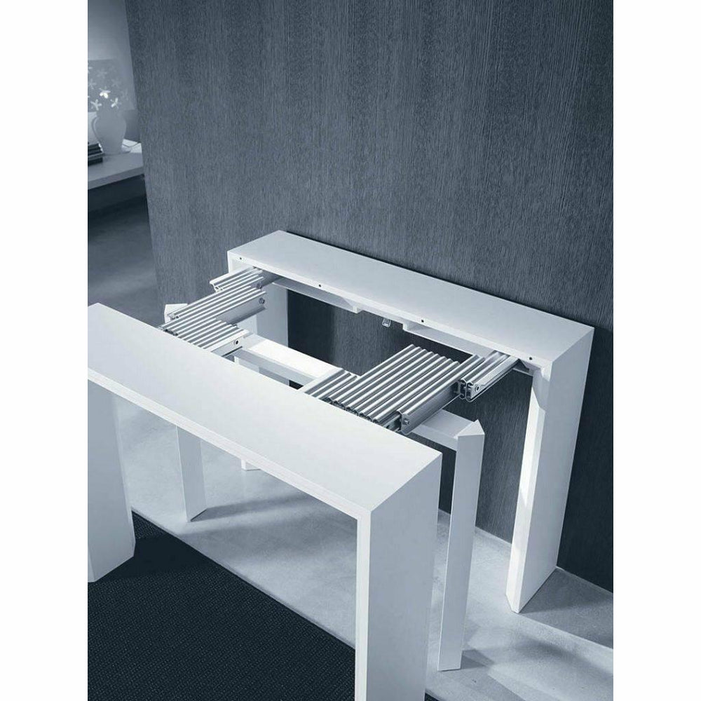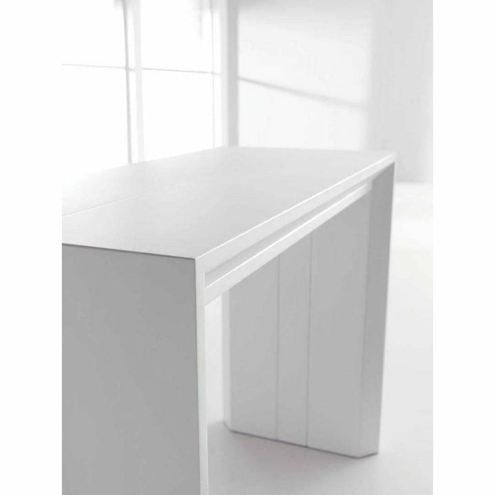 The Golia Console is minimal but with a versatile personality, with wooden tops, legs, and extensions, the telescopic mechanism in aluminum, and is equipped with 5 external extensions of 50 cm each, lacquered in the same color. The central pivoting leg has a double function: support the top while the console is open, to give extra room sitting for all guests.
