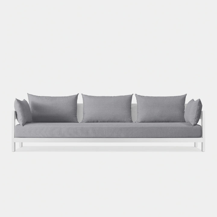 Our Hampton collection layers exciting angles with the simplicity of form for a harmonious design. The Hampton One Seat Sofa is an elegant update to timeless pieces — enjoy a plush bench cushion on a sling suspension, all handcrafted in square geometries of extruded aluminum. Side cushions add extra comfort, while square cut–out details add visual interest. Clean lines and versatility make this piece perfect for any smaller outdoor space.