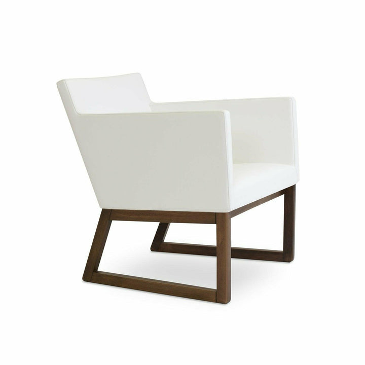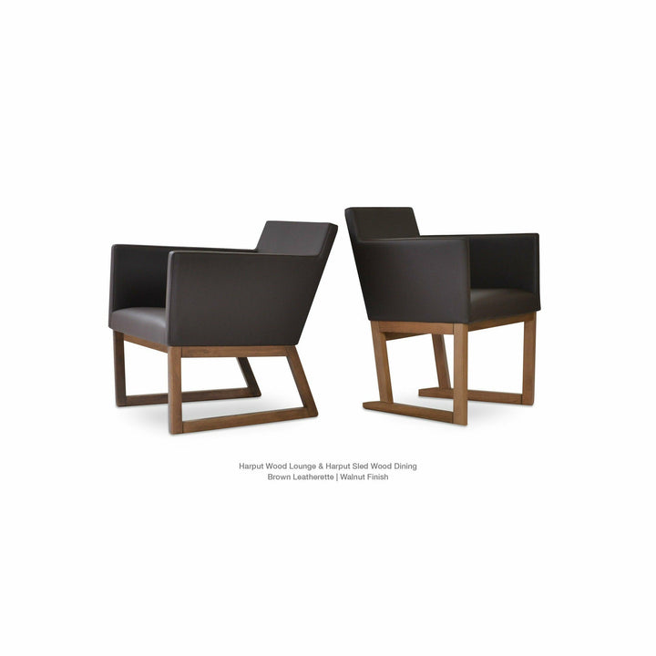Harput Sled Wood Lounge Chair is an armchair with a comfortable upholstered seat and backrest on solid walnut legs tipped with screwed plastic caps. The seat has a steel structure with “S” shape springs for extra flexibility and strength. This steel frame is molded by injecting polyurethane foam. The Harput seat is upholstered with a removable velcro-enclosed leather, PPM, or wool fabric slipcover. Camira Fabrics are 5 years guaranteed from the date of invoice against wear through (the complete deterioration of the fabric's structure in a particular area) and loss of colorfastness (the excessive loss of color due to exposure to light). PPM Leatherette is under a 5-year guarantee against wear through. The chair is suitable for both residential and commercial use.