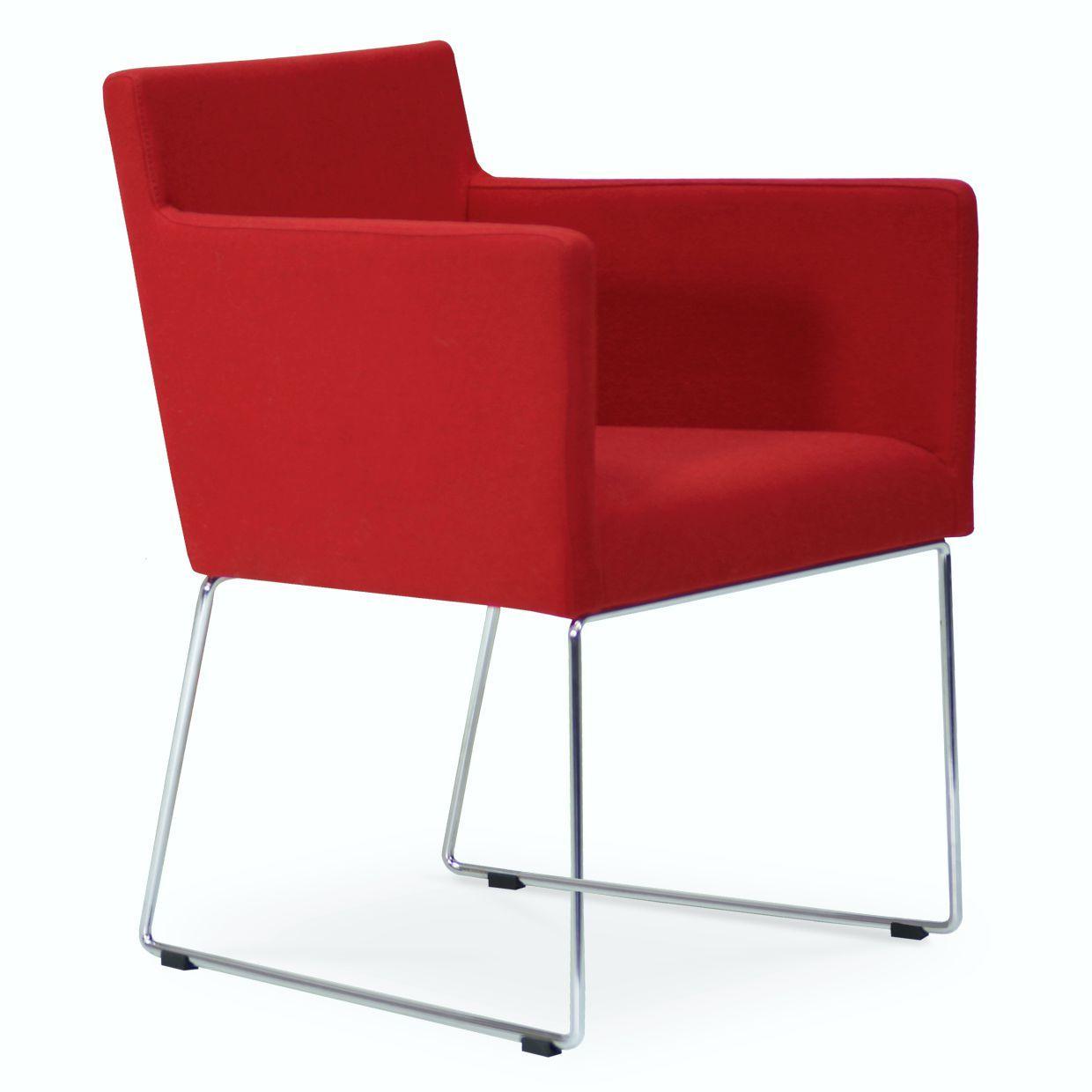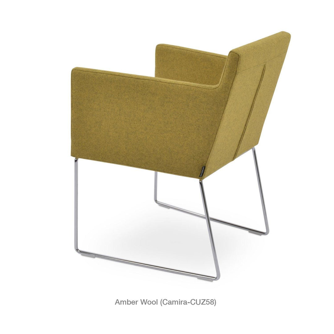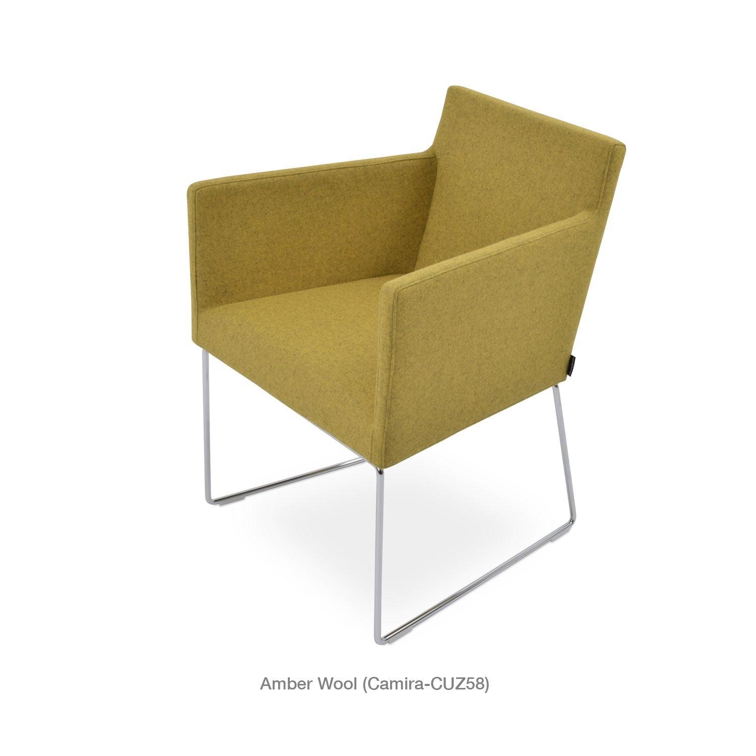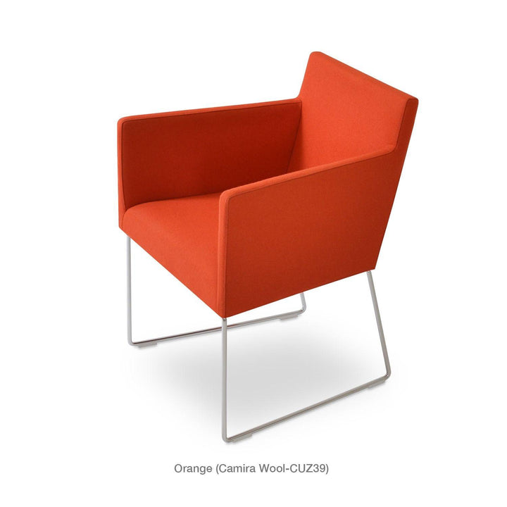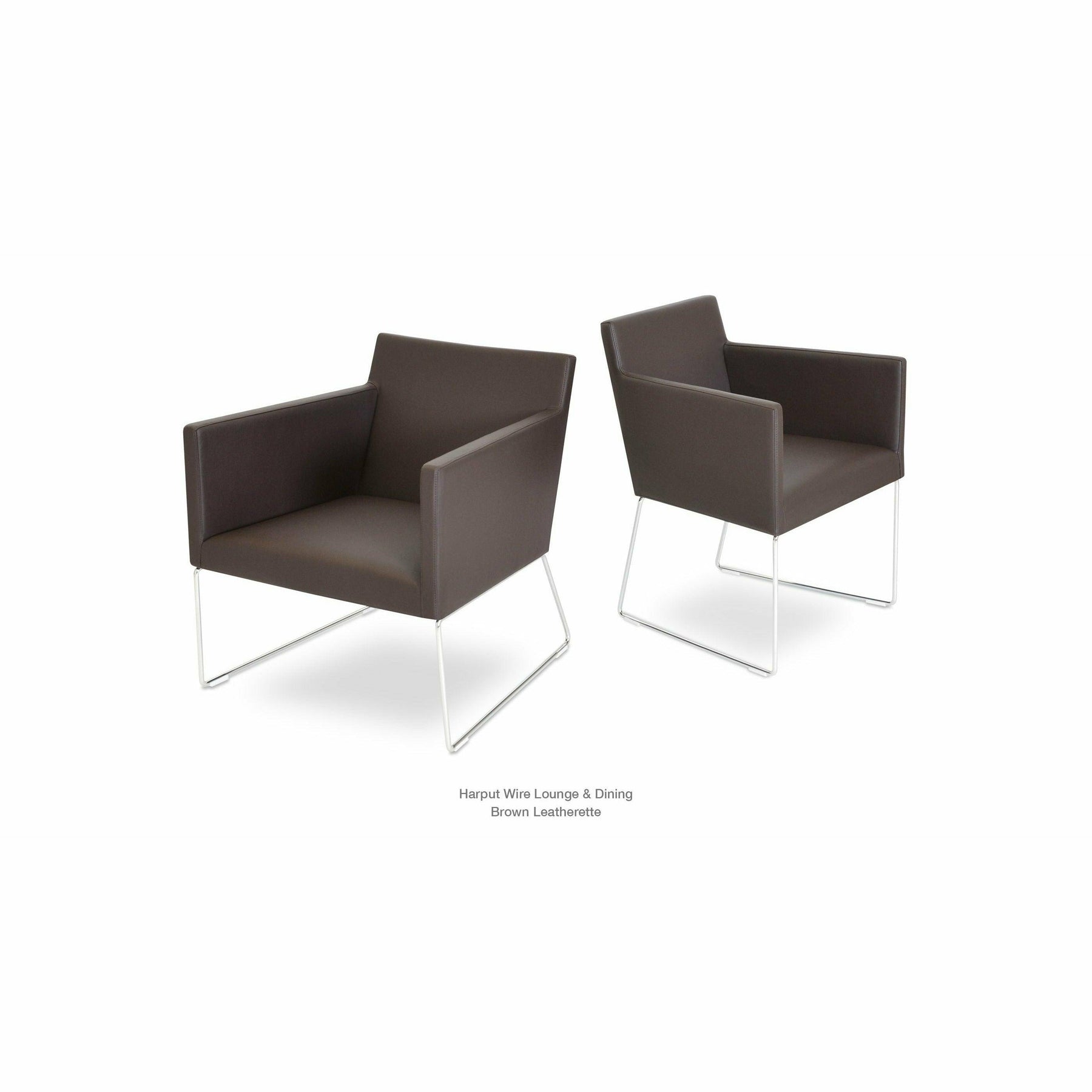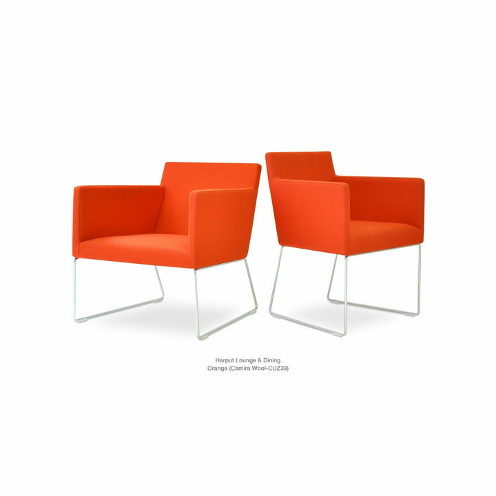 Harput Wire Chair is an upholstered seat and backrest on a sled chrome wire base tipped with screwed plastic caps. The seat has a steel structure with “S” shape springs for extra flexibility and strength. This steel frame is molded by injecting polyurethane foam. The Harput seat is upholstered with a removable velcro-enclosed leather, PPM, or wool fabric slip cover. Camira Fabrics are five years guaranteed from the date of invoice against wear through (the complete deterioration of the fabric's structure in a particular area) and loss of colorfastness (the excessive loss of color due to exposure to light). PPM Leatherette is under a 5-year guarantee against wear through. Harput Wire is suitable for both residential and commercial use.