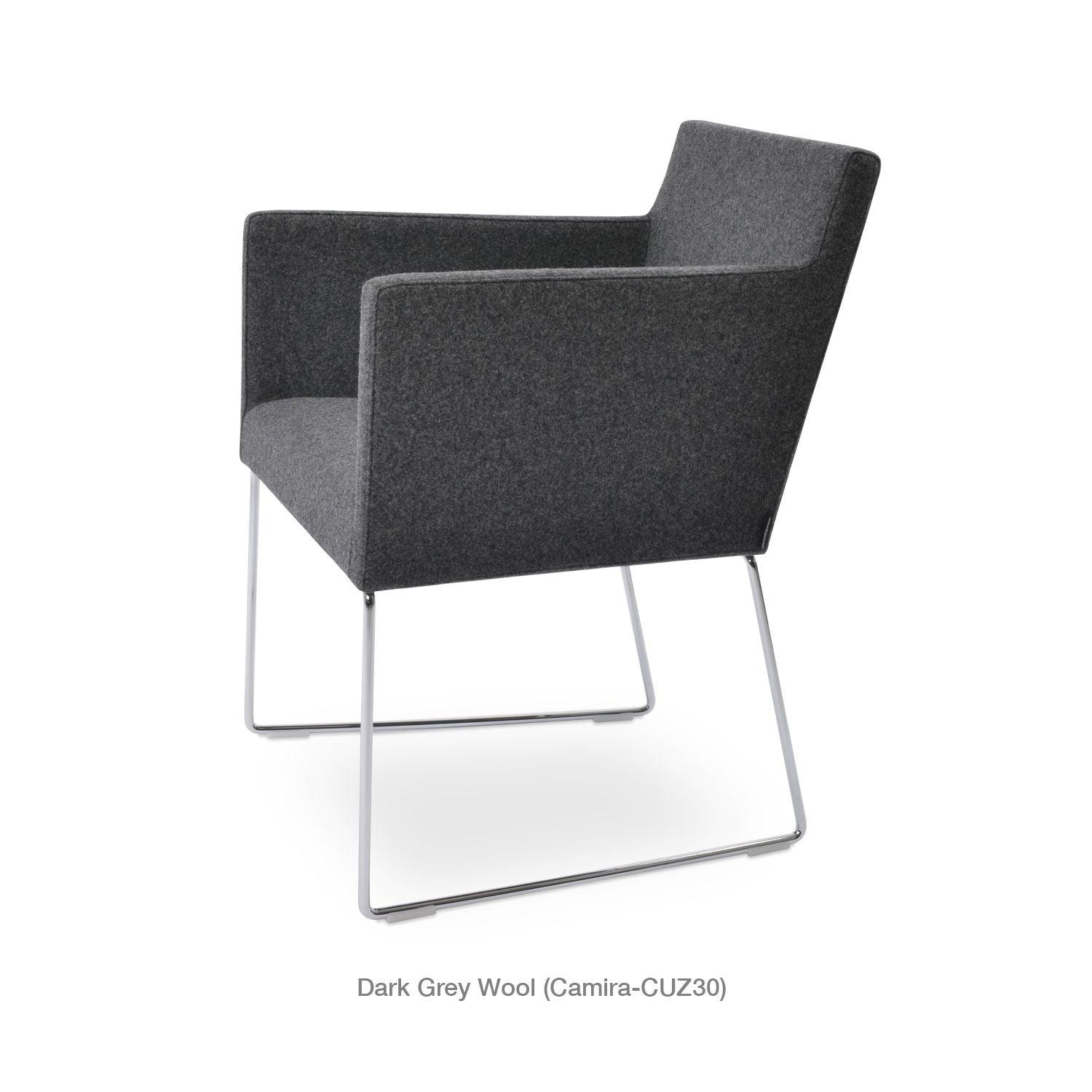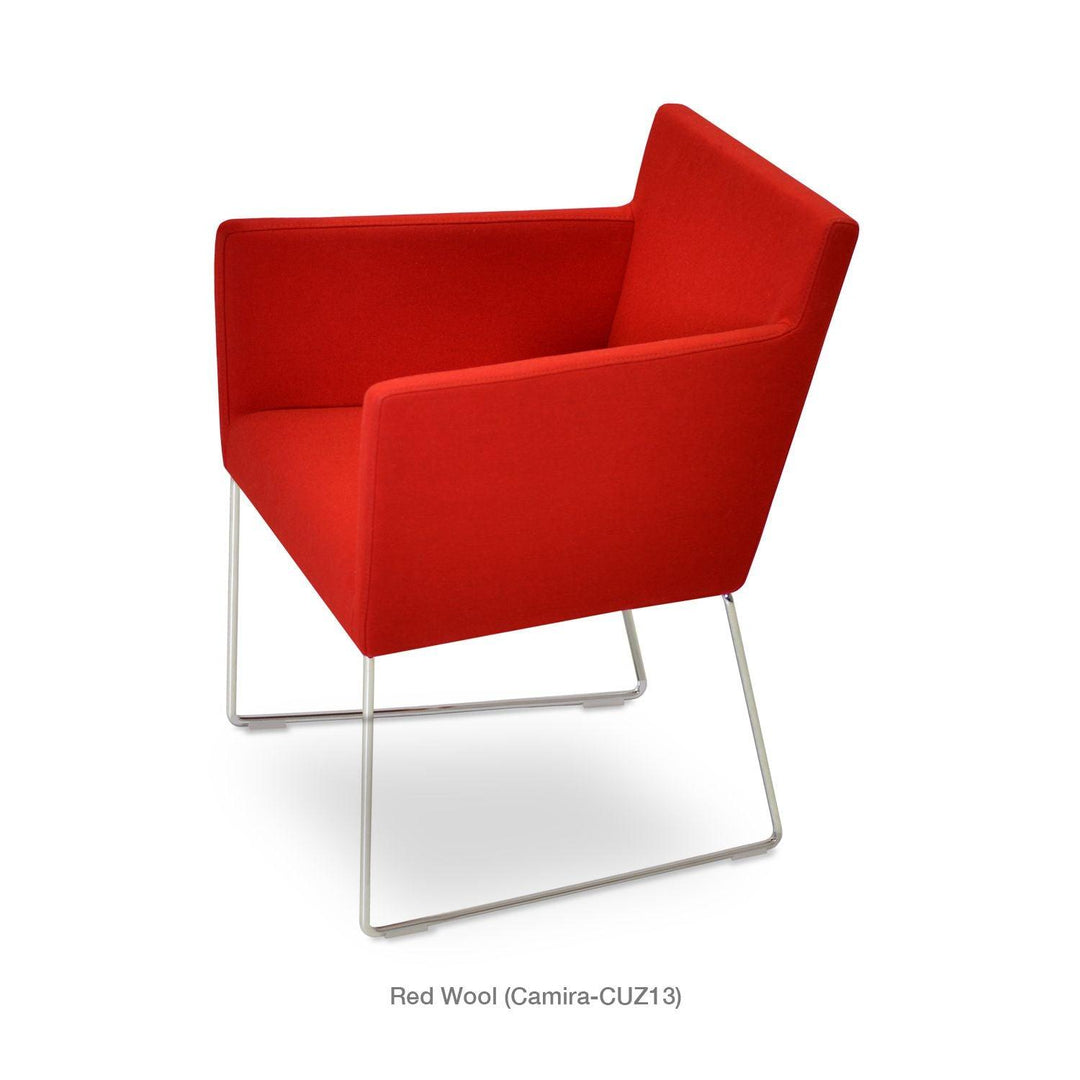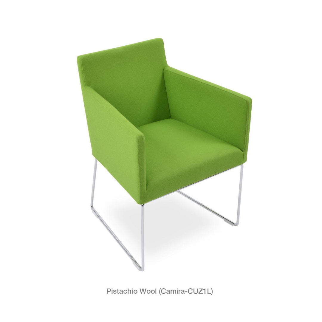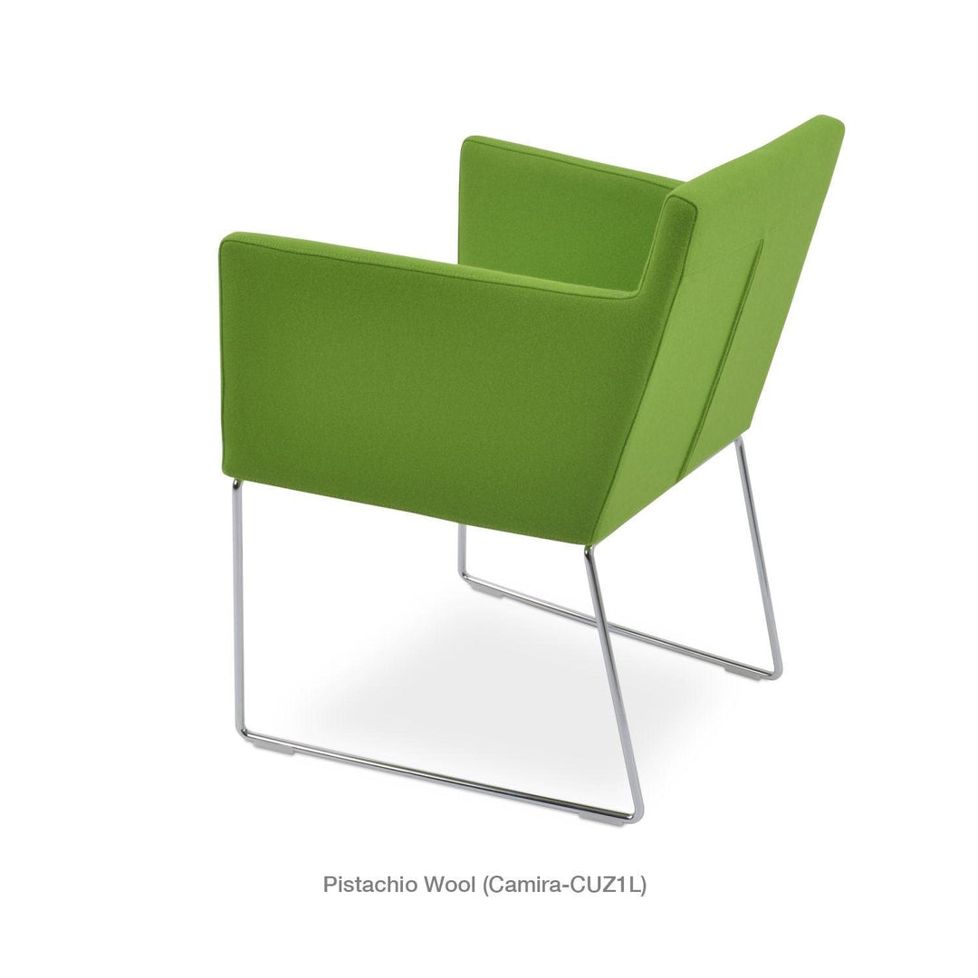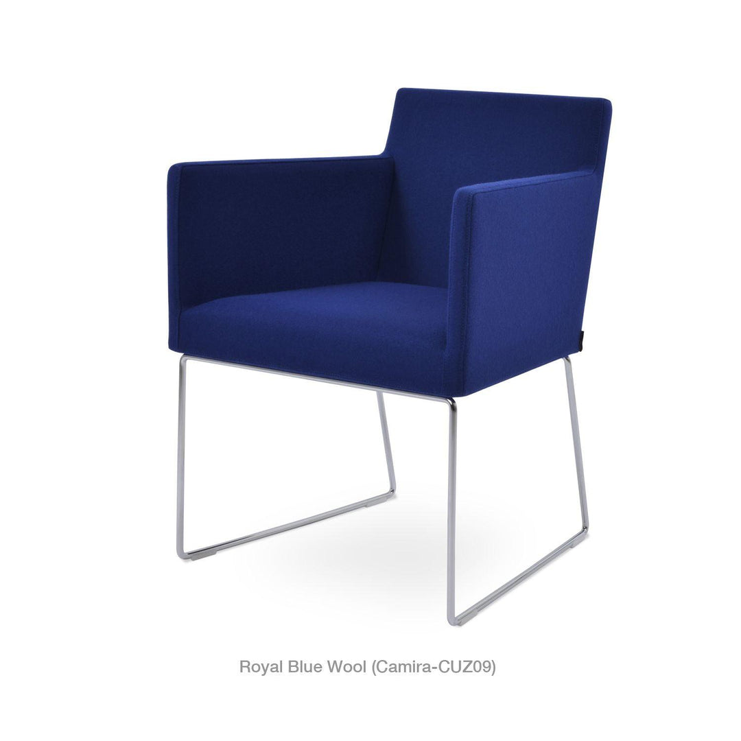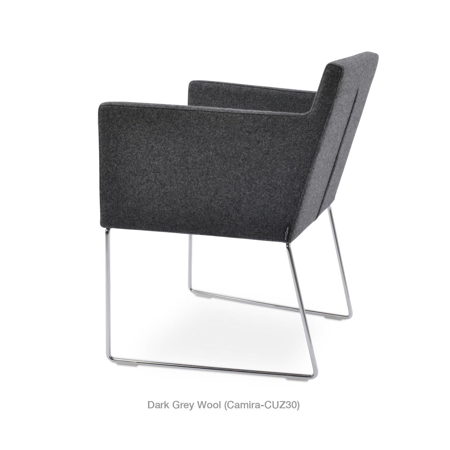 Harput Wire Chair is an upholstered seat and backrest on a sled chrome wire base tipped with screwed plastic caps. The seat has a steel structure with “S” shape springs for extra flexibility and strength. This steel frame is molded by injecting polyurethane foam. The Harput seat is upholstered with a removable velcro-enclosed leather, PPM, or wool fabric slip cover. Camira Fabrics are five years guaranteed from the date of invoice against wear through (the complete deterioration of the fabric's structure in a particular area) and loss of colorfastness (the excessive loss of color due to exposure to light). PPM Leatherette is under a 5-year guarantee against wear through. Harput Wire is suitable for both residential and commercial use.