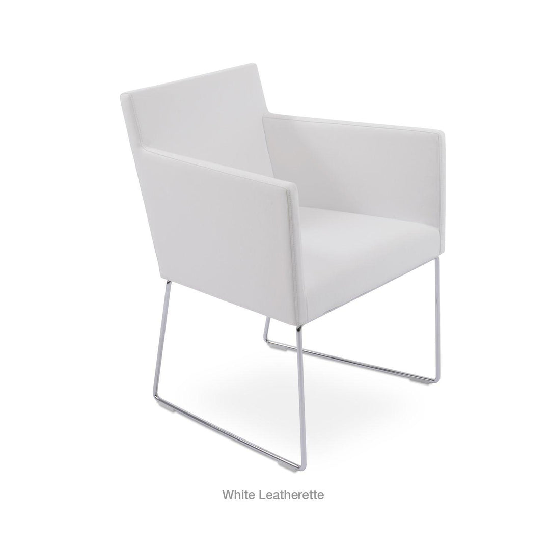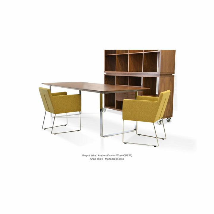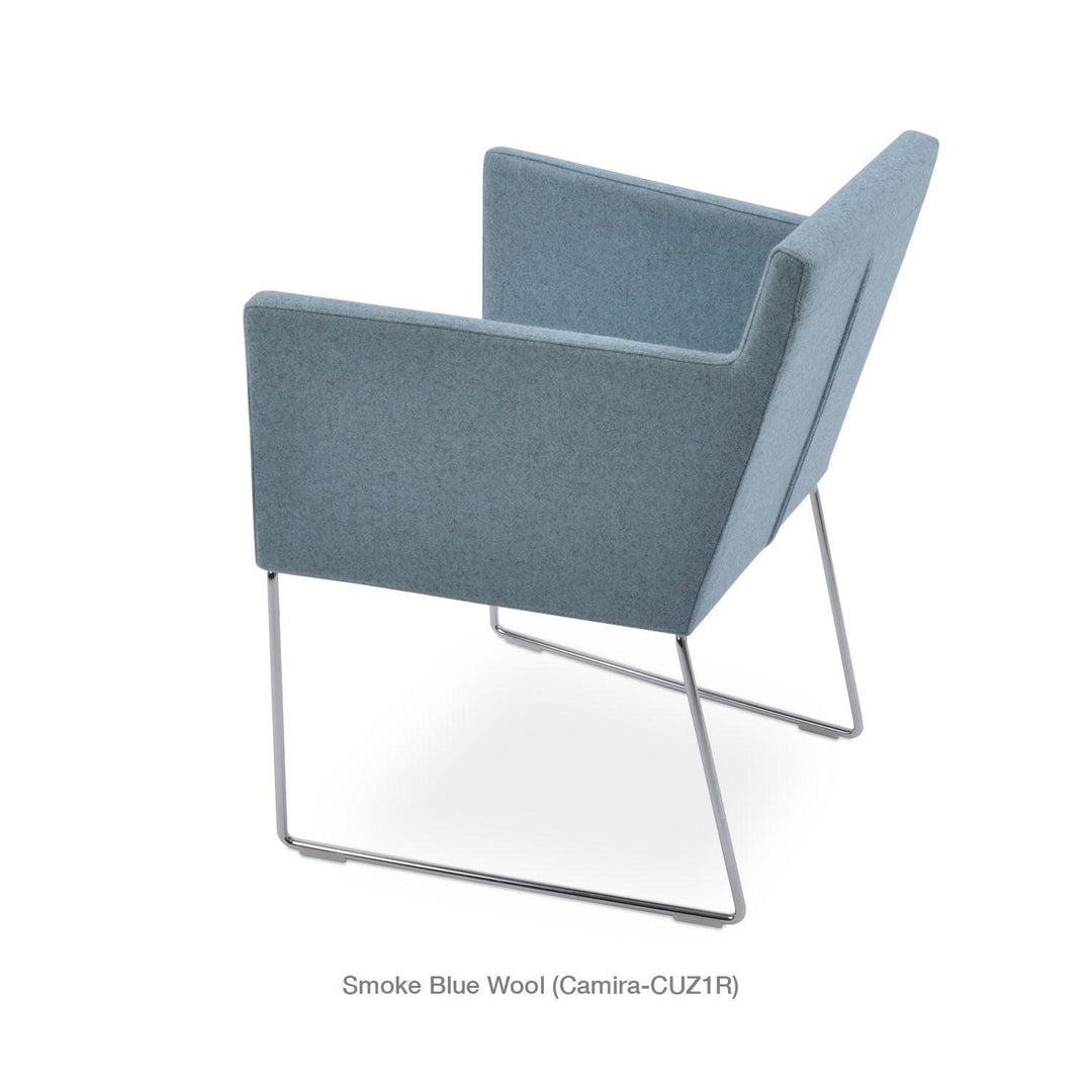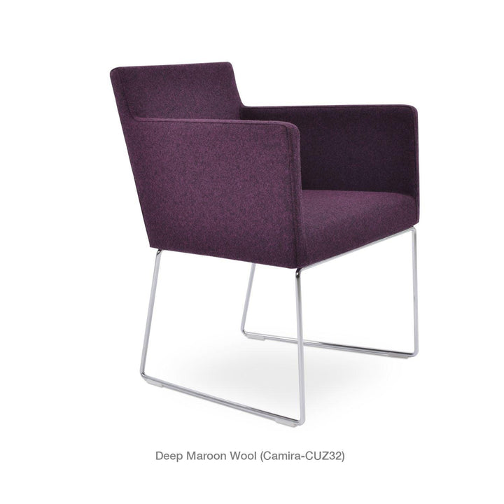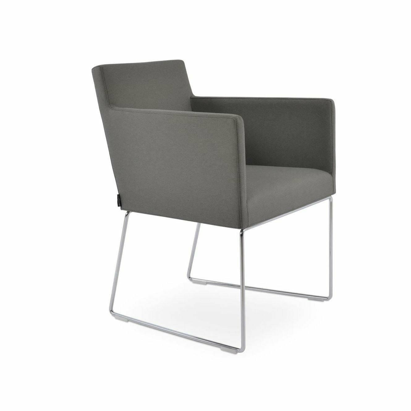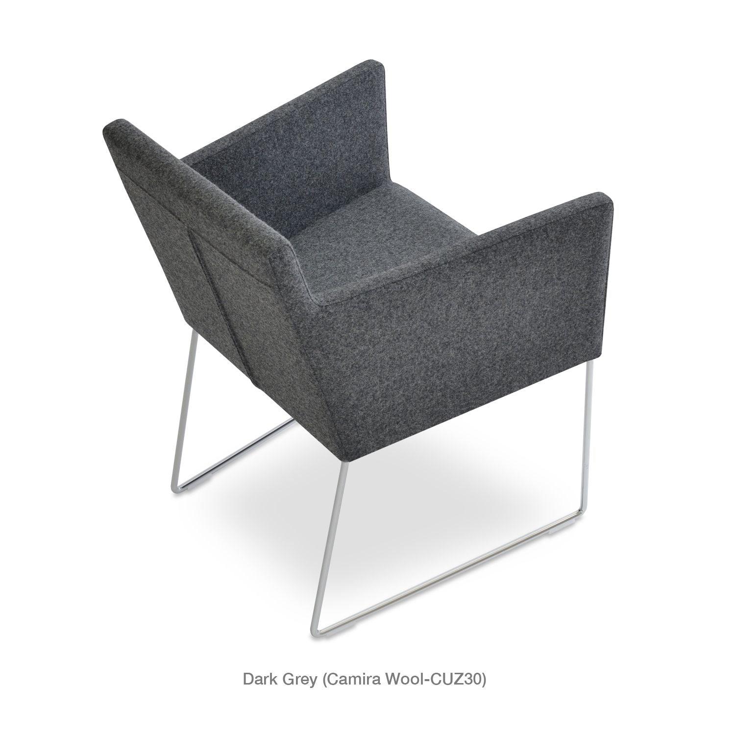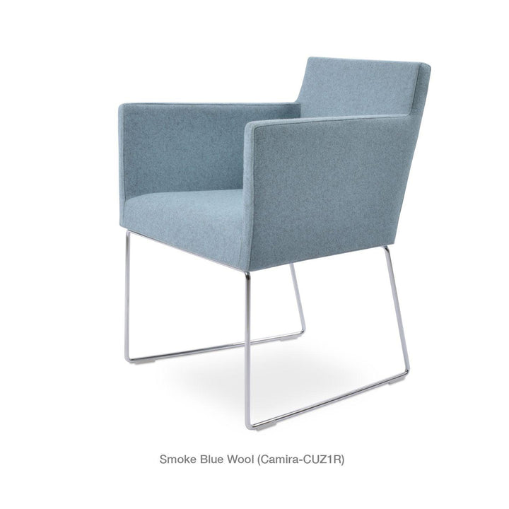 Harput Wire Chair is an upholstered seat and backrest on a sled chrome wire base tipped with screwed plastic caps. The seat has a steel structure with “S” shape springs for extra flexibility and strength. This steel frame is molded by injecting polyurethane foam. The Harput seat is upholstered with a removable velcro-enclosed leather, PPM, or wool fabric slip cover. Camira Fabrics are five years guaranteed from the date of invoice against wear through (the complete deterioration of the fabric's structure in a particular area) and loss of colorfastness (the excessive loss of color due to exposure to light). PPM Leatherette is under a 5-year guarantee against wear through. Harput Wire is suitable for both residential and commercial use.