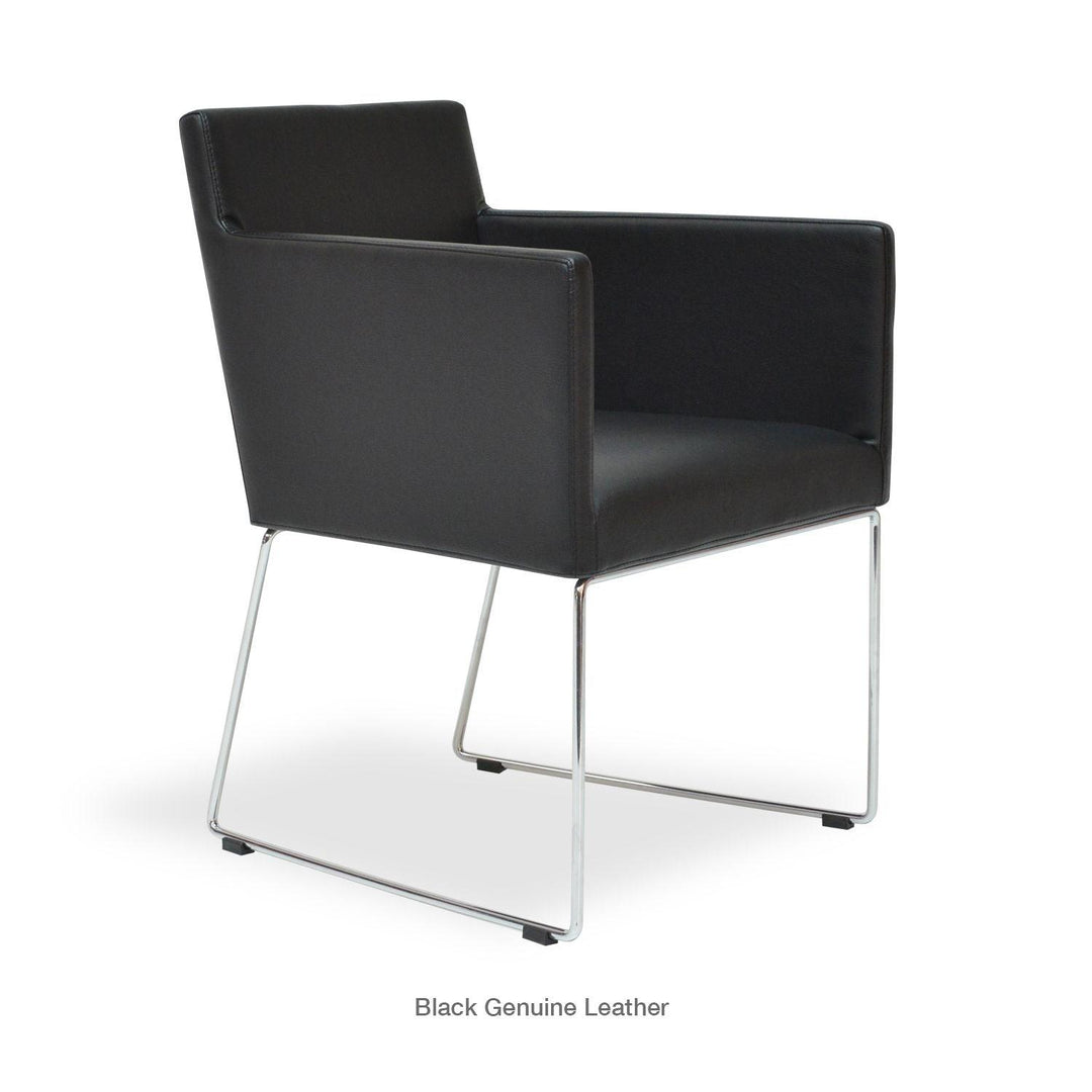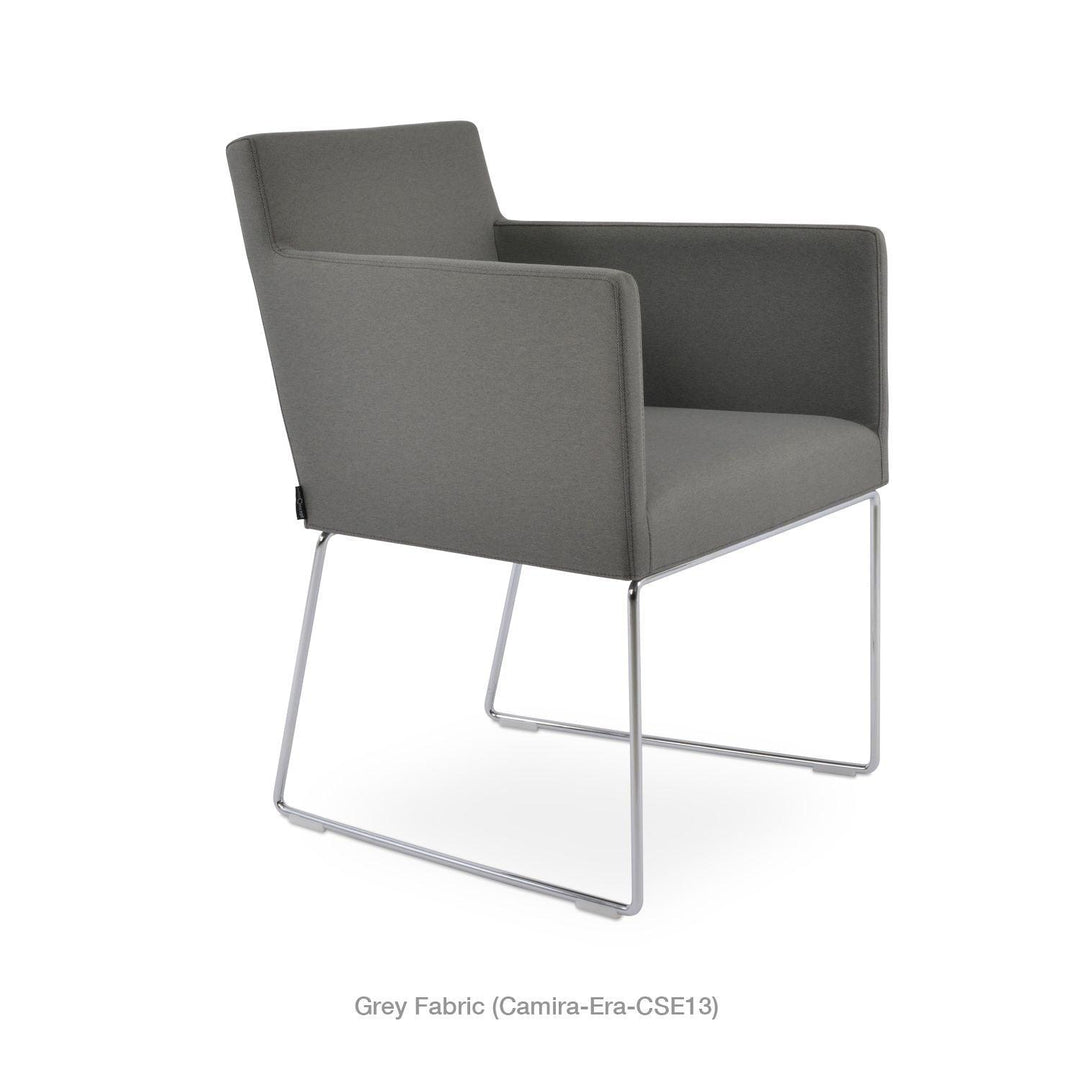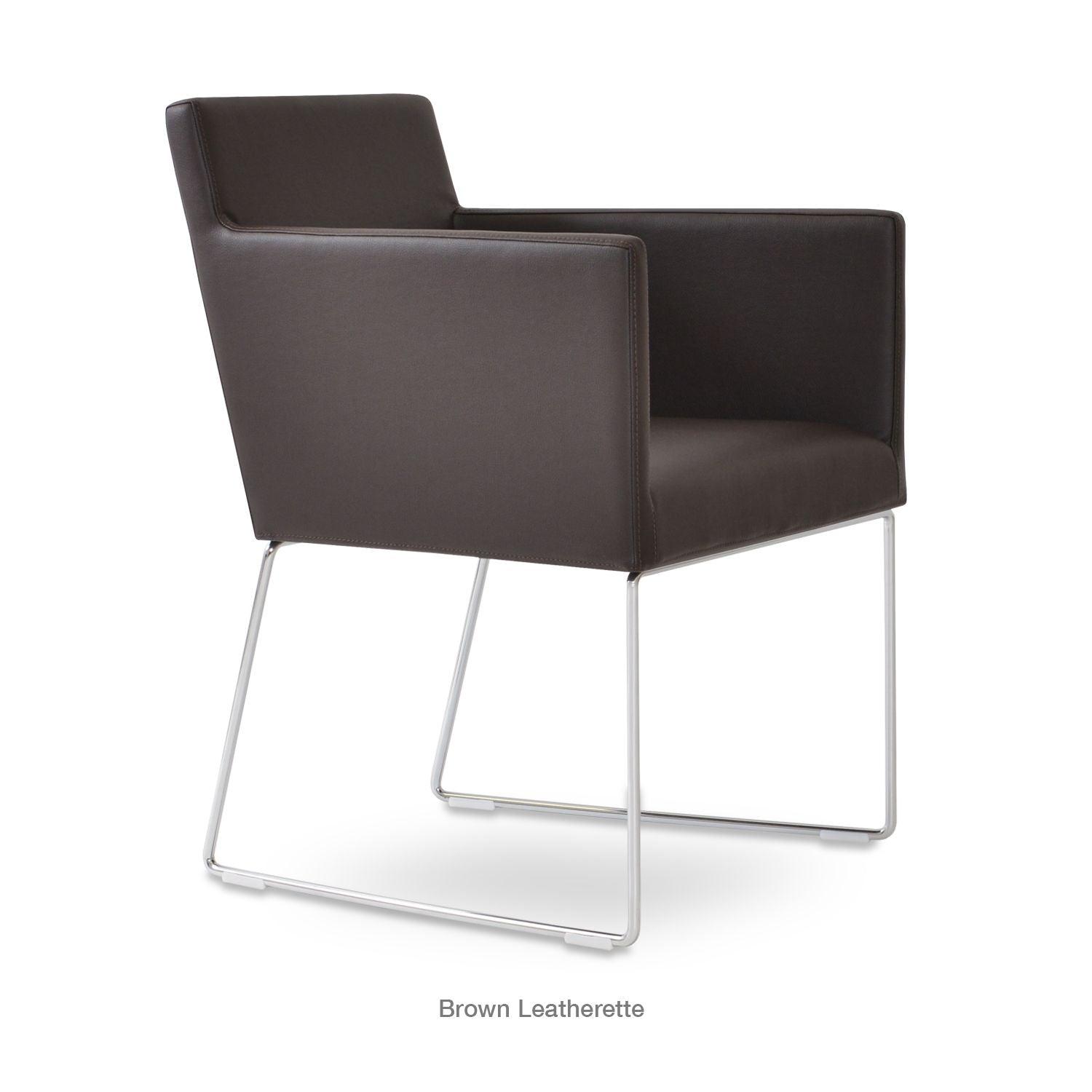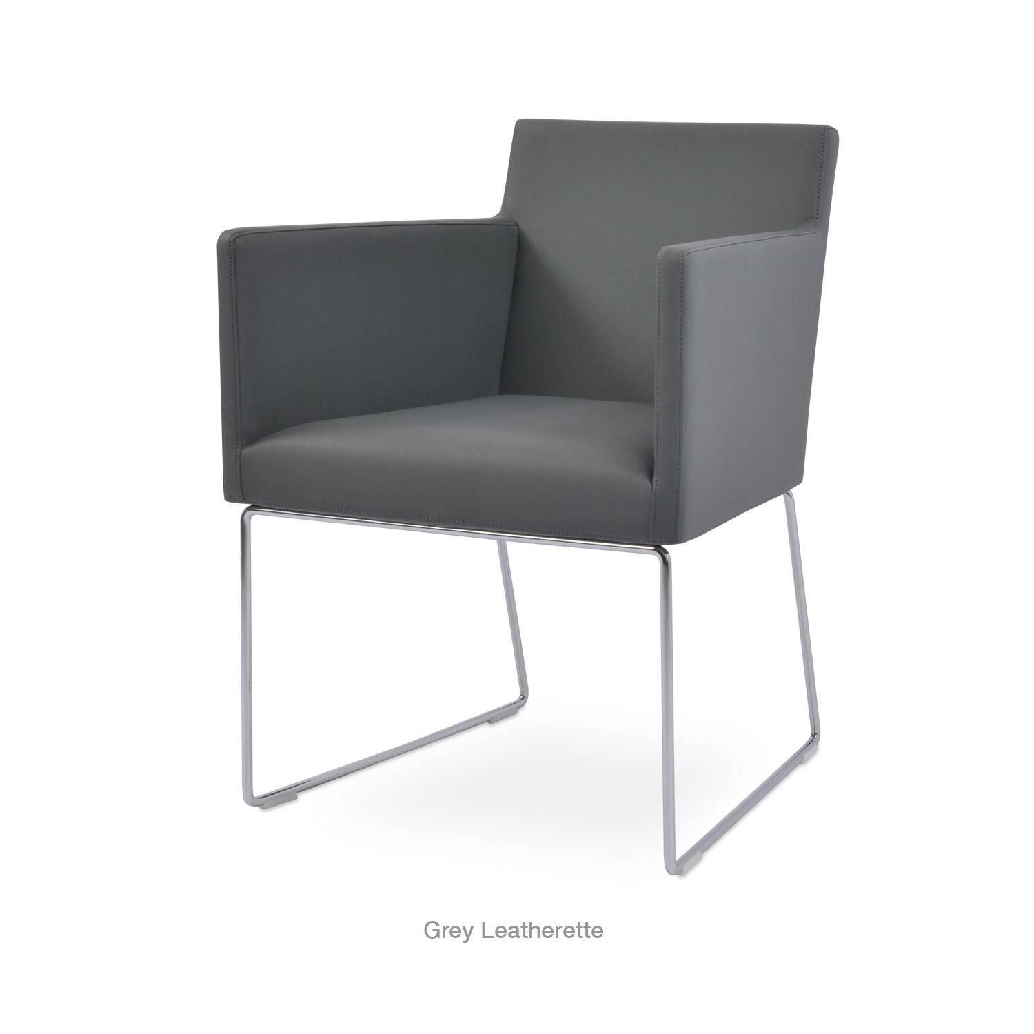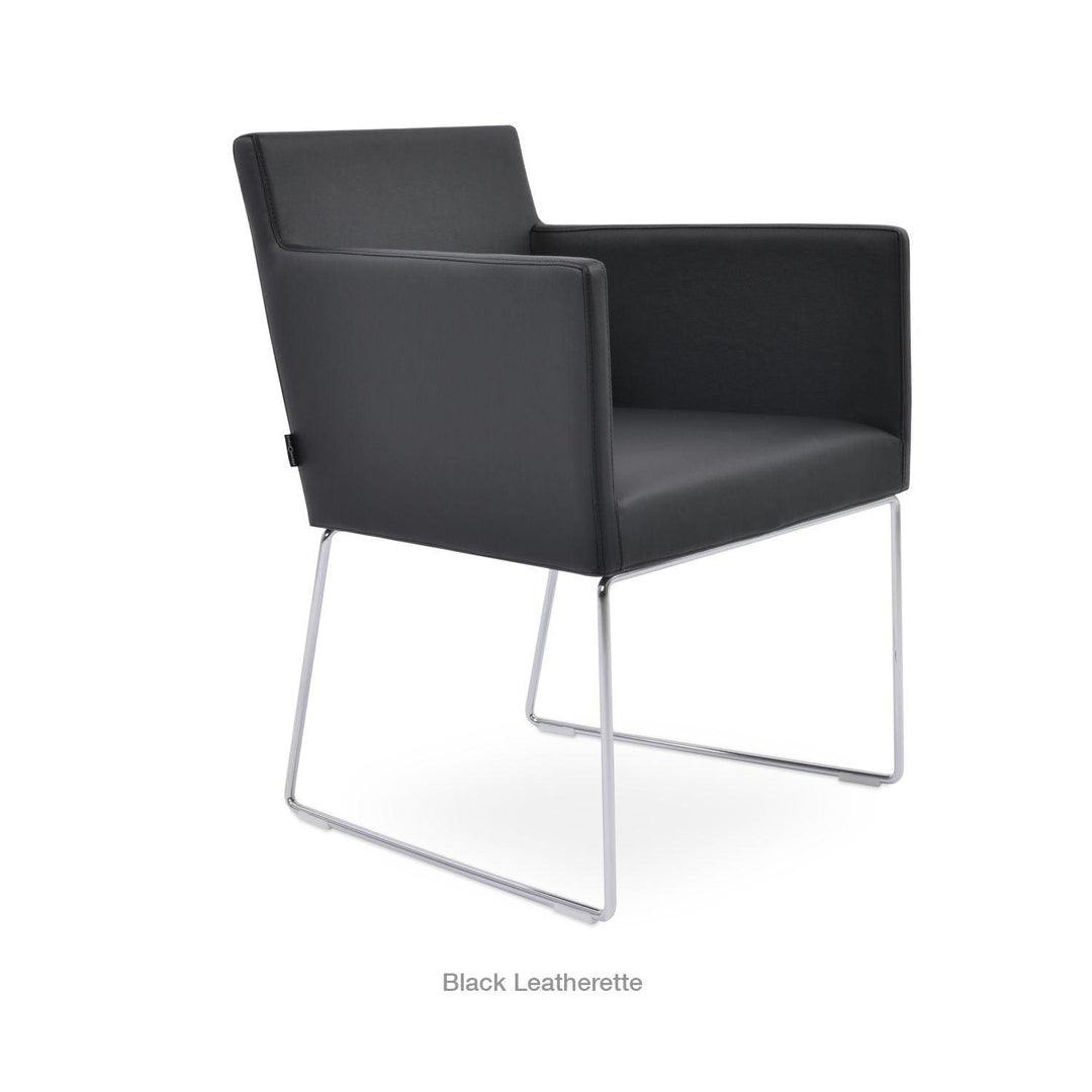 Harput Wire Chair is an upholstered seat and backrest on a sled chrome wire base tipped with screwed plastic caps. The seat has a steel structure with “S” shape springs for extra flexibility and strength. This steel frame is molded by injecting polyurethane foam. The Harput seat is upholstered with a removable velcro-enclosed leather, PPM, or wool fabric slip cover. Camira Fabrics are five years guaranteed from the date of invoice against wear through (the complete deterioration of the fabric's structure in a particular area) and loss of colorfastness (the excessive loss of color due to exposure to light). PPM Leatherette is under a 5-year guarantee against wear through. Harput Wire is suitable for both residential and commercial use.