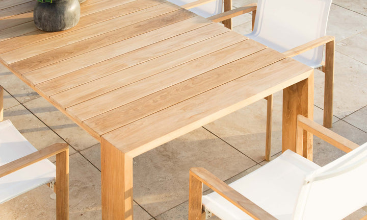 Our Hayman collection is a statement in simplicity with clean angles and modern styling. Our Hayman Dining Chair was designed as the perfect everyday seat — enjoy a simple, modern chair with a solid teak frame supported by a Batyline sling suspension for added comfort and easy cleaning. Indoor–inspired comfort meets outdoor performance with this geometric piece made for a variety of spaces.