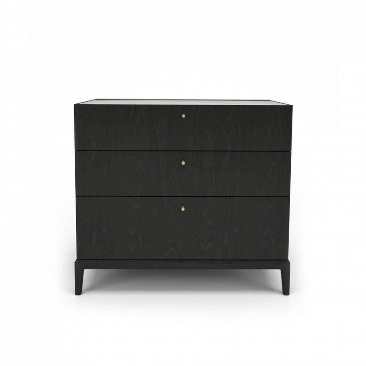 - Sophisticated three-drawer design with a contrast ceramic top and brass finishes