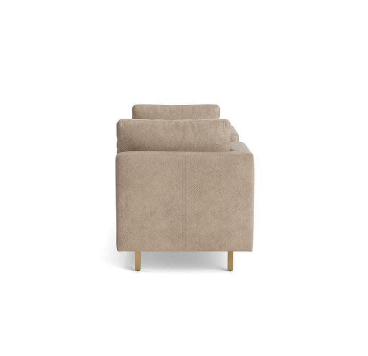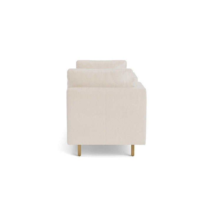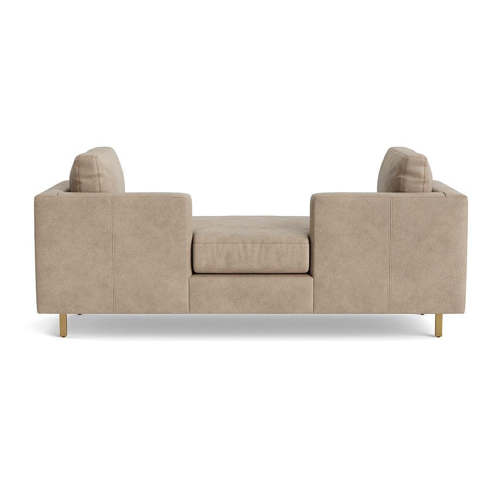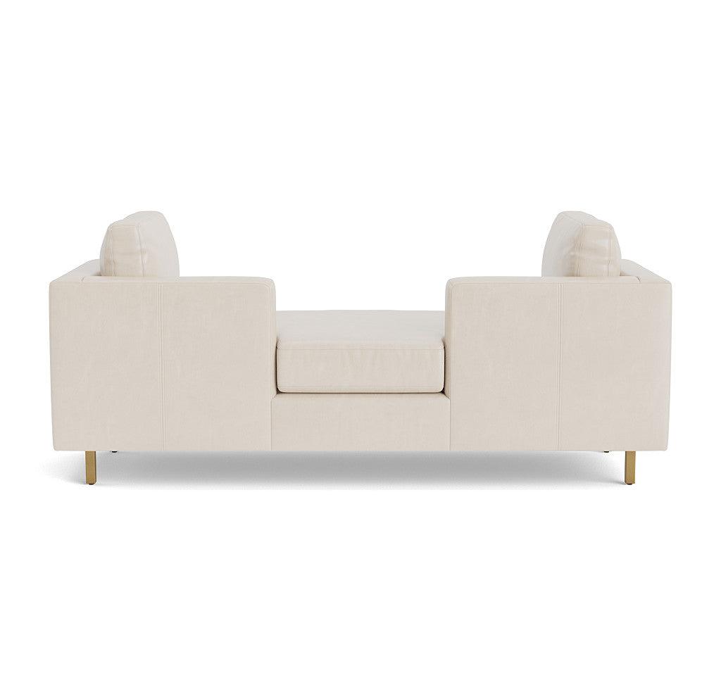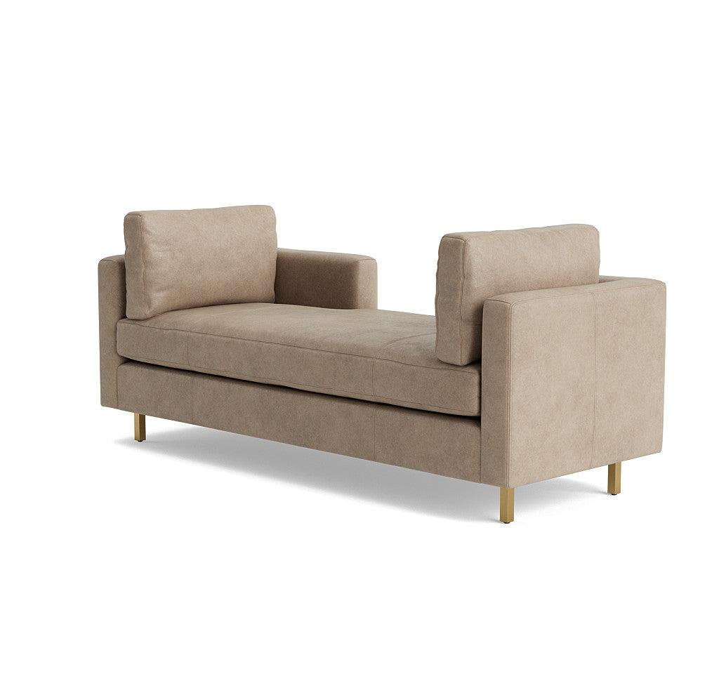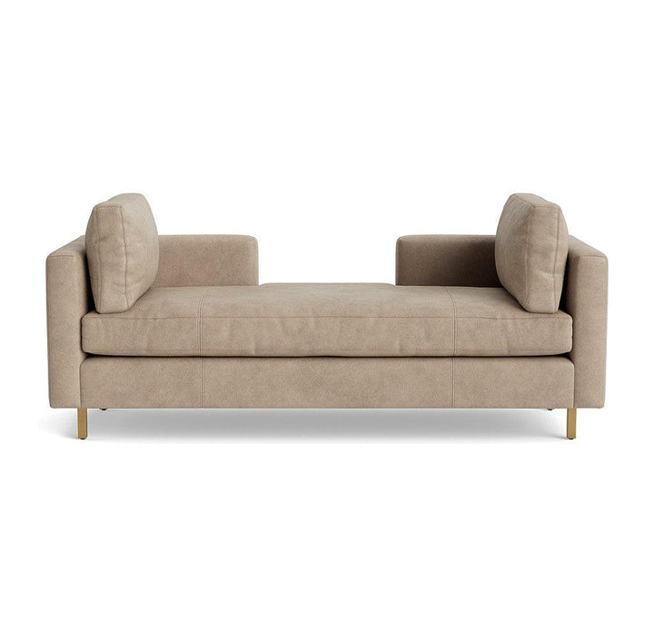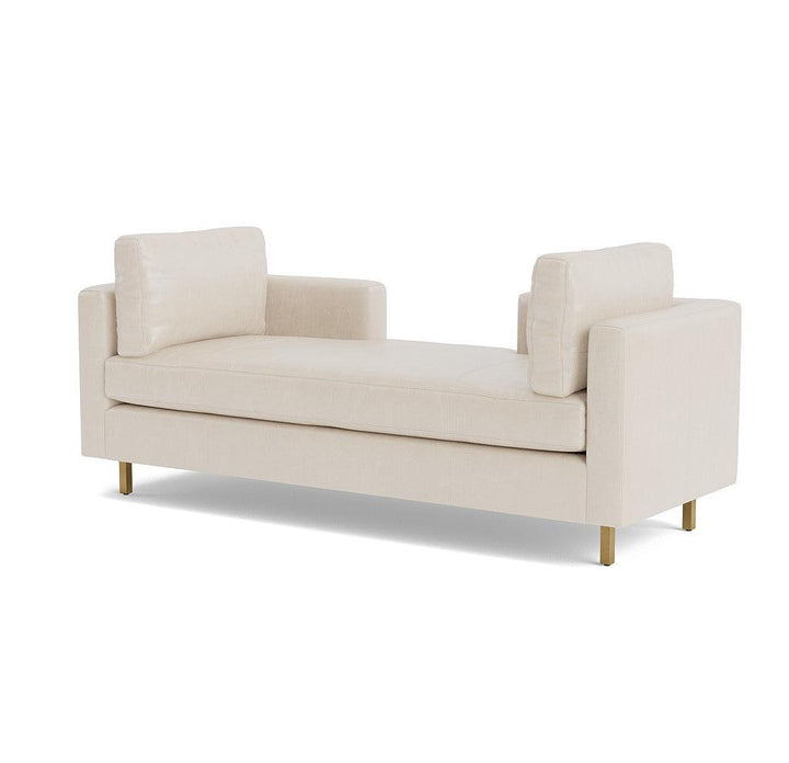 Experience the elegance and comfort of the Haven Lounge by Thomas Dawn. This modern lounge piece is an exceptional addition to any space, be it a living area, bedroom, or landing. At 78" in width, it provides ample space for relaxation or comfortably seats two with its divided back. Enhanced by a sumptuous bench cushion and plush side pillows, every seating moment is elevated to a luxurious experience. While featured in fabric in primary images, customization options include upholstery in leather or fabric slipcovers. Choose between distinct leg designs: square polished stainless steel, square brass, or classic round wood.