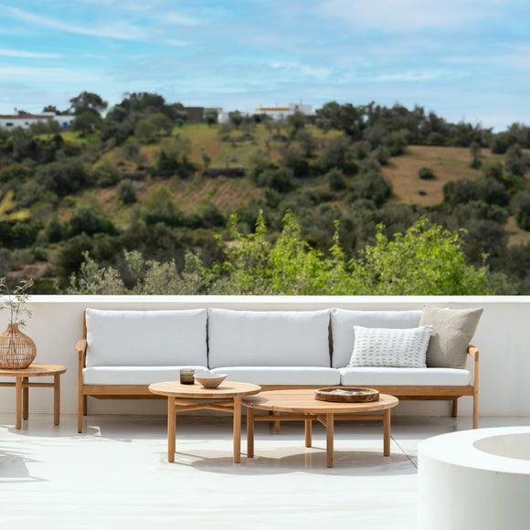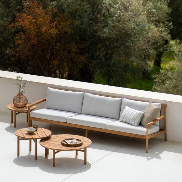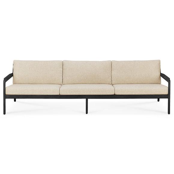 The Jack Outdoor 3 Seater Sofa by Ethnicraft, designed by Jacques Deneef, is a stunning addition to any outdoor space, merging classic lines with modern touches for timeless elegance. This sofa is crafted from solid teak wood, known for its durability and natural resistance to the elements. The cushions, wrapped in UV-resistant and waterproof upholstery, ensure comfort and durability under various weather conditions. The sofa's design features alluring angles and plush seating, making it both visually appealing and exceptionally comfortable for outdoor lounging.