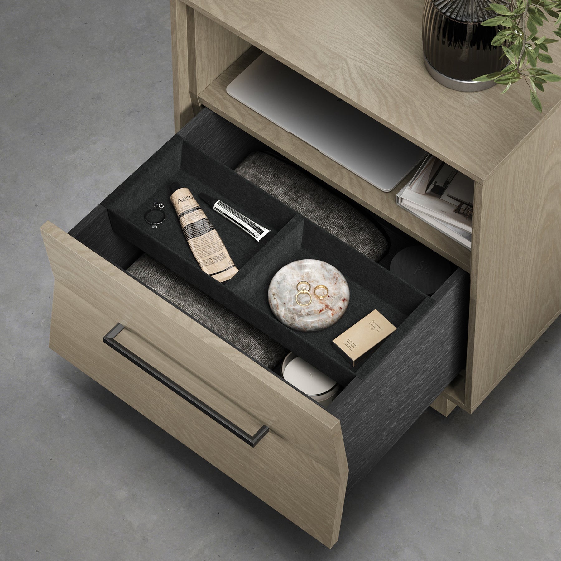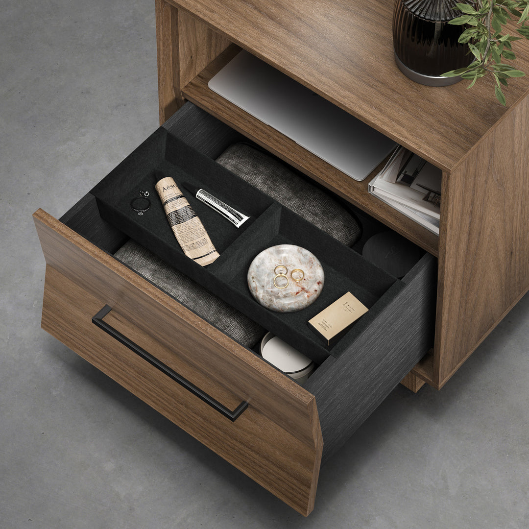 • Velvet-lined tray and soft-close drawer – Thoughtful storage with luxury feel
