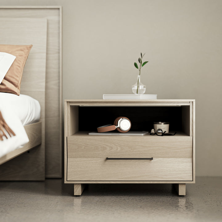 The Kava 9682 Nightstand by BDI blends refined function and modern serenity into one thoughtfully engineered piece. Designed in a Washed Oak finish with a black powder-coated steel drawer pull, this nightstand offers more than just storage—it’s a fully integrated power and organization hub.