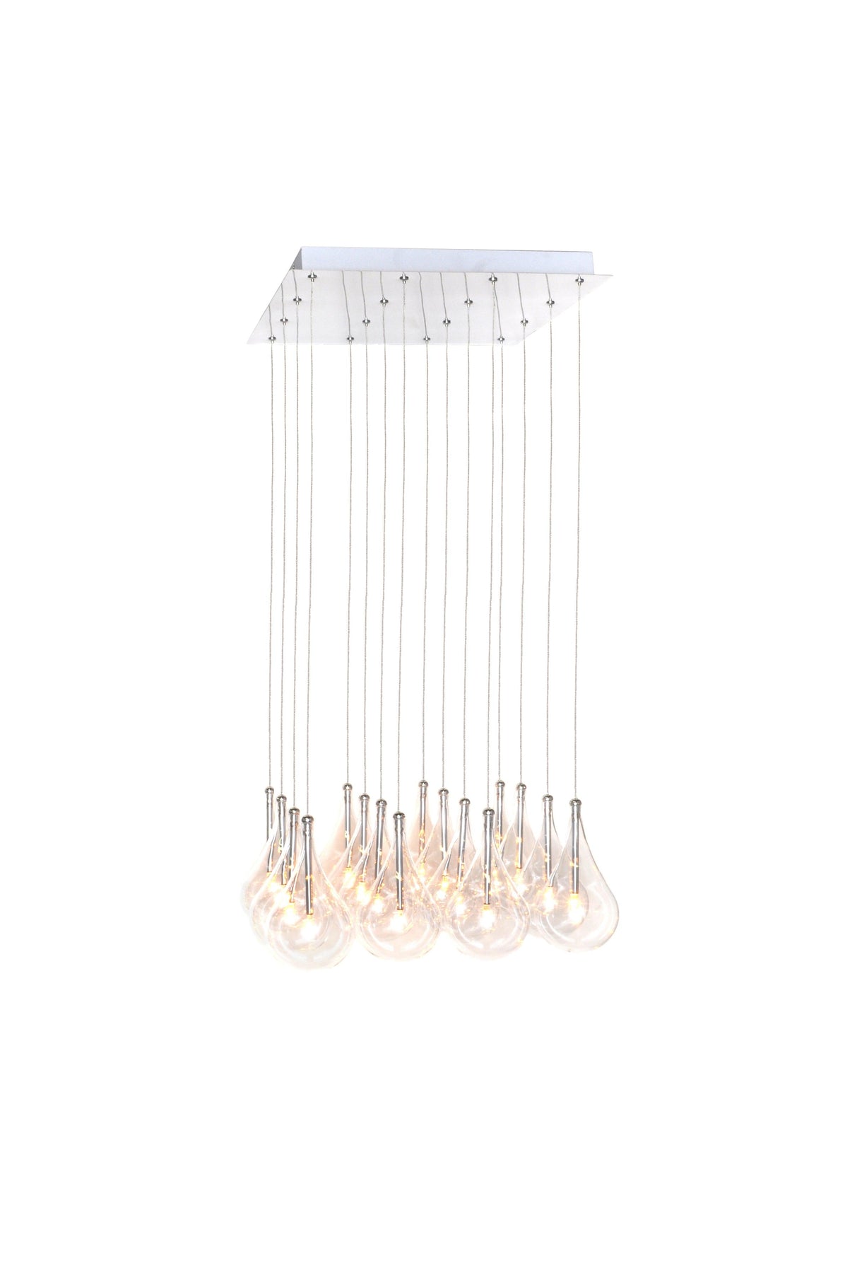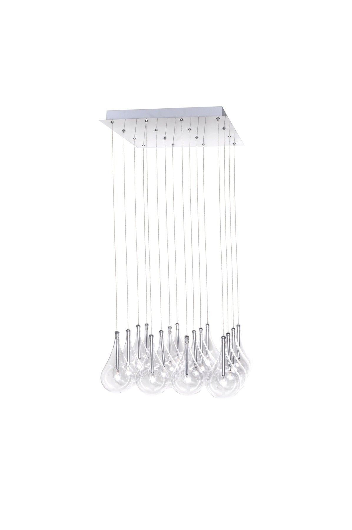 A simple idea gracefully executed in the Larmes collection. Row upon row of Clear oversized teardrops, mounted onto an extended Polished Chrome lamp holder that supports xenon lamps sets the stage. Individually adjustable drops for custom stagger effects allow for a dramatic impact. An added benefit of each drop being aircraft cable-suspended is the ability to adjust the overall height of the piece to fit the space. The final result is stark and stunning.