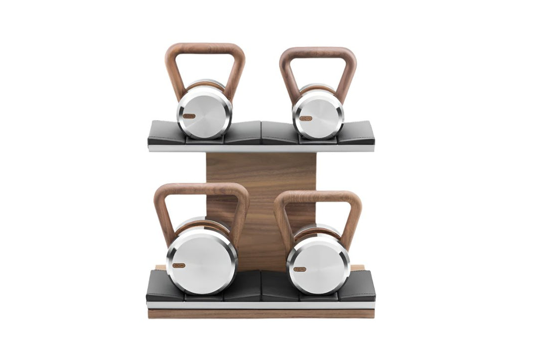 Sleek, contemporary kettlebell set featuring the highest quality stainless steel weights and natural walnut or ash grips. Natural wood base with stainless shelf trim and padded, full-grain leather base pads. Stand dimensions: 24w 16d 17h.