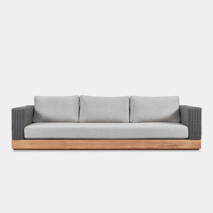 Our Malabar collection mixes all–weather wicker construction with solid teak. The low–profile Malabar 3 Seat Sofa balances clean lines with contemporary comfort — enjoy a plush bench cushion on a concealed Batyline sling suspension for added support, all on a solid teak plinth base. A study in geometry, this handcrafted piece features a series of rectangles and boxes that give the timeless material a modern presence in any smaller outdoor space.