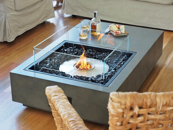 Offering versatility at its finest, choose your preferred fuel from options like Ethanol, Natural Gas, or Liquid Propane. Each table comes adorned with standard decorative glass media that amplifies the allure of its flames. Prioritizing durability, the concrete versions are paired with a protective Winter Bag/Summer Cover, while the teak models are enhanced with a robust glass screen for added safety.