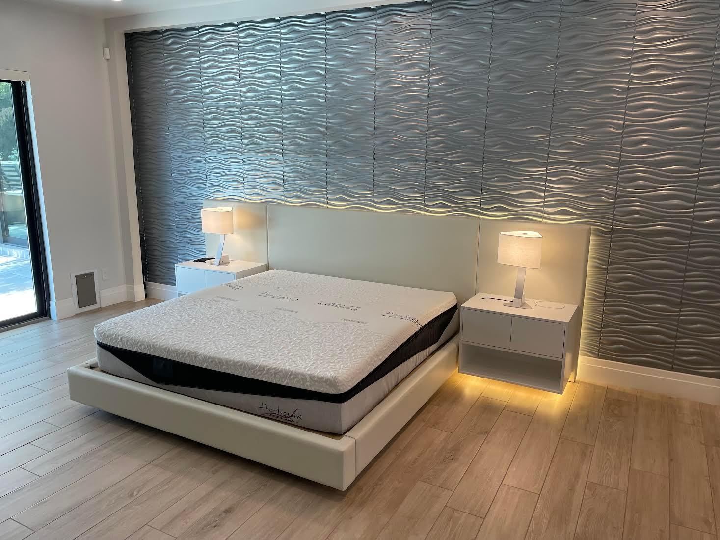 When not in use, your TV is smoothly concealed within the custom headboard, rising and lowering effortlessly at the touch of a button, thanks to a built-in motorized mechanism.