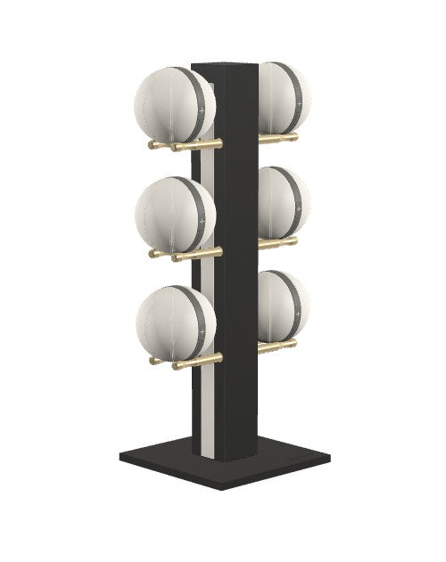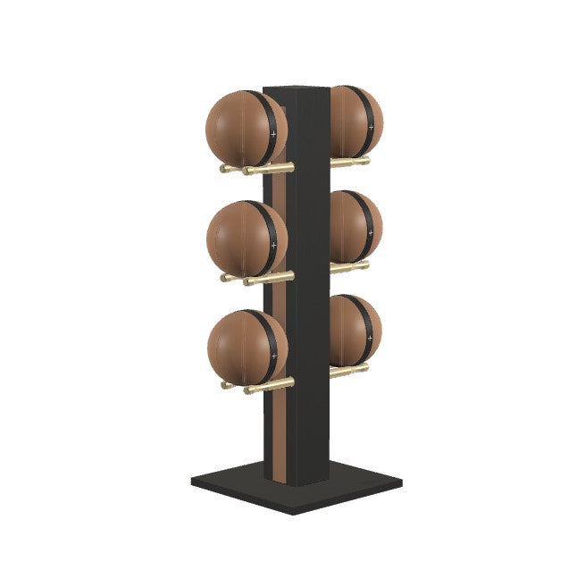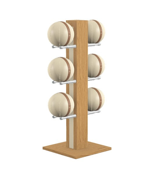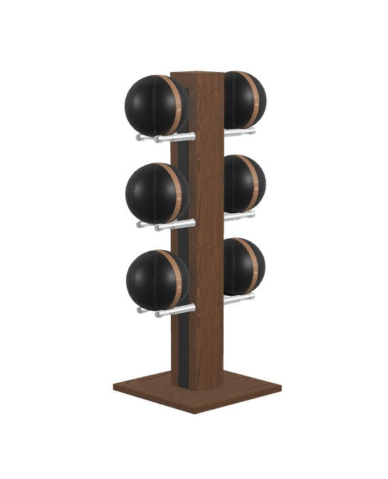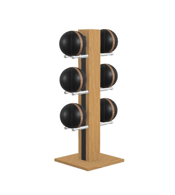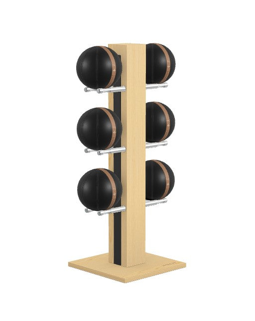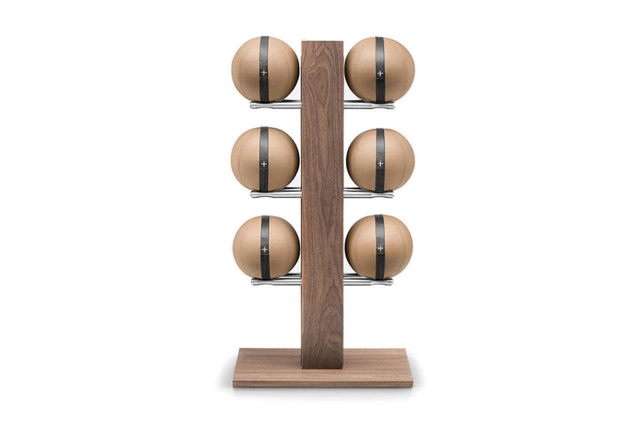 Luxury medicine ball set featuring full grain leather in beige, brown black, grey or white with saddle-stitch seams. Natural wood tower and base with full-grain leather insert. Stand dimensions: 27w 20d 52h. No assembly required.
