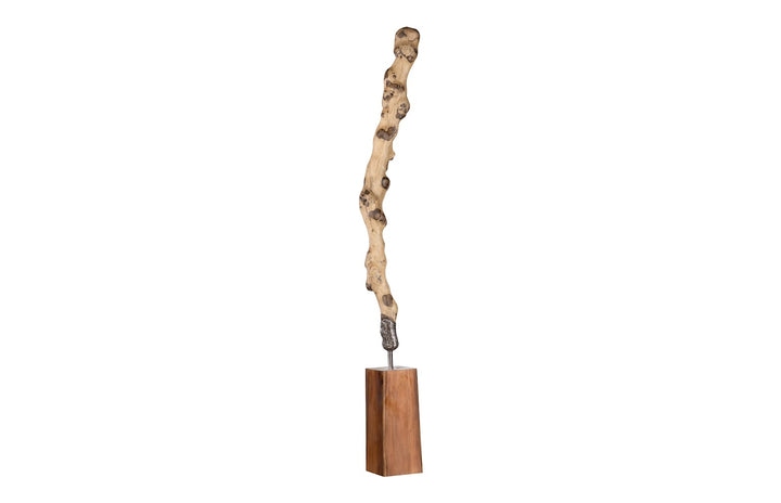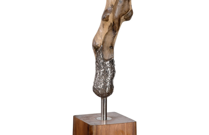 This Sculpture On Wood Base with Stainless Steel by Phillips Collection is an extraordinary fusion of natural wood and sleek stainless steel, making it a stunning and sophisticated work of art. The towering height and clean, modern lines make this sculpture a breathtaking centerpiece for any space. Perfect for creating a bold visual impact, this piece is a testament to modern organic design, blending natural elements with contemporary materials.