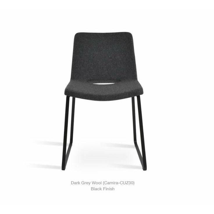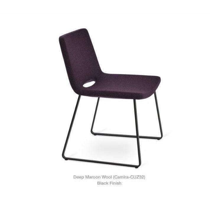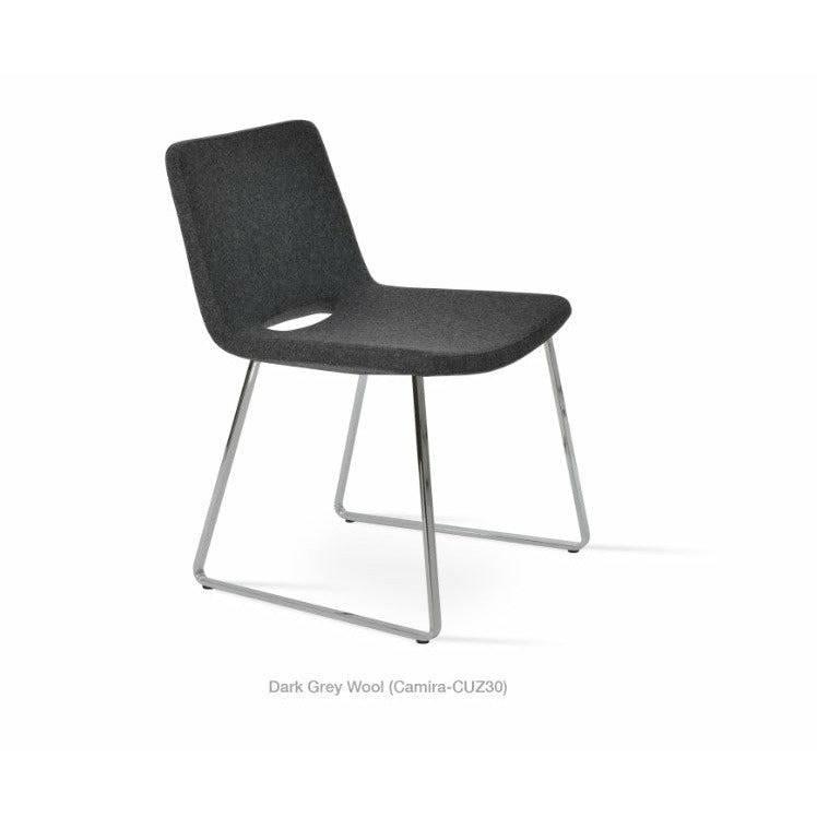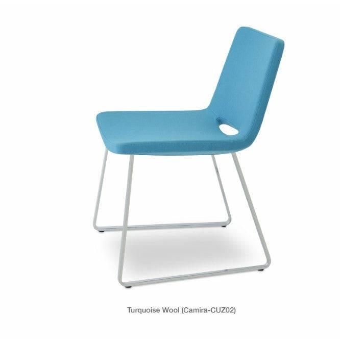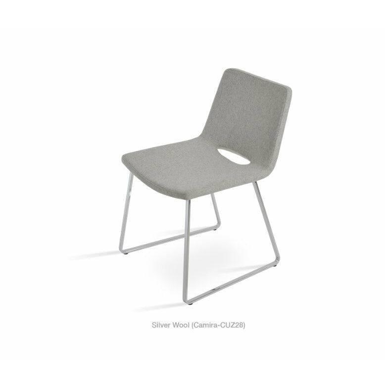 Nevada Sled is a modern dining chair with a comfortable upholstered seat and backrest on sled steel legs which are plastic tipped with plastic caps embedded inside the base. The seat has a steel structure with “S” shape springs for extra flexibility and strength. This steel frame is molded by injecting polyurethane foam. Nevada seat is upholstered with a removable zipper enclosed leather, PPM, or wool fabric slipcover. The chair is suitable for both residential and commercial use.