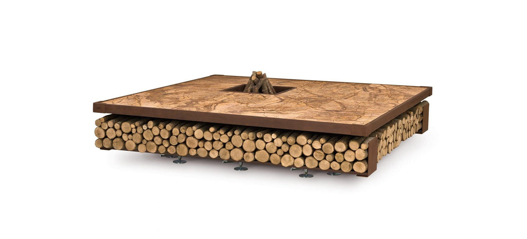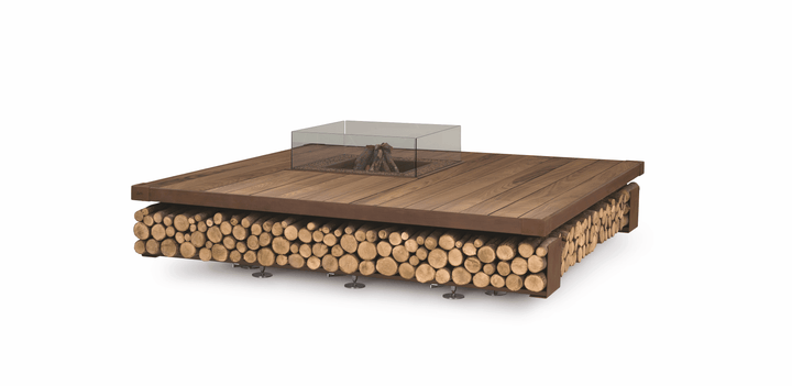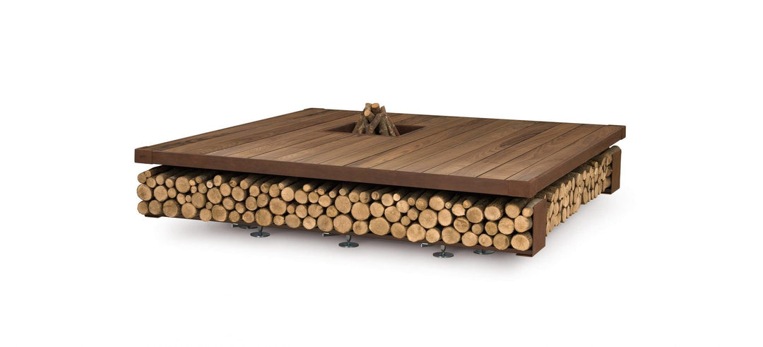 Experience the elegant fusion of history and contemporary design with the Opera Fire Pit by AK47 Design. This exquisite fire pit combines aged chestnut wood with a robust steel structure, creating an atmospheric centerpiece for any outdoor space. The steel components feature a rustic oxidized finish, expertly treated to resist corrosion over time, while the seating surface is made from antique chestnut wood. This wood is carefully restored using a combination of dry heat and steam, preserving its natural beauty without the use of chemicals.