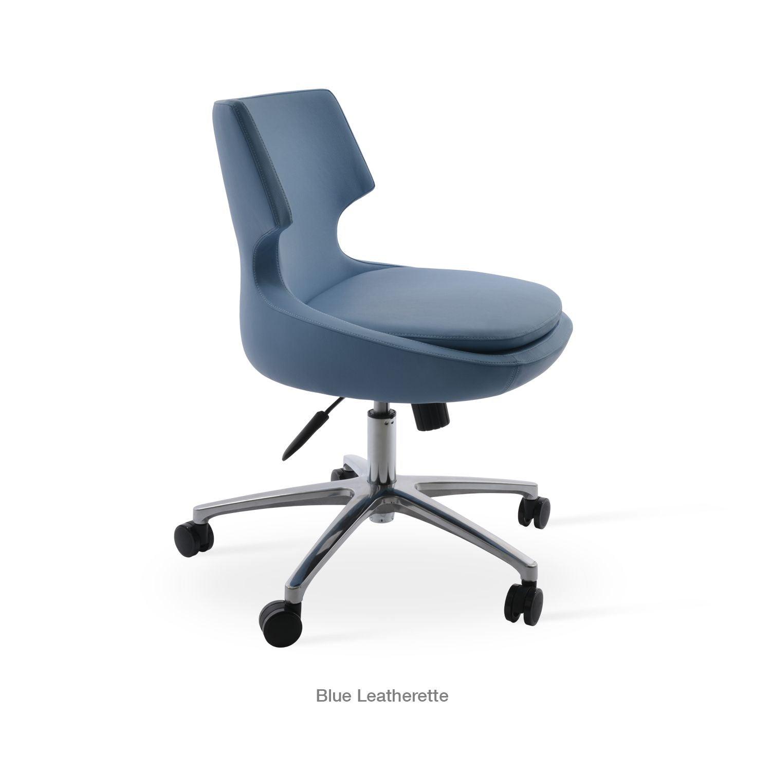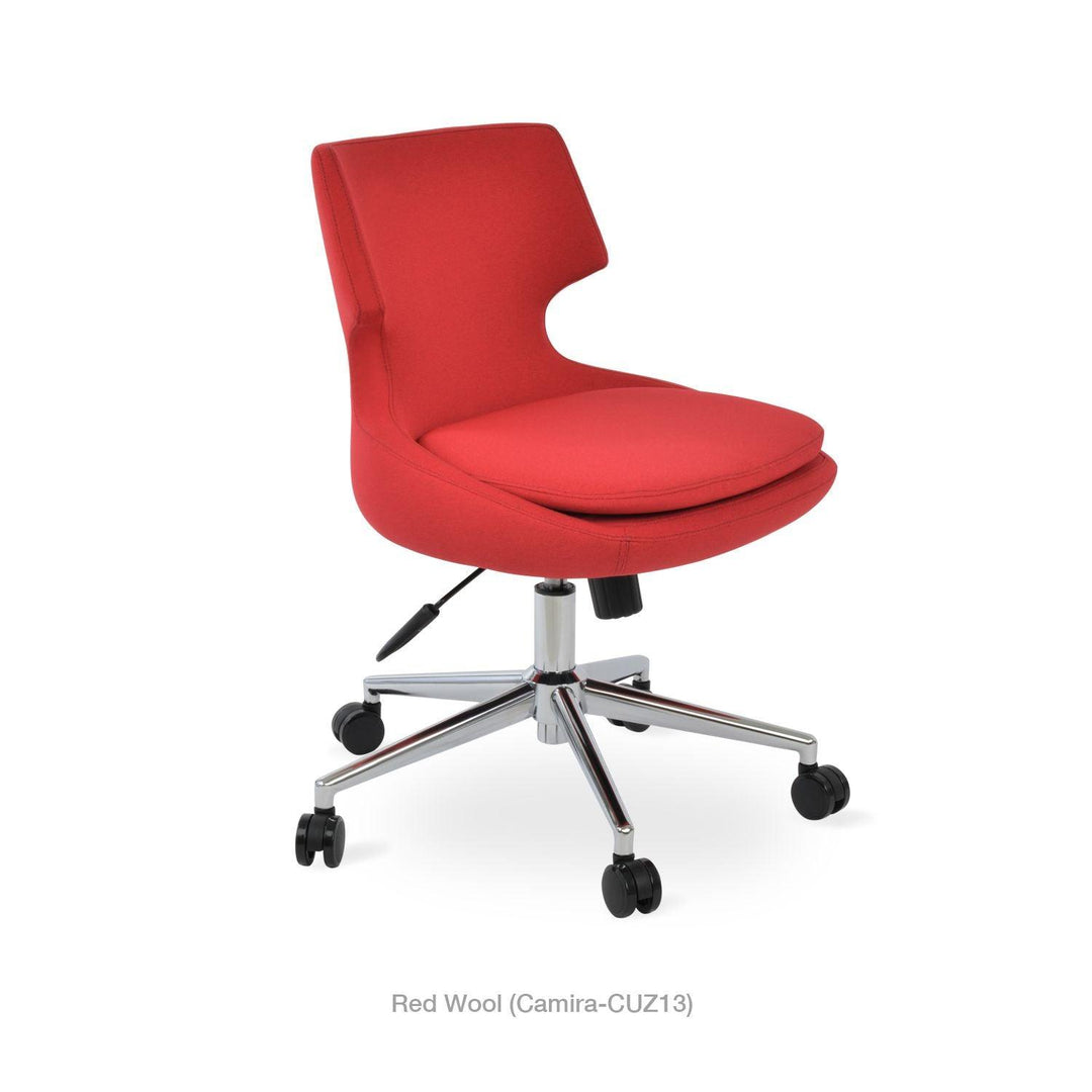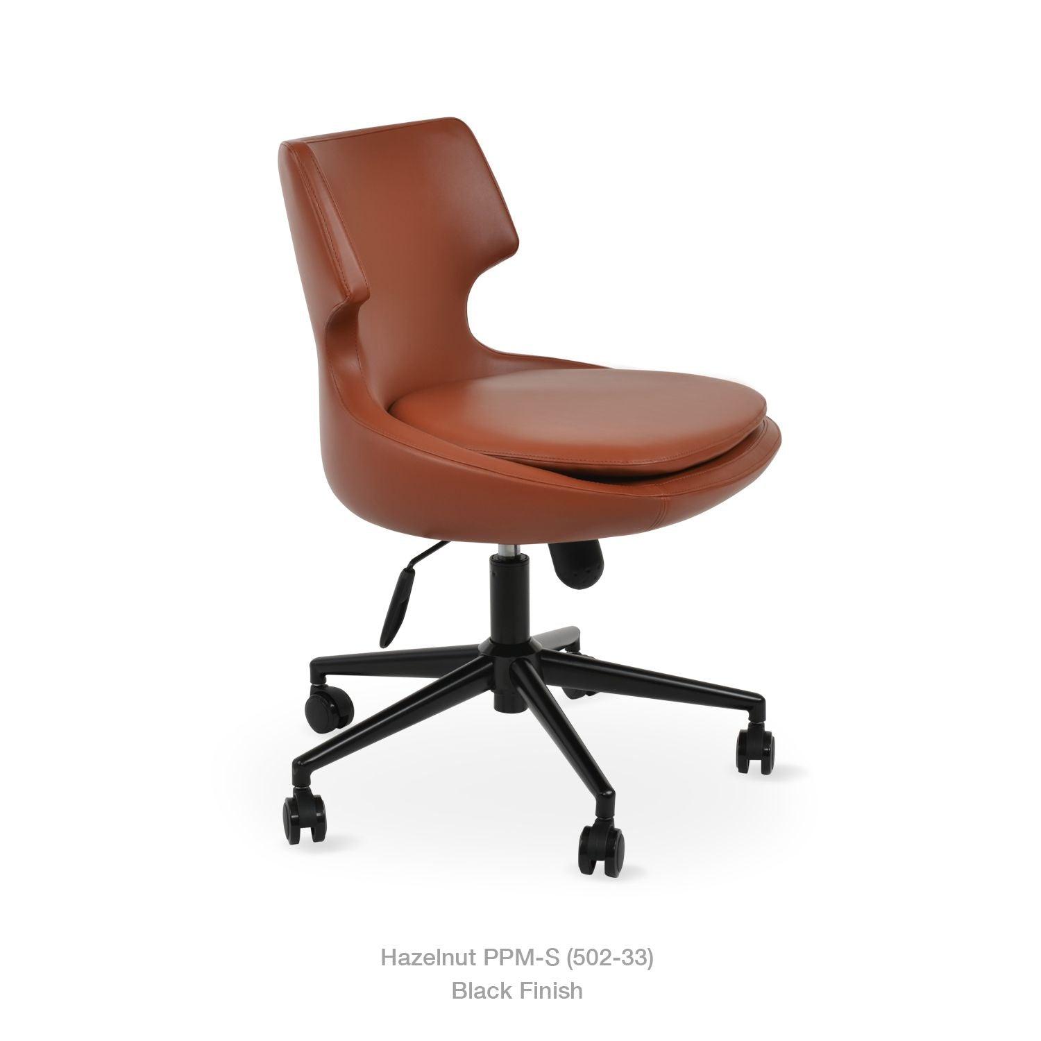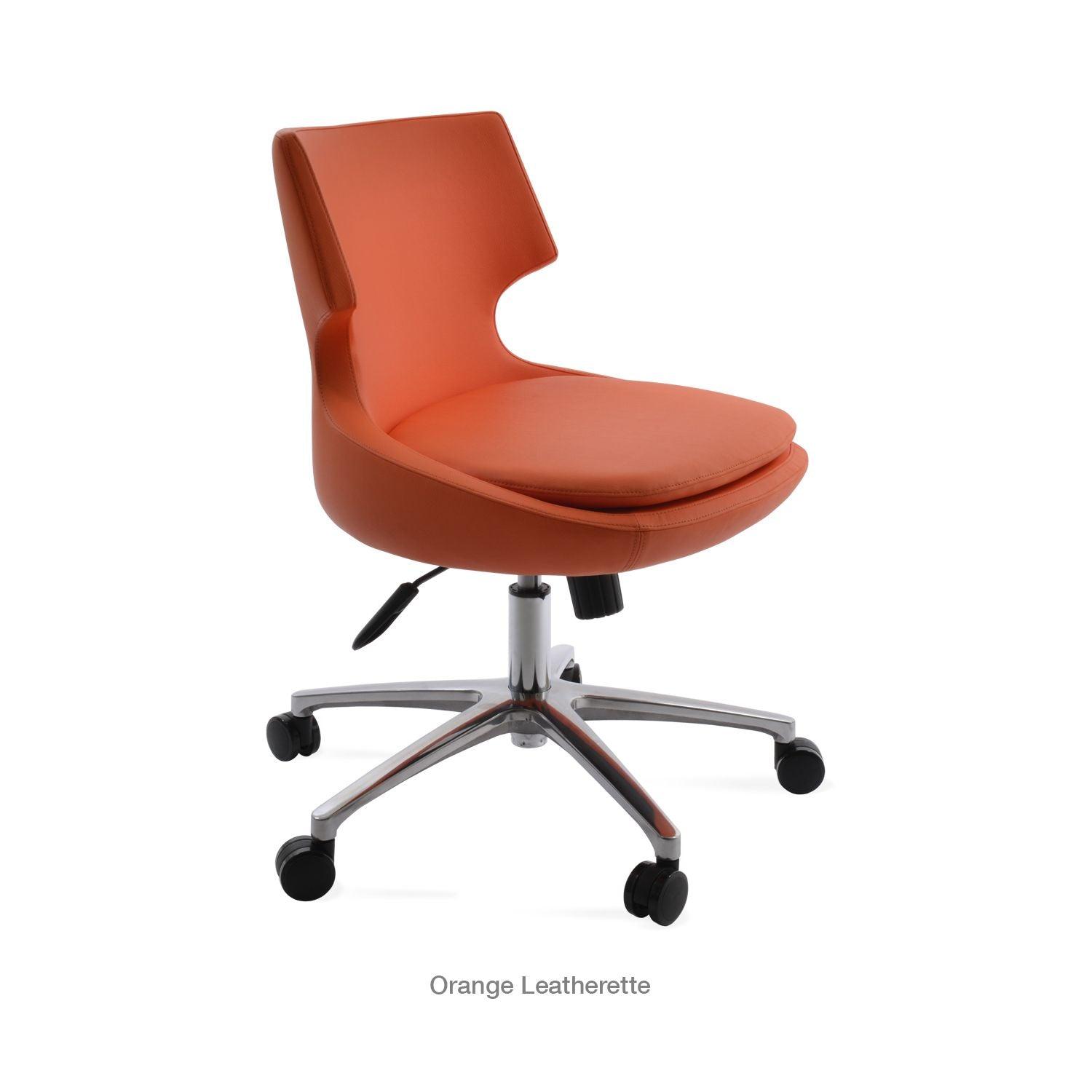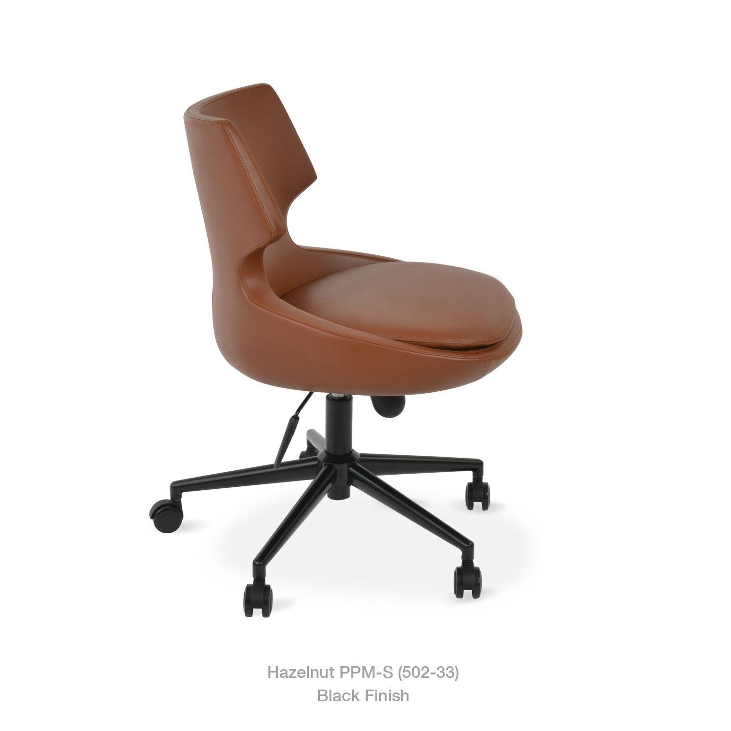The Patara office is a distinctive chair with a comfortable upholstered seat and backrest on a height-adjustable gas piston base that swivels and tilts. The chair has a chromed steel five-star base with plastic casters. The seat has a steel structure with “S” shape springs for extra flexibility and strength. This steel frame is molded by injecting polyurethane foam. Patara seat is upholstered with removable zipper-enclosed leather, leatherette, or wool fabric slipcover. The chair is suitable for both residential and commercial use.