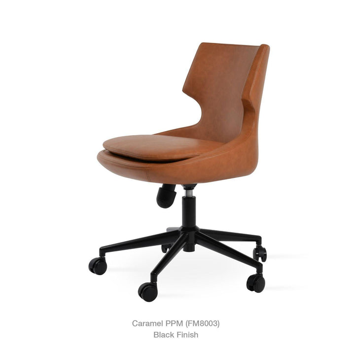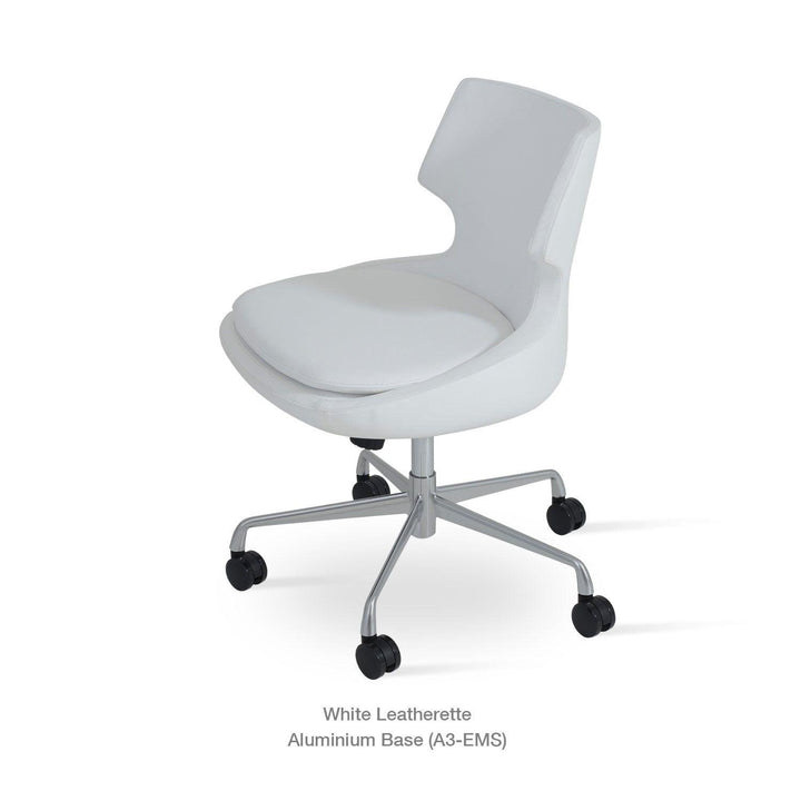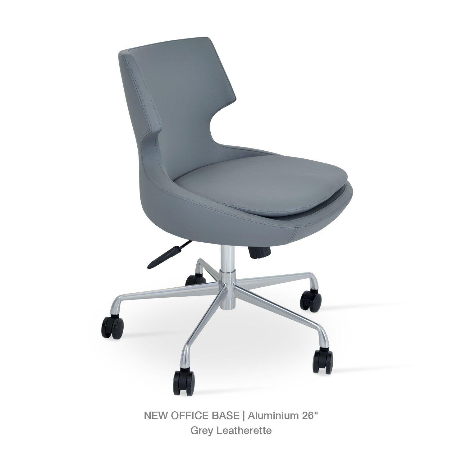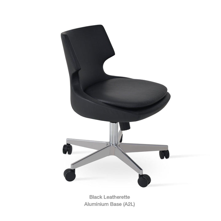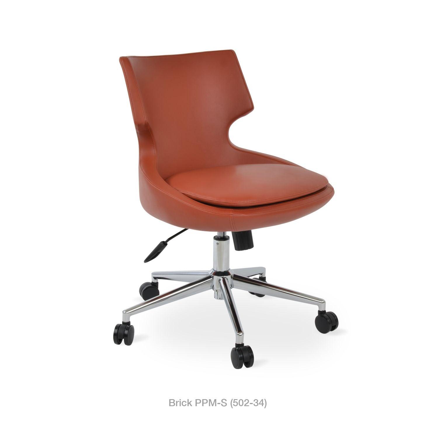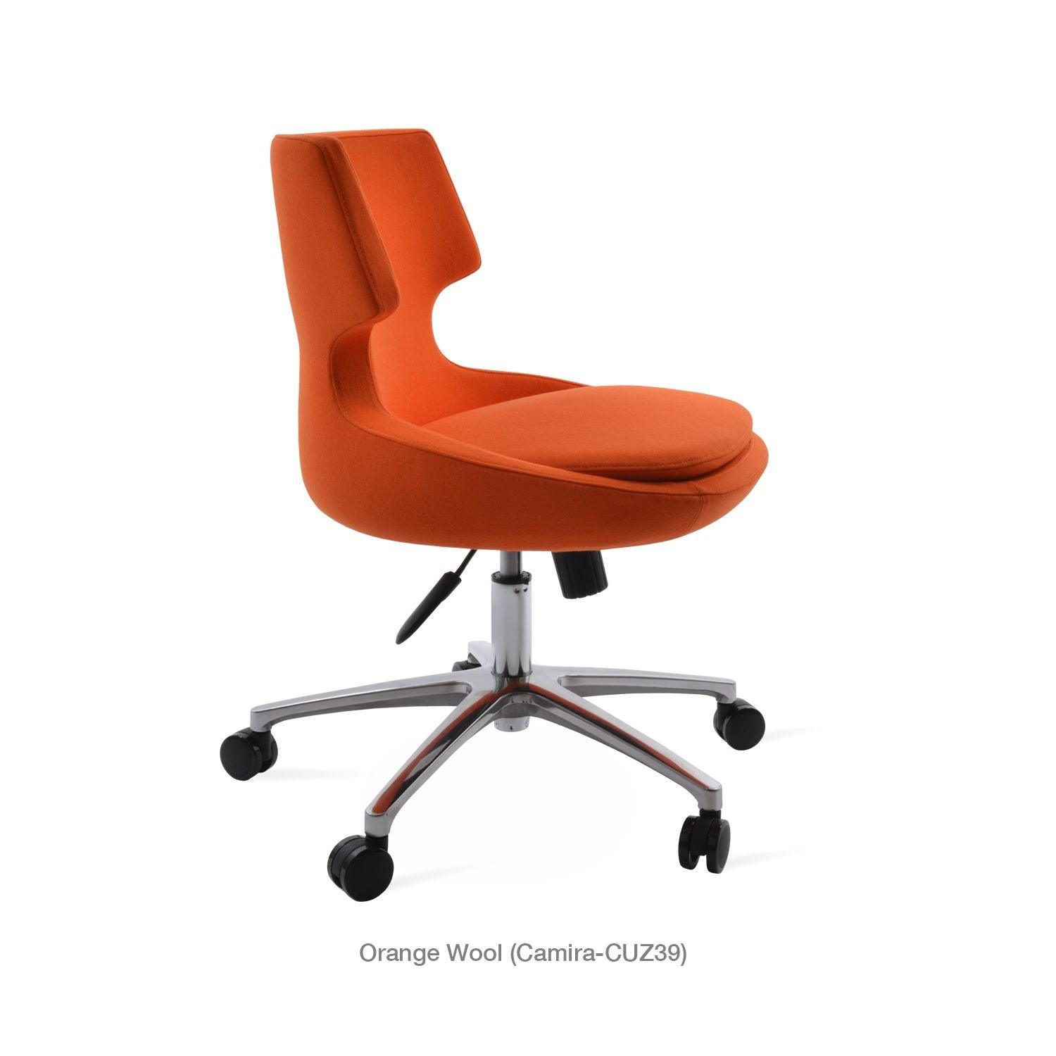The Patara office is a distinctive chair with a comfortable upholstered seat and backrest on a height-adjustable gas piston base that swivels and tilts. The chair has a chromed steel five-star base with plastic casters. The seat has a steel structure with “S” shape springs for extra flexibility and strength. This steel frame is molded by injecting polyurethane foam. Patara seat is upholstered with removable zipper-enclosed leather, leatherette, or wool fabric slipcover. The chair is suitable for both residential and commercial use.
