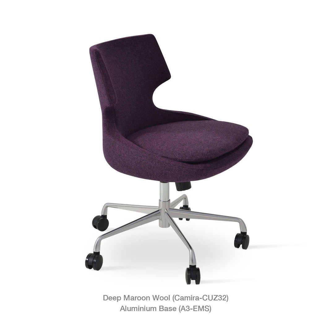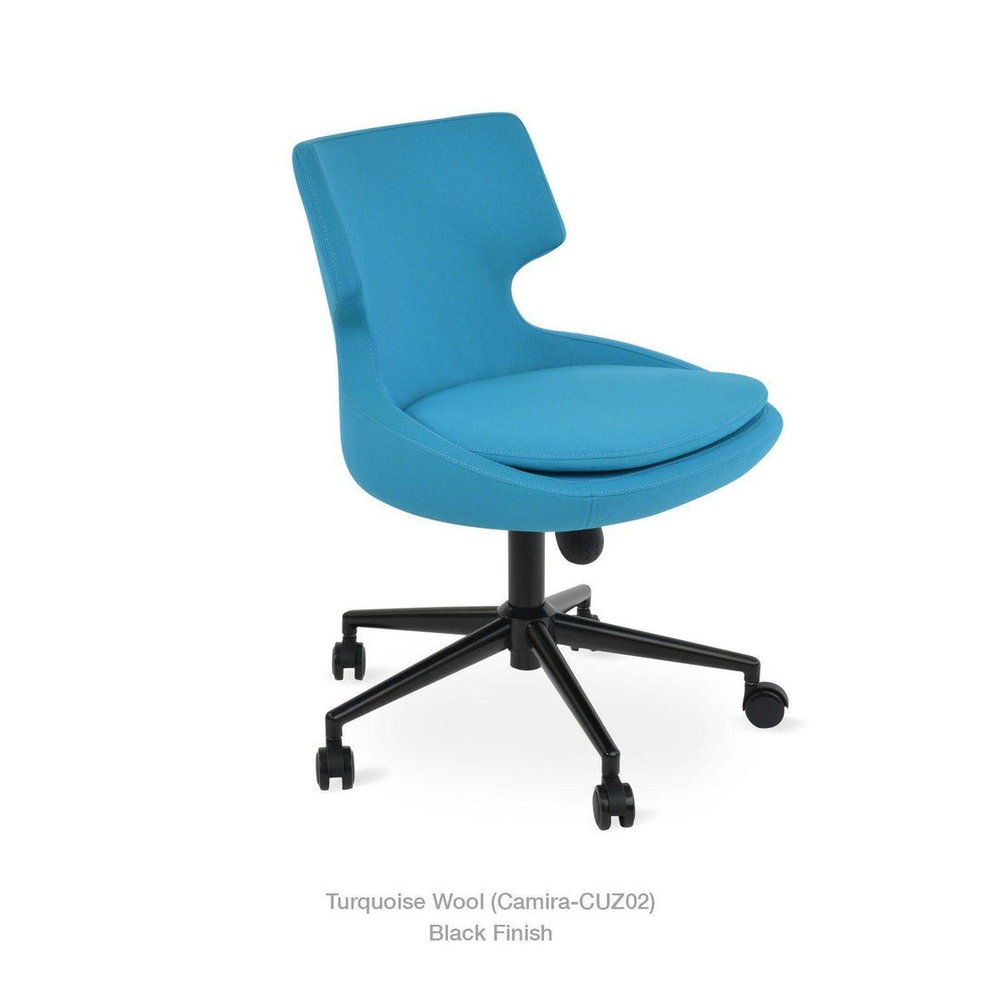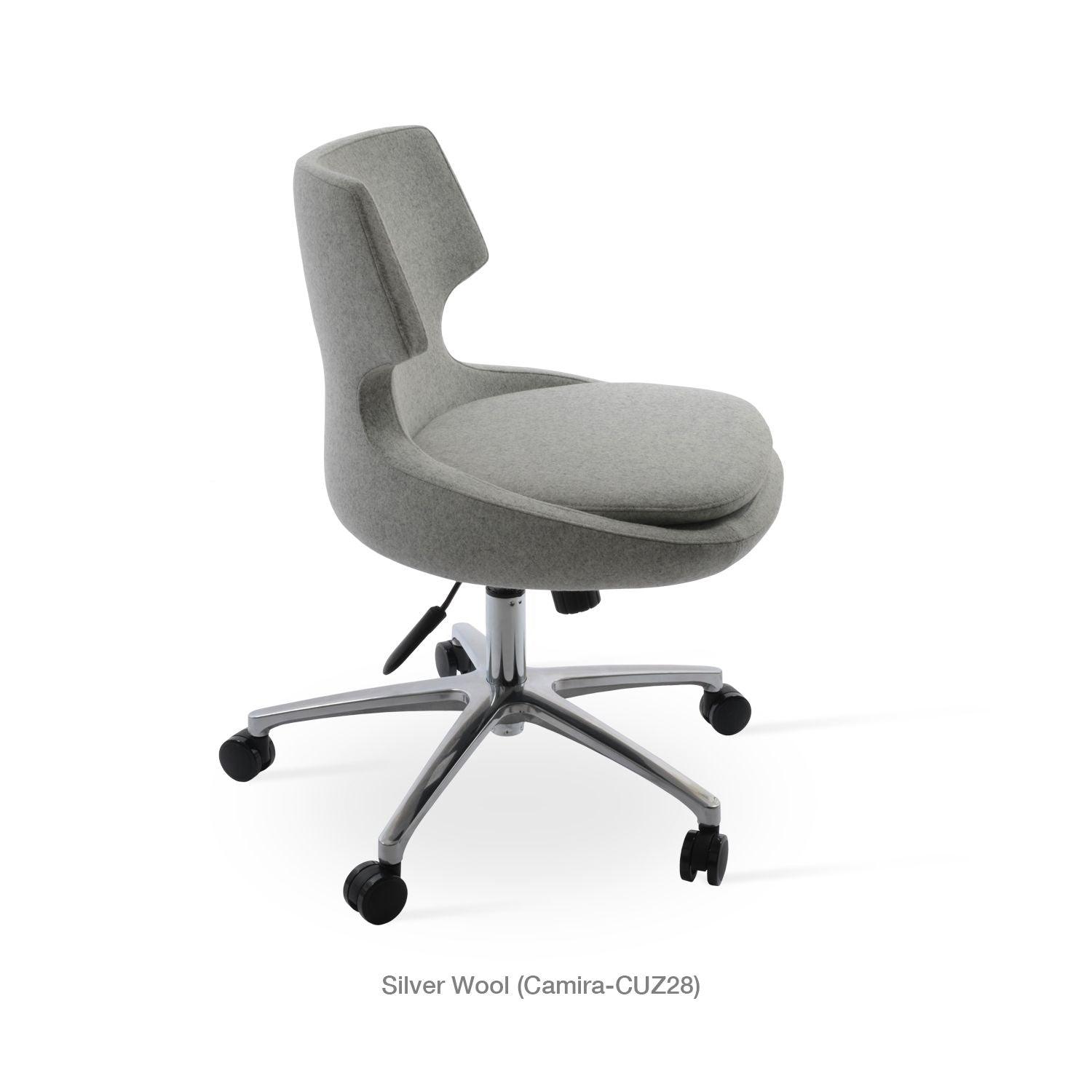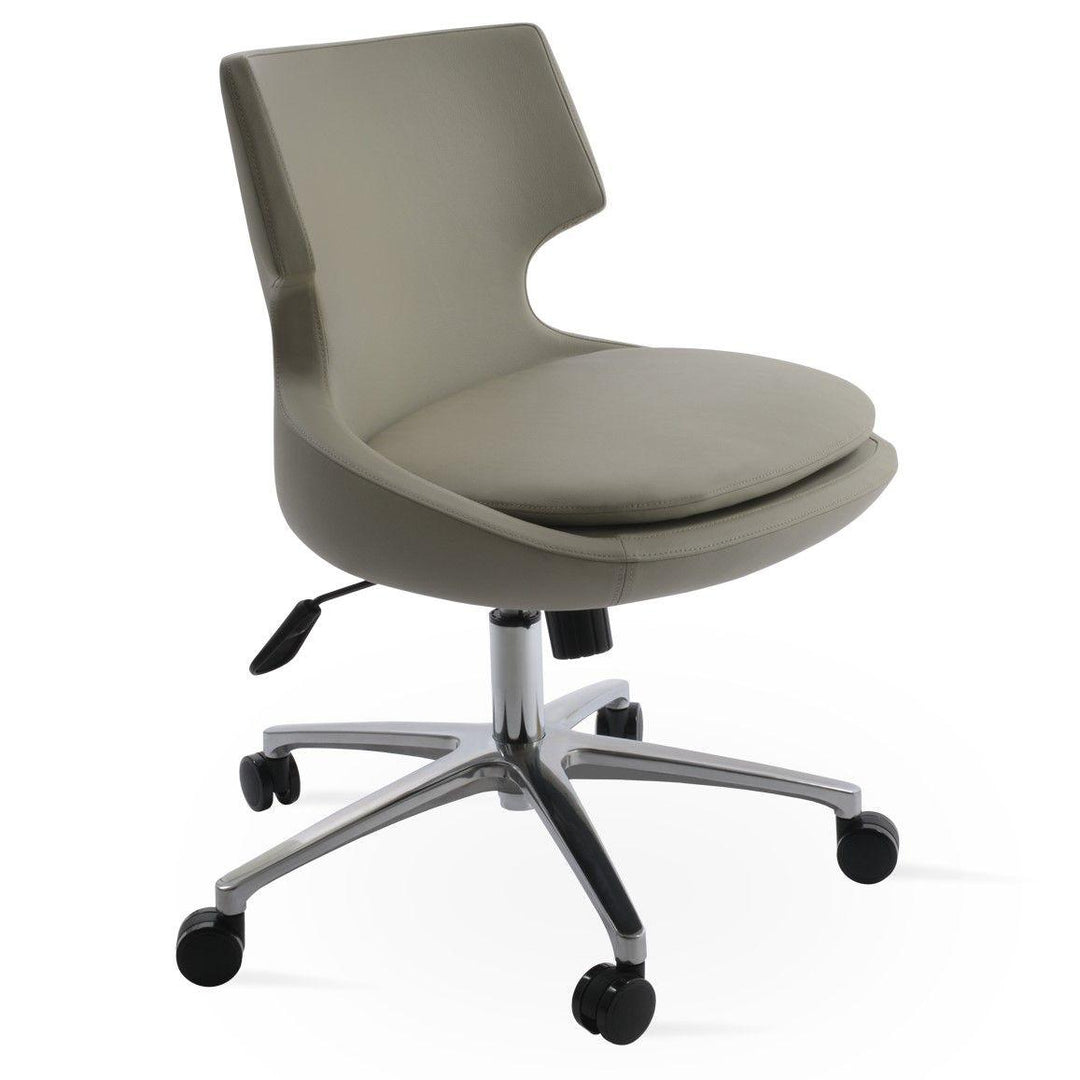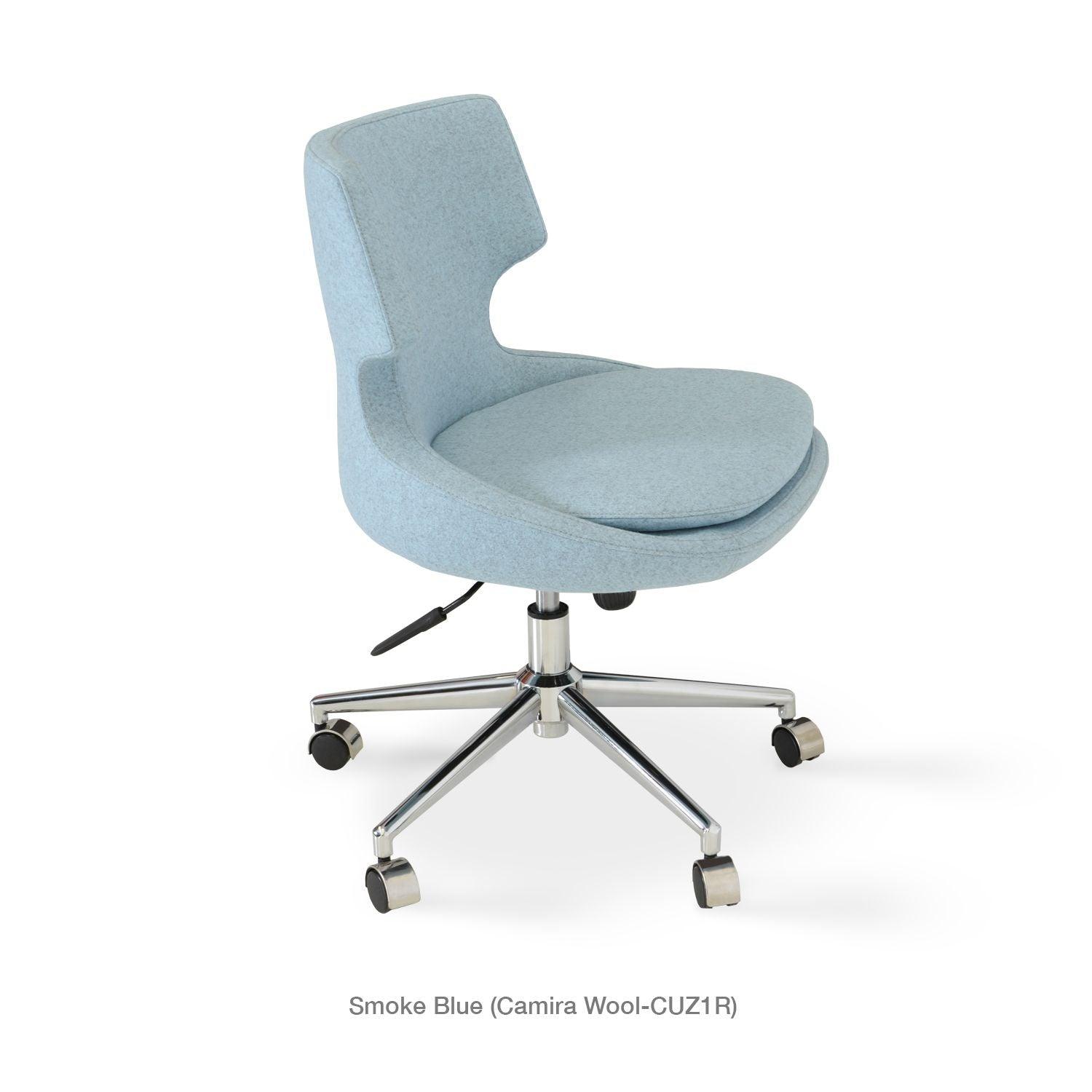 The Patara office is a distinctive chair with a comfortable upholstered seat and backrest on a height-adjustable gas piston base that swivels and tilts. The chair has a chromed steel five-star base with plastic casters. The seat has a steel structure with “S” shape springs for extra flexibility and strength. This steel frame is molded by injecting polyurethane foam. Patara seat is upholstered with removable zipper-enclosed leather, leatherette, or wool fabric slipcover. The chair is suitable for both residential and commercial use.