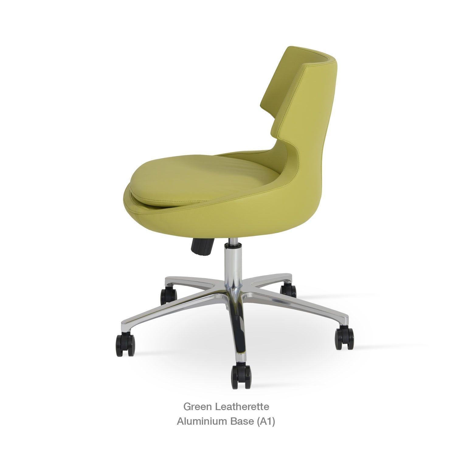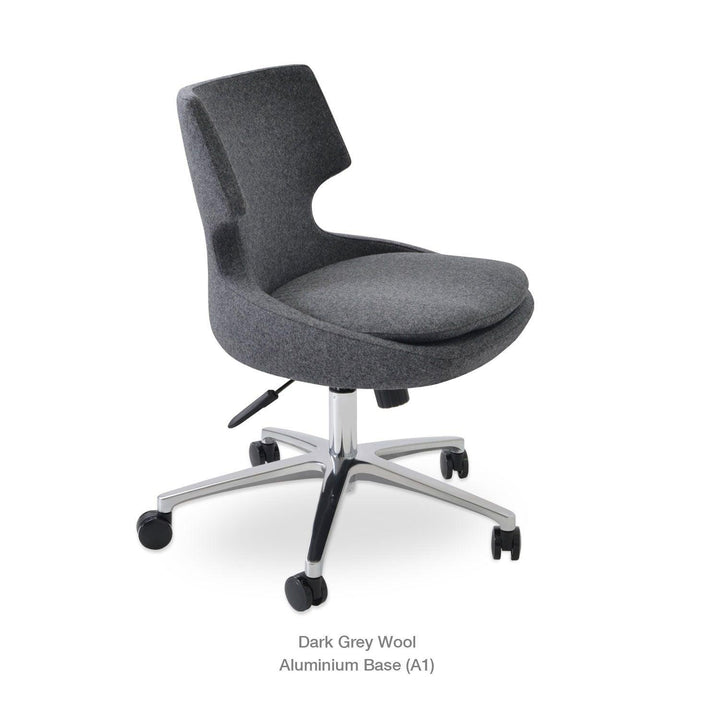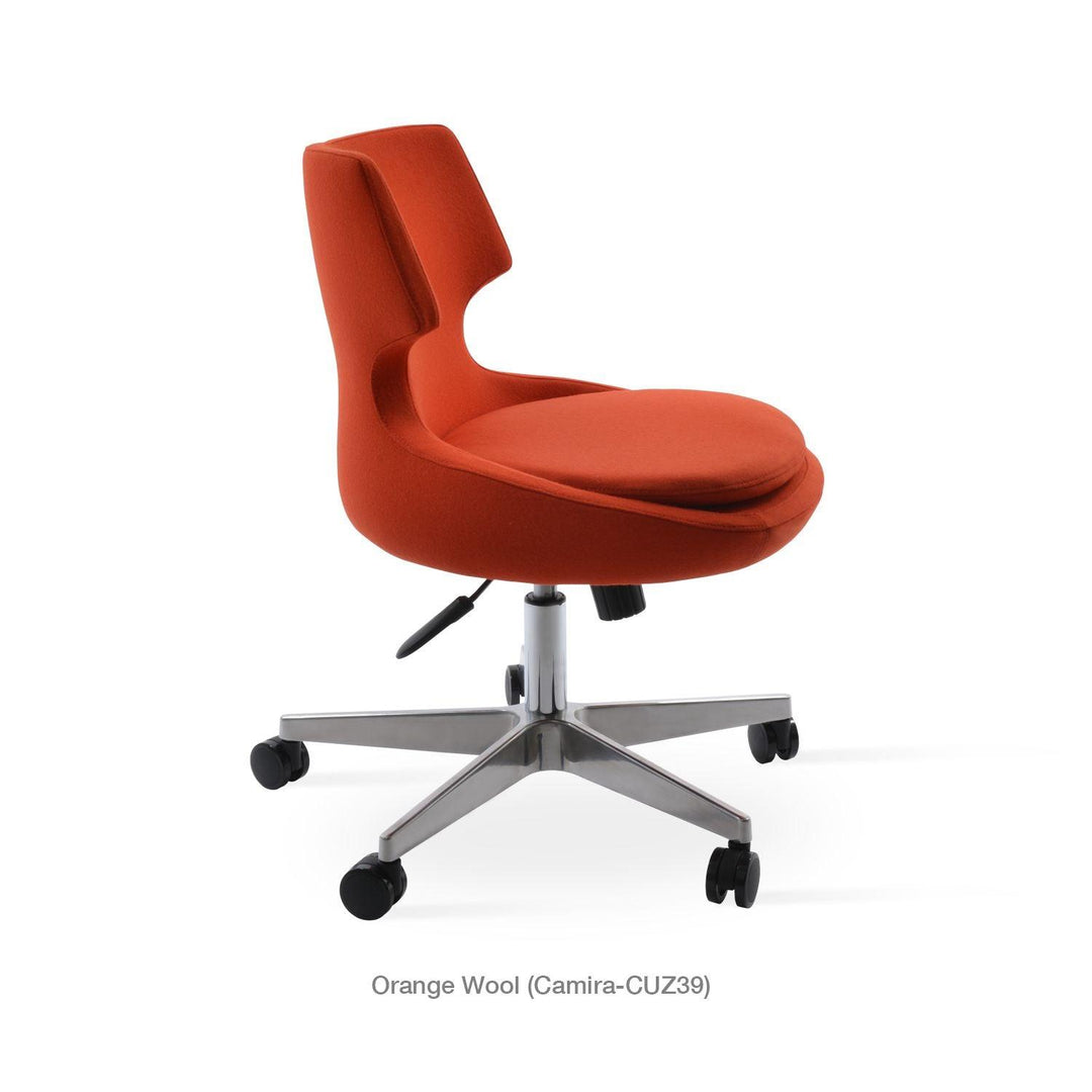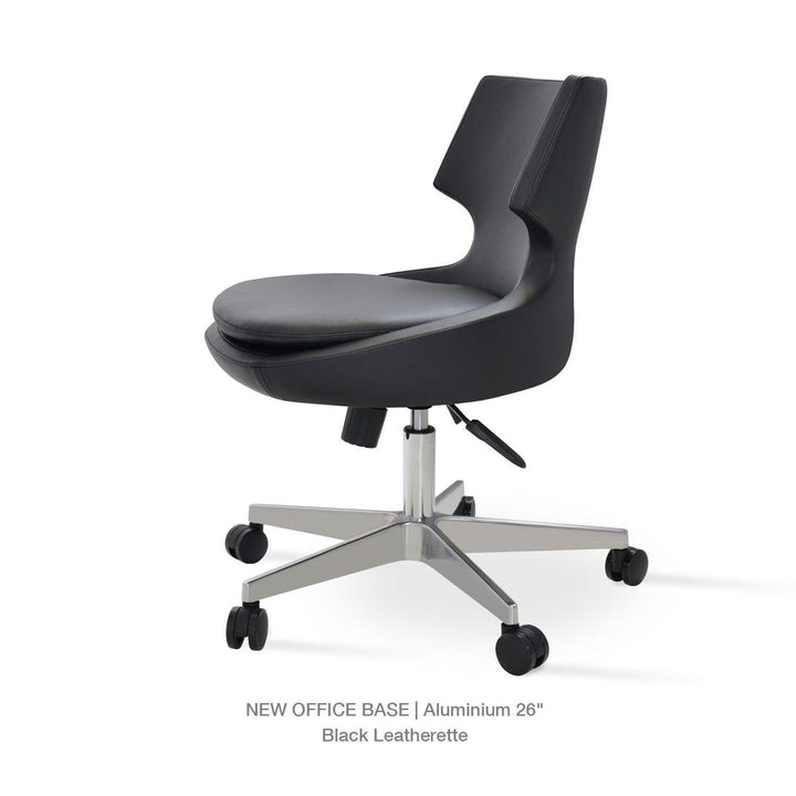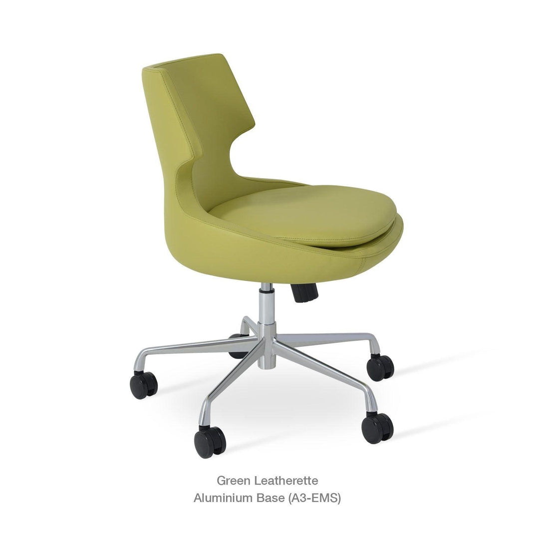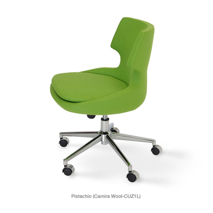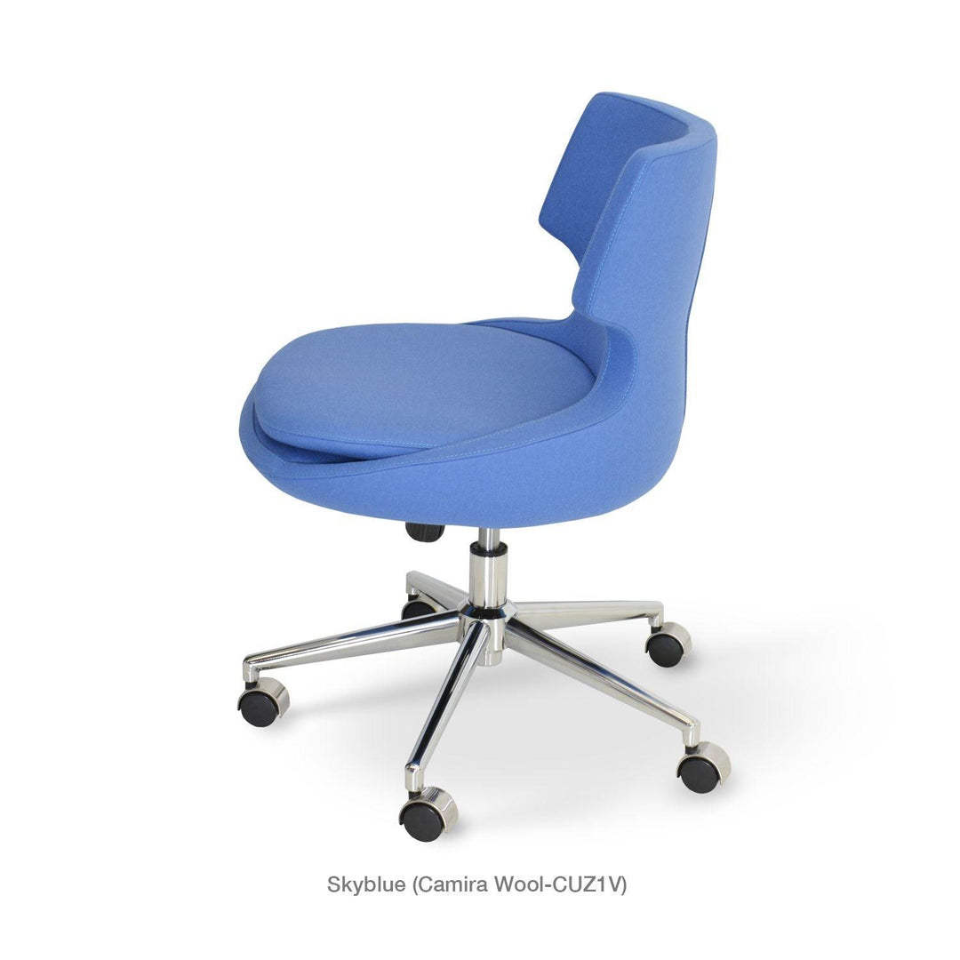 The Patara office is a distinctive chair with a comfortable upholstered seat and backrest on a height-adjustable gas piston base that swivels and tilts. The chair has a chromed steel five-star base with plastic casters. The seat has a steel structure with “S” shape springs for extra flexibility and strength. This steel frame is molded by injecting polyurethane foam. Patara seat is upholstered with removable zipper-enclosed leather, leatherette, or wool fabric slipcover. The chair is suitable for both residential and commercial use.